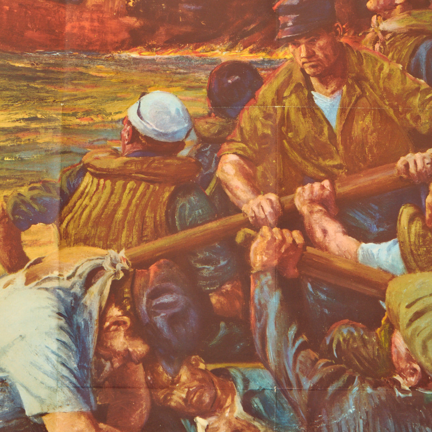 Anton Otto Fischer was a native of Germany and an illustrator for the Saturday Evening Post. His seascapes attracted the attention of Russell Waesche, the Commandant of the Coast Guard, who credited Fischer with helping WWII recruitment efforts and immediately enlisted him as a lieutenant commander. Fischer created this poster showing wounded sailors rowing away from a burning, sinking merchant ship to emphasize the importance of maintaining secrecy.