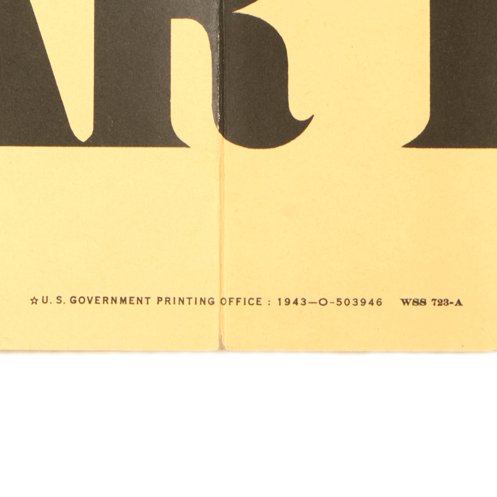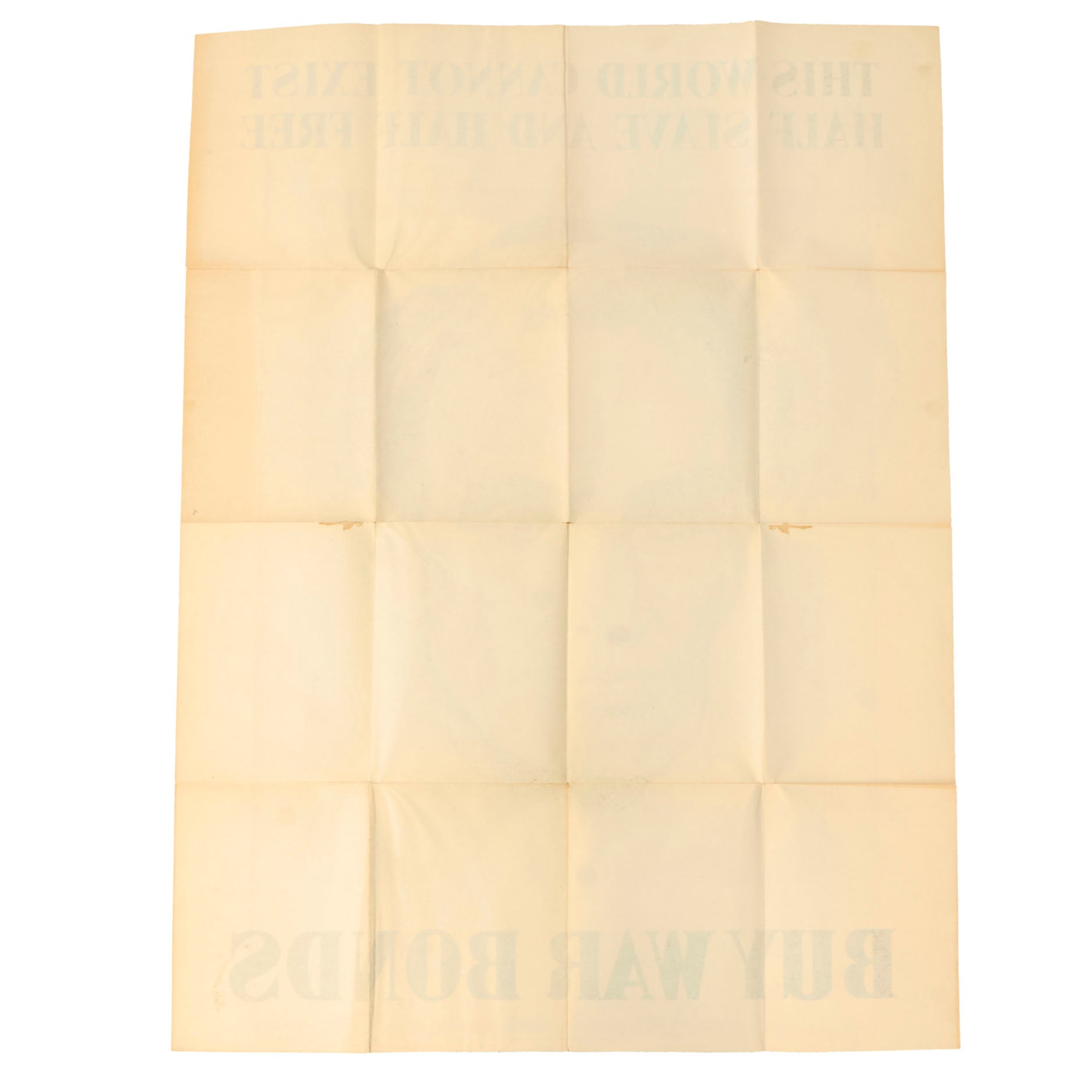 This vintage original WWII propaganda poster was issued in 1943 to promote the sale of war bonds. This poster features a large portrait of Abraham Lincoln’s and quotes the most famous line from his 1858 “House Divided” speech – This World Cannot Exist Half Slave And Half Free. Measures 28" x22” and dated “U.S. Government Printing Office - 1943” along the bottom of the poster.