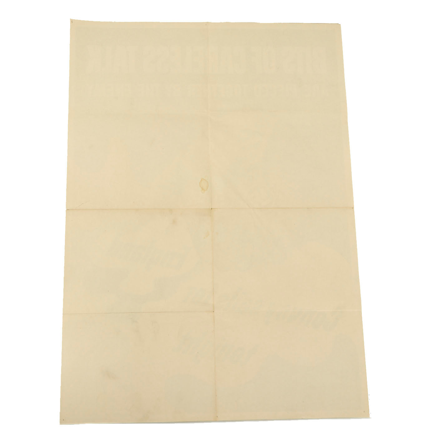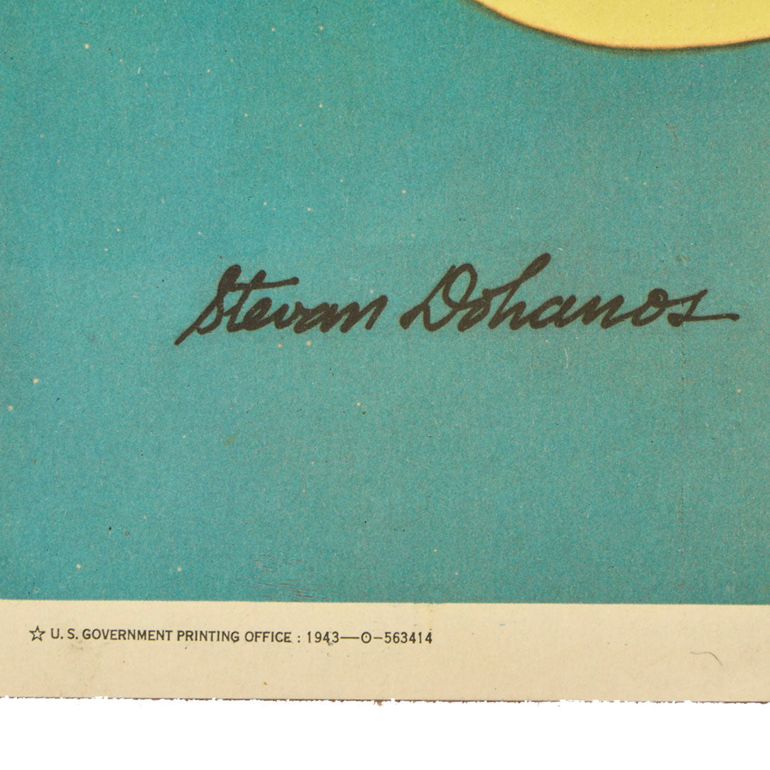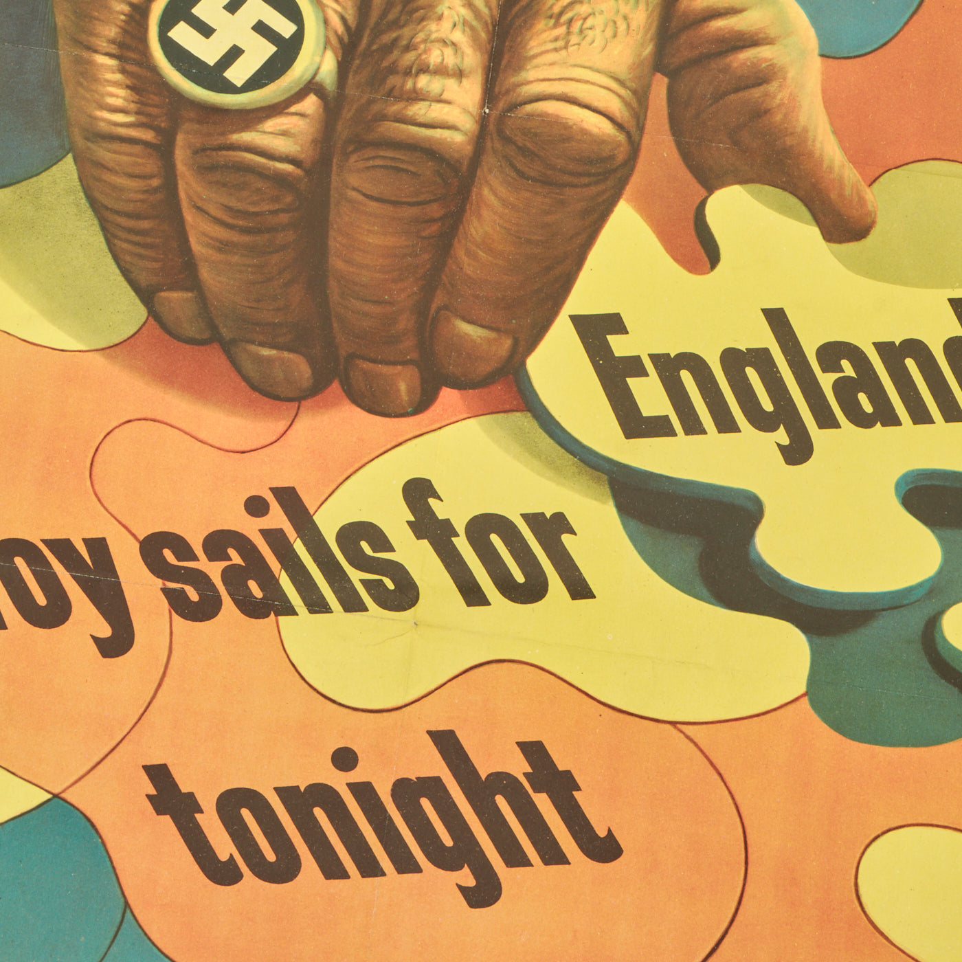 Only One Available. This U.S. WWII Office of War Information Poster is in great condition. The poster shows a hand from a German officer wearing a Swas ring putting a puzzle together that shows that the last piece of the puzzle was England. This poster was designed by Steven Dohanos. He was an well-known artist and illustrator responsible for several of the Don’t Talk set of propaganda posters in the second world war.