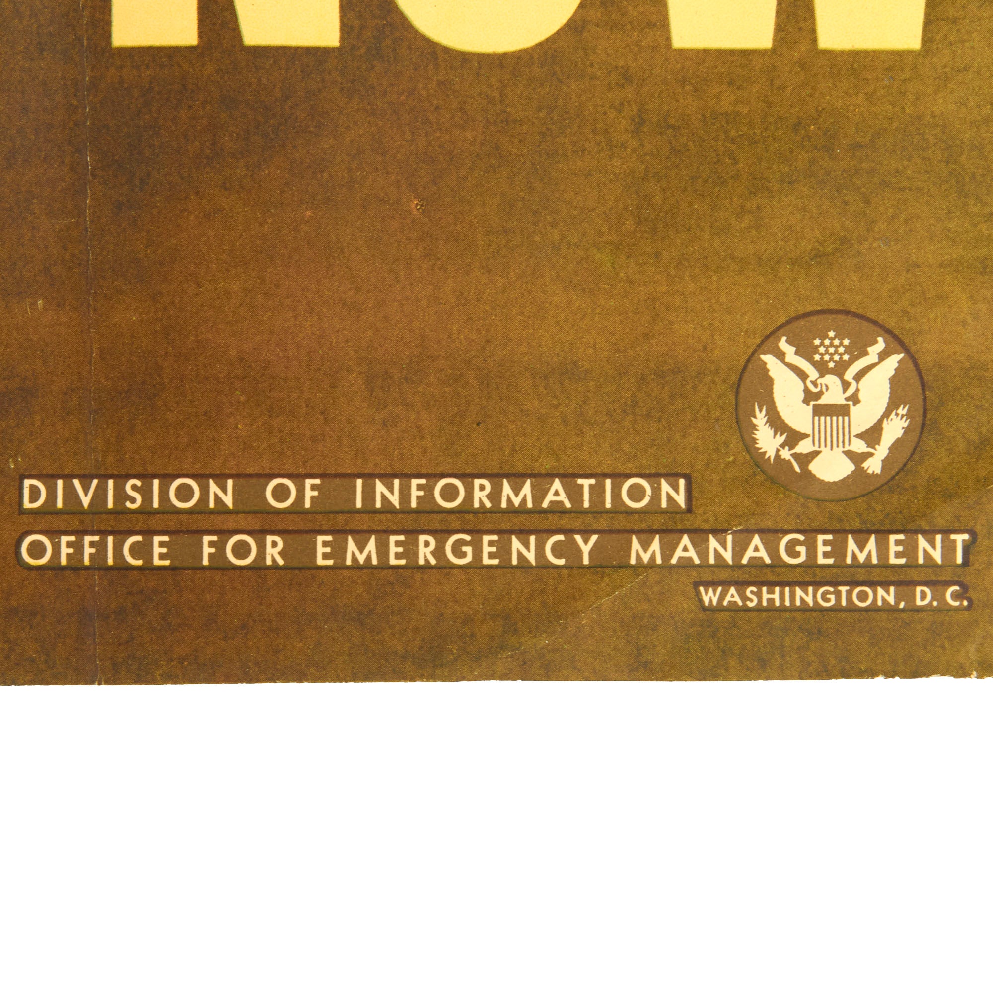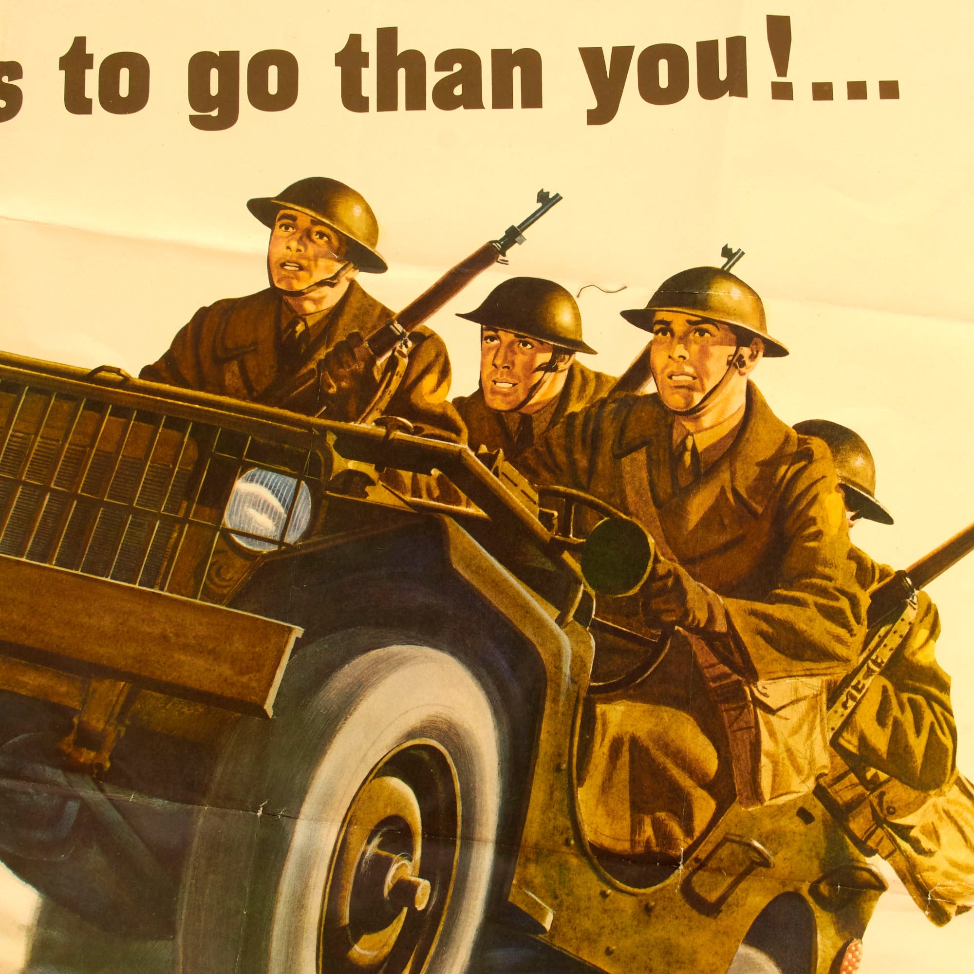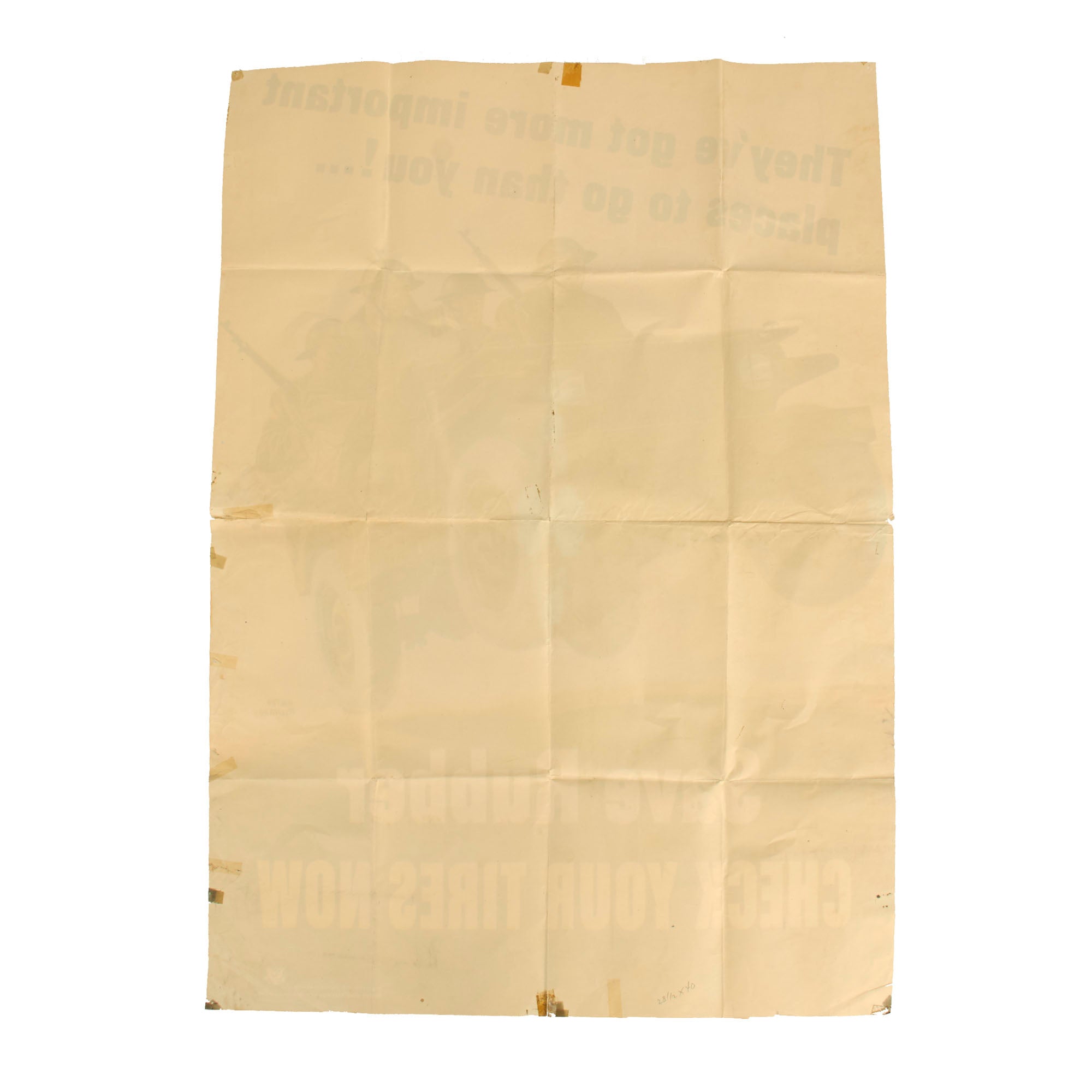 Original Item: Only One Available. This is an excellent condition vintage World War Two US propaganda poster that reads: They've got more important places to go than you! Save Rubber, Check Your Tires Now. Published by the Division of Information for The Office For Emergency Management to encourage Americans to conserve resources, featuring a fantastic period illustration by Walter Richards. This is a rare version in the large size format of 27 ½” x 38 ½”. Because it features a WWII Jeep, original examples rarely come to the market. Has original fold lines and retains color vibrancy well. Nicely marked on the bottom edge:
