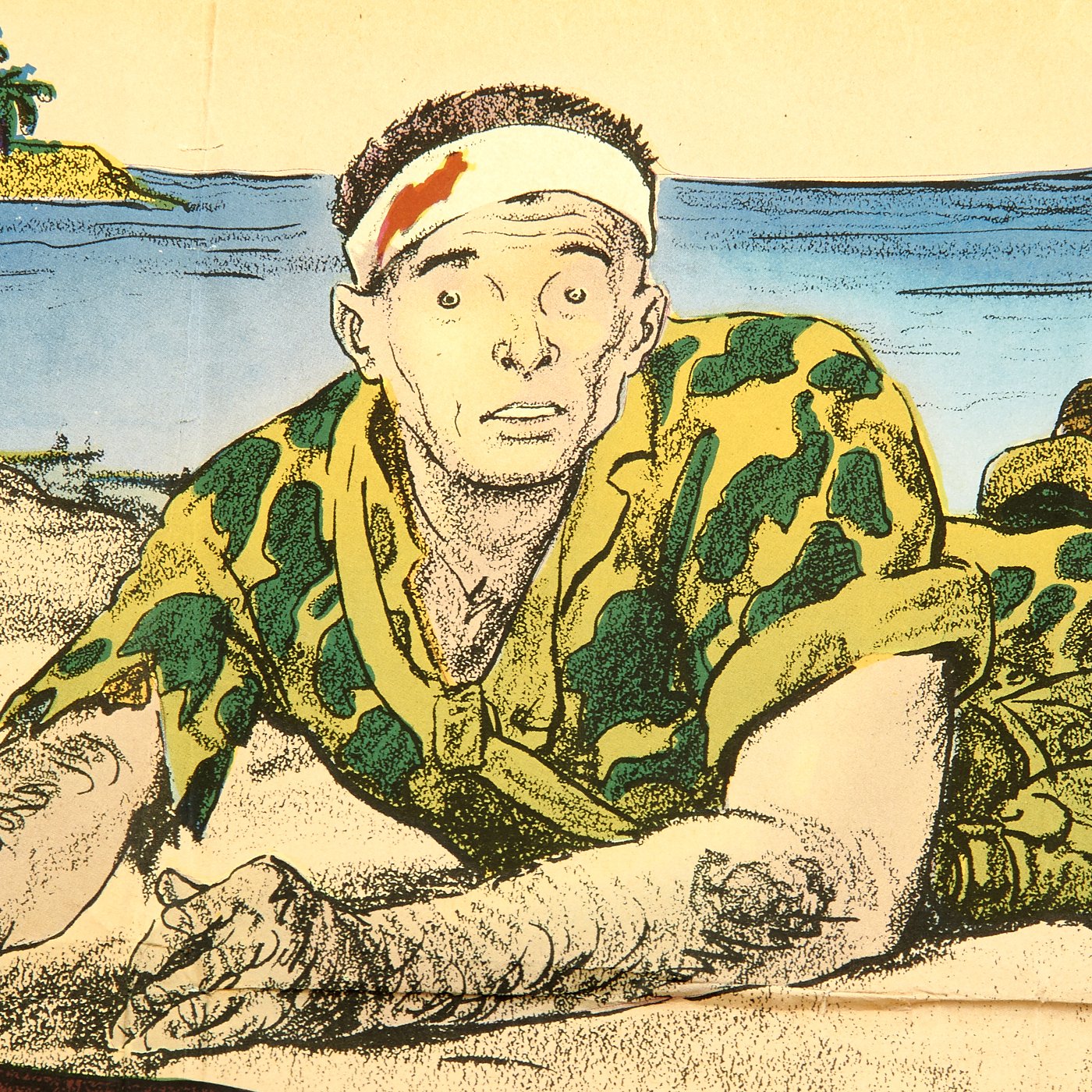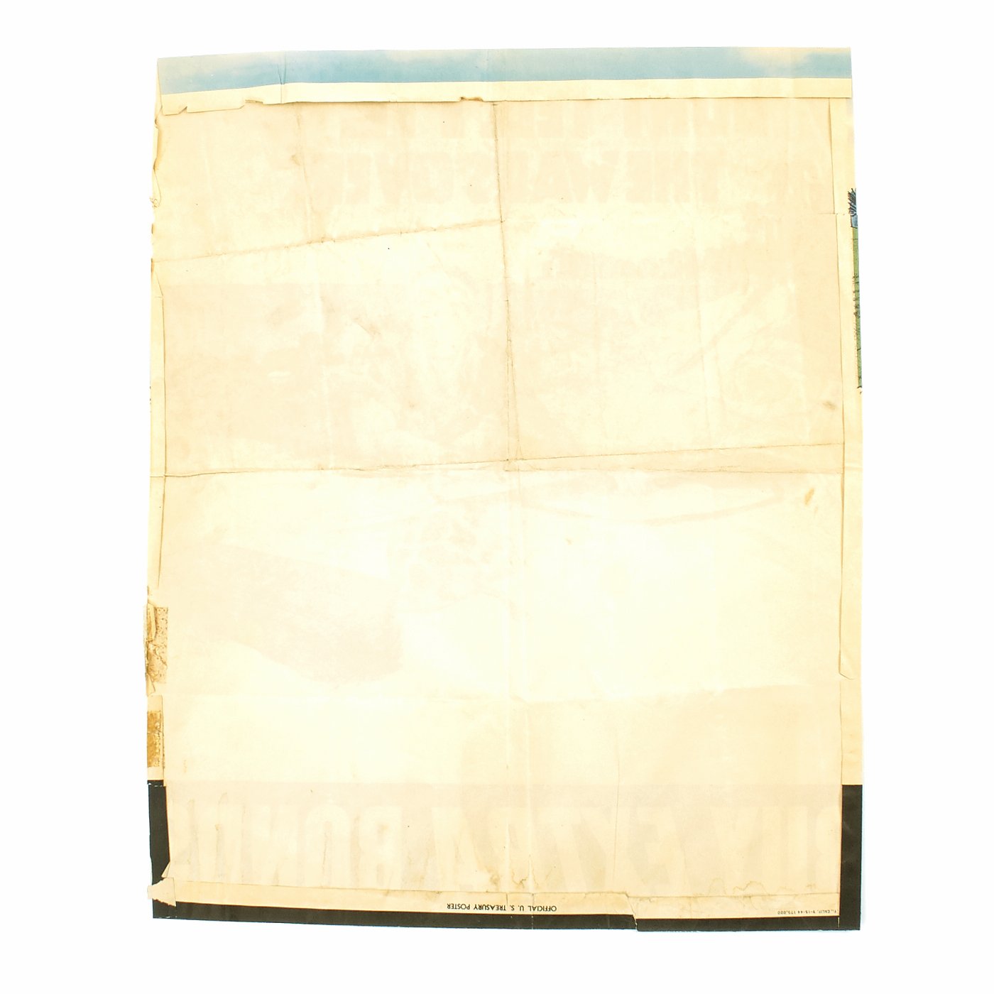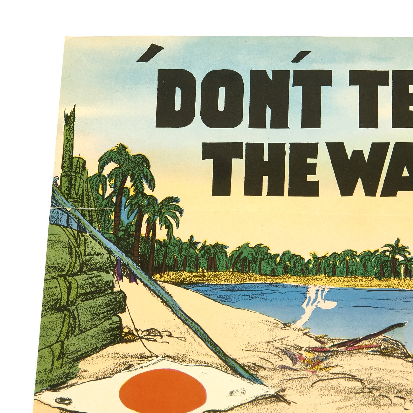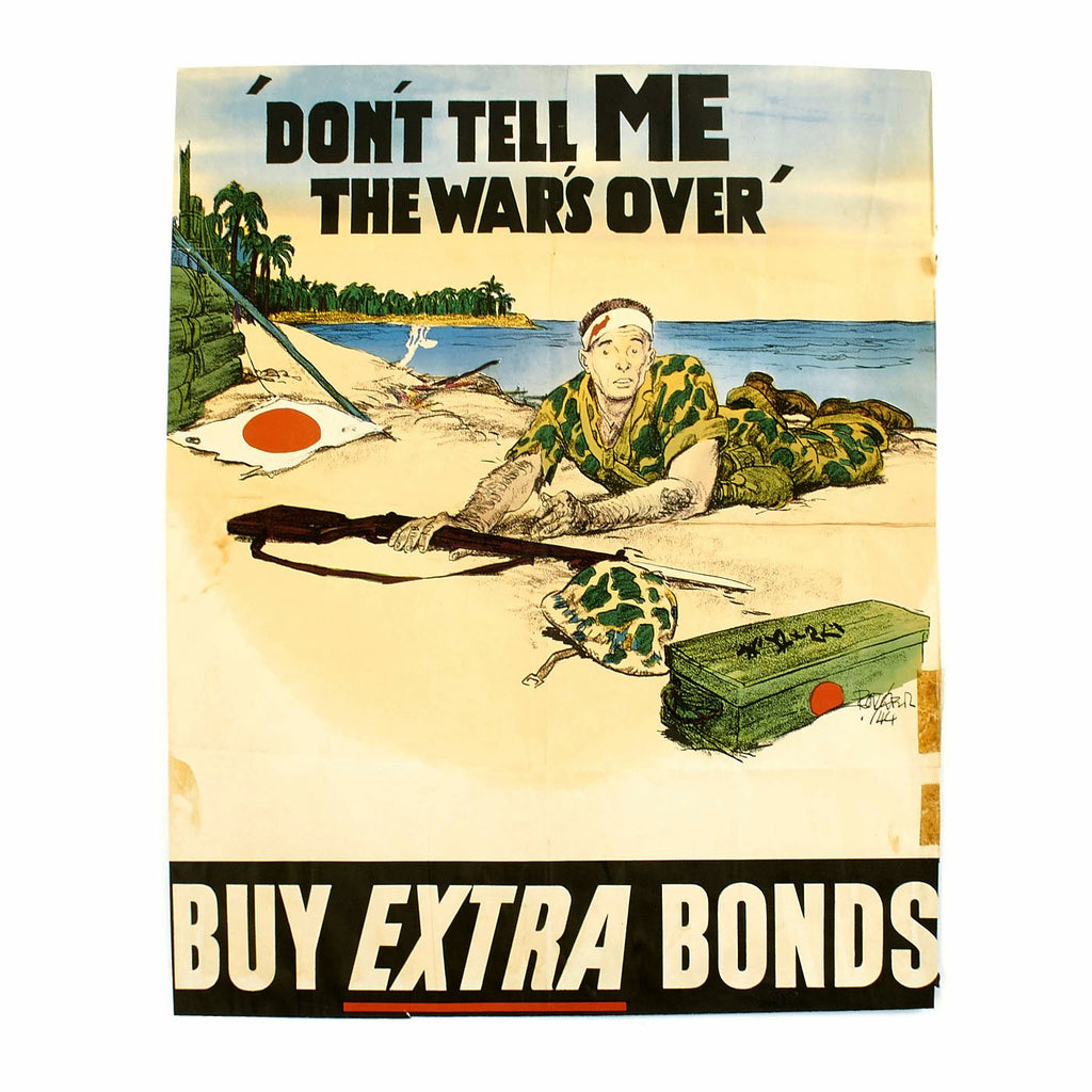 This U.S Treasury Department World War II war bonds poster depicts a confused American Marine on a beach in Japan, telling the viewer, "Don't tell me the war's over," to remind the homefront that although the Germans had been defeated in Europe, the war still continued in the Pacific, and support was still needed. An unrestored poster with good color and an overall very presentable appearanceIt has edge and fold wear, minor fold separation, creasing, rippling, small chips and tears, staining, some smudges, old areas of mounting tape along the edges and minor toning.