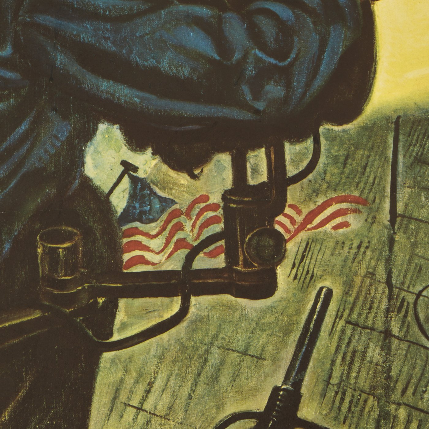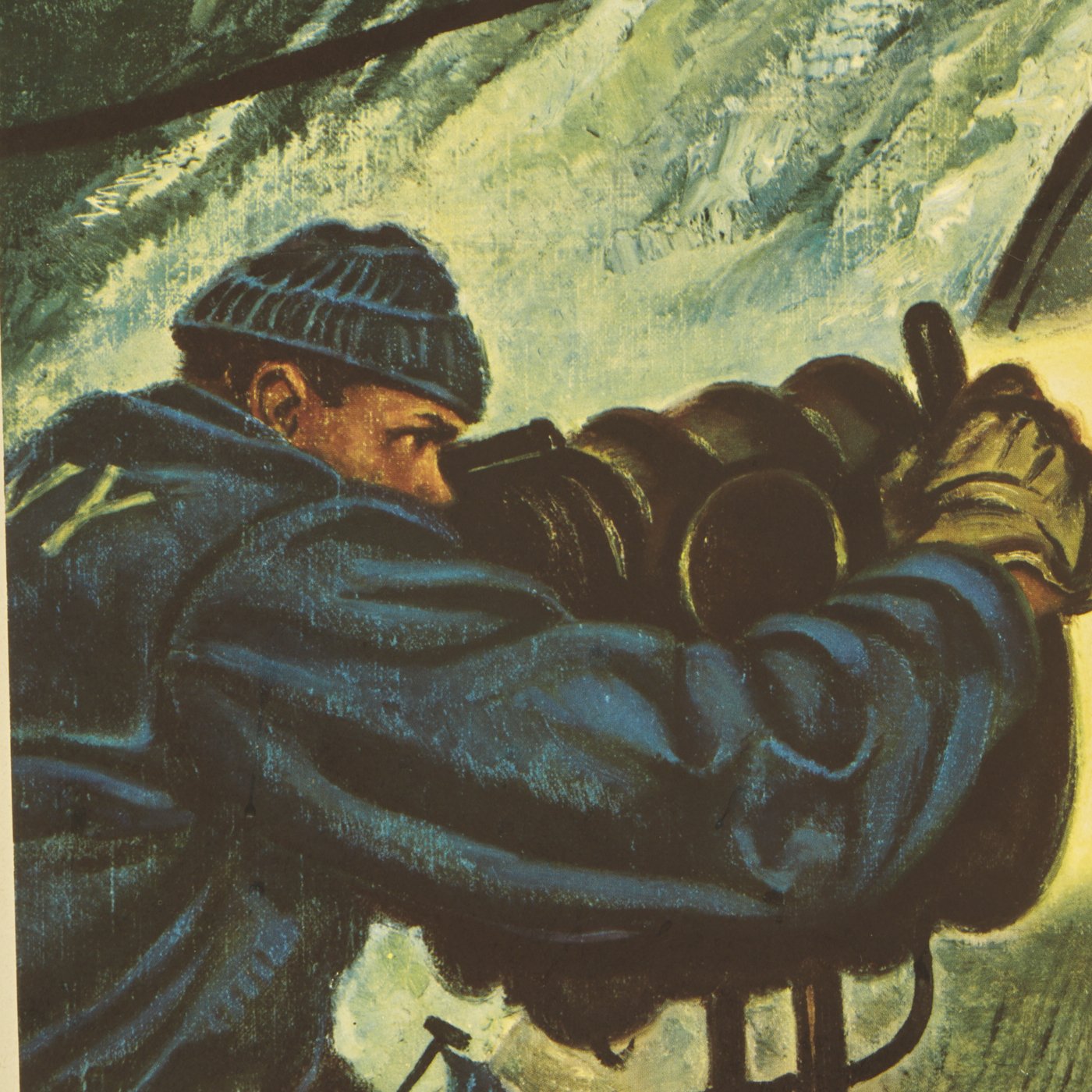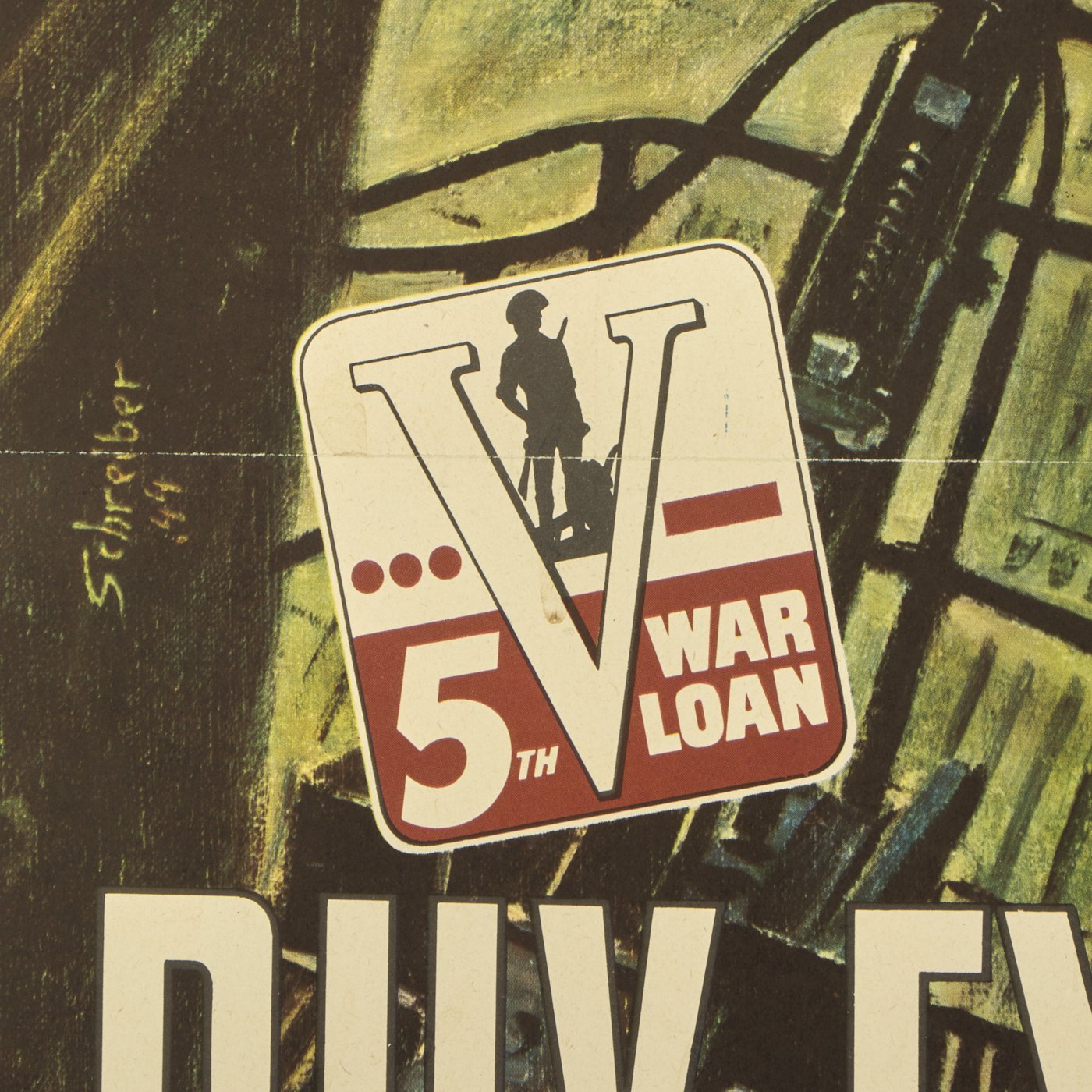 Designed in 1994 by artist Georges Schreiber (1904-1977) commemorates the sinking of the USS Dorado submarine in this 1944 War Bonds poster entitled, Fire Away, for the Fifth War Loan. Schreiber sailed aboard the ship in the summer of 1943 and had a personal connection to the tragedy. USS Dorado (SS-248) was a Gato-class submarine. Her keel was laid down on 27 August 1942 by the Electric Boat Company of Groton, Connecticut and was commissioned on 28 August 1943 under the command of Lieutenant Commander Earle Caffrey Schneider. The USS Dorado sailed for the Panama Canal for use in the East Asia war effort. The submarine was sunk off the coast of Cuba due to a minefield left by a German-NSDAP U Boat. This is an Original Vintage Poster; it is not a reproduction.