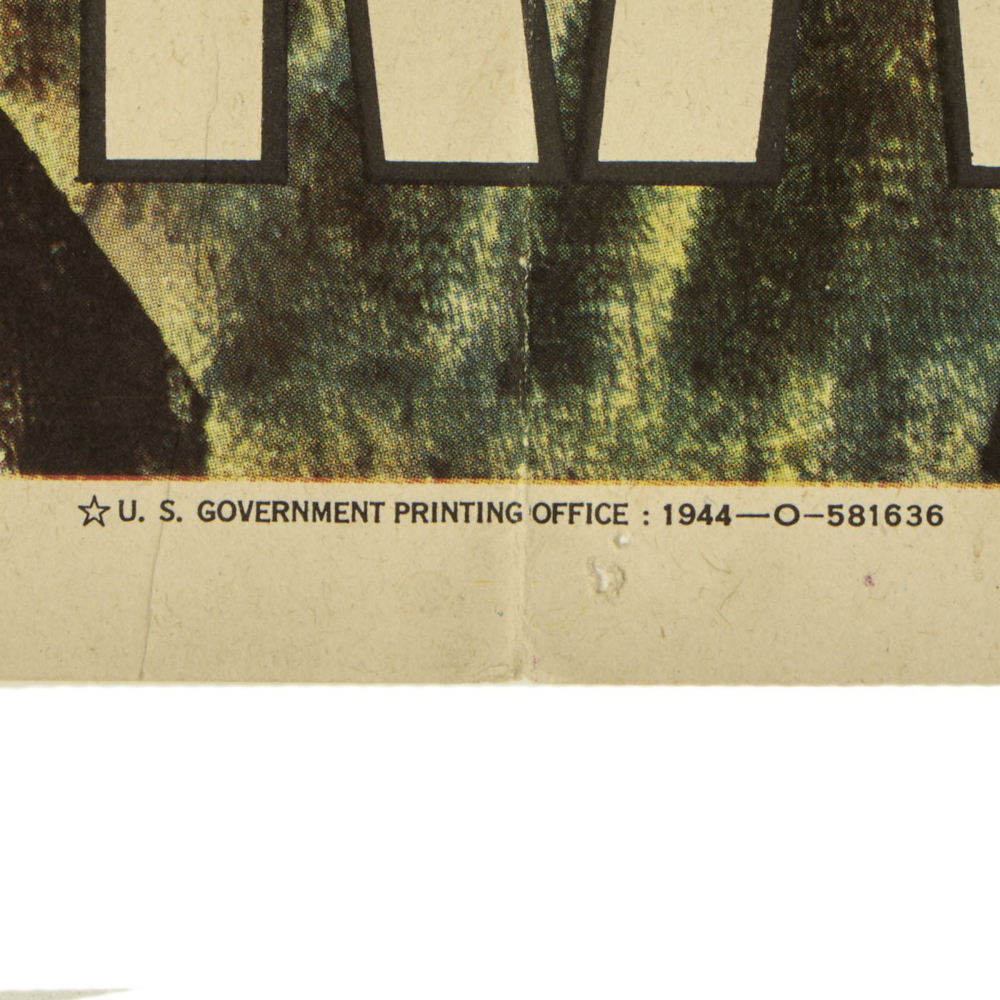 Reads on the lower edge "U.S. Government Printing Office : 1944-O-581636" and "WFD 908-A". Measures 20" x 28" and offered in excellent condition with fold lines. A rare vintage U.S. Sub poster from WW2!