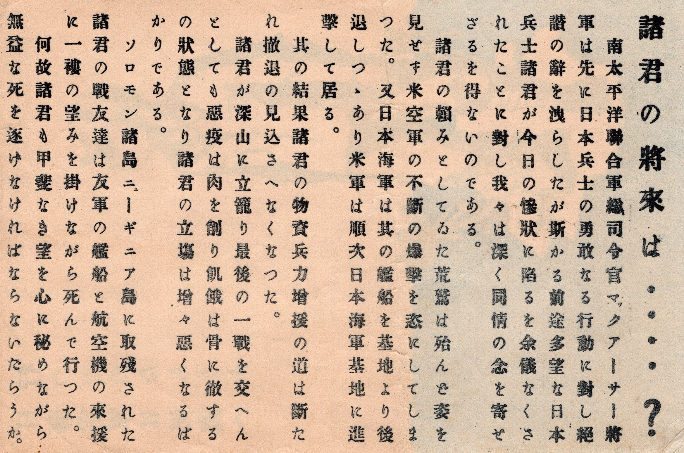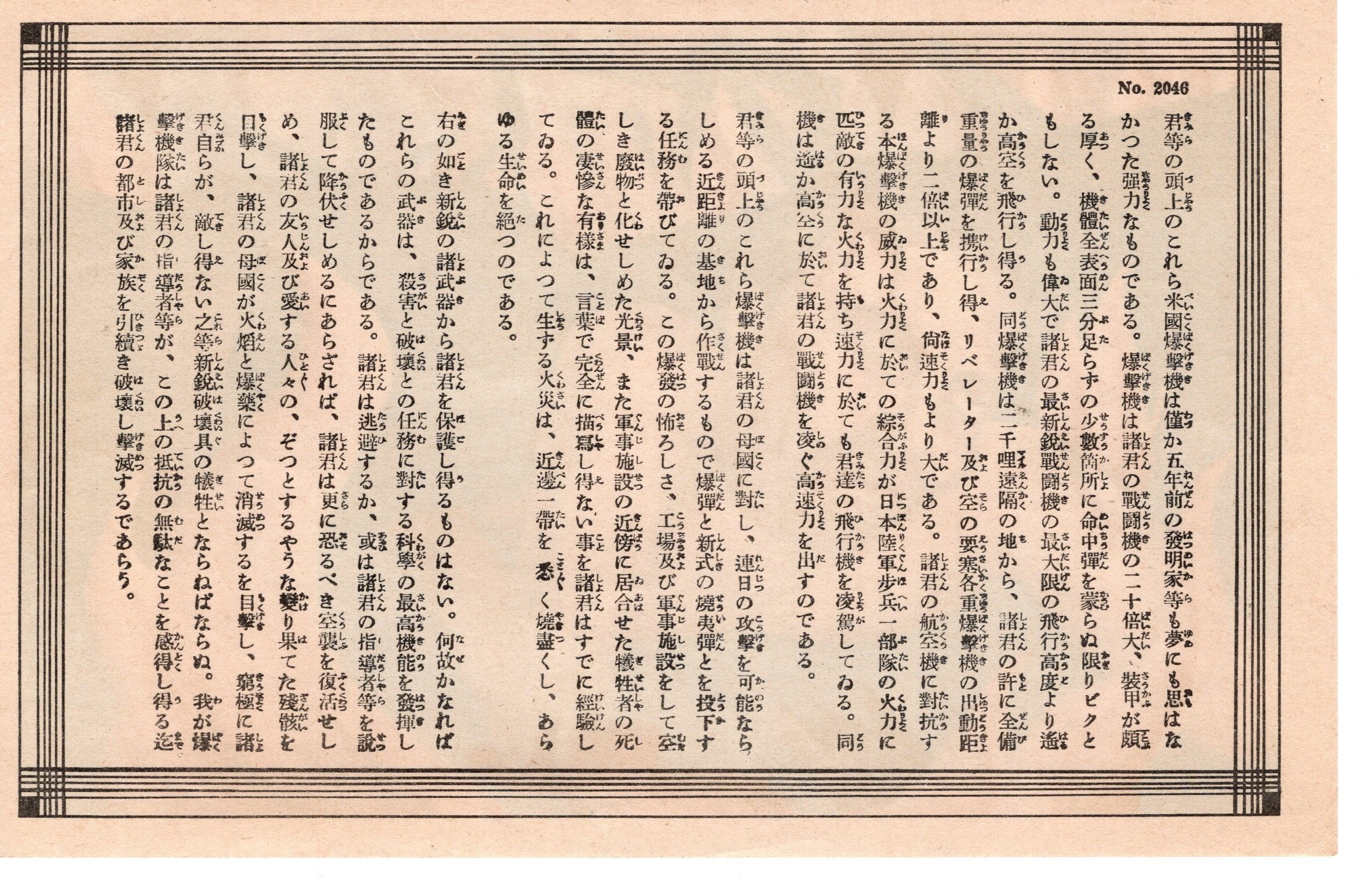 This is a collection of five WWII leaflets. Four were produced by the United States for use in Japan, the other is French. Overall condition is excellent.