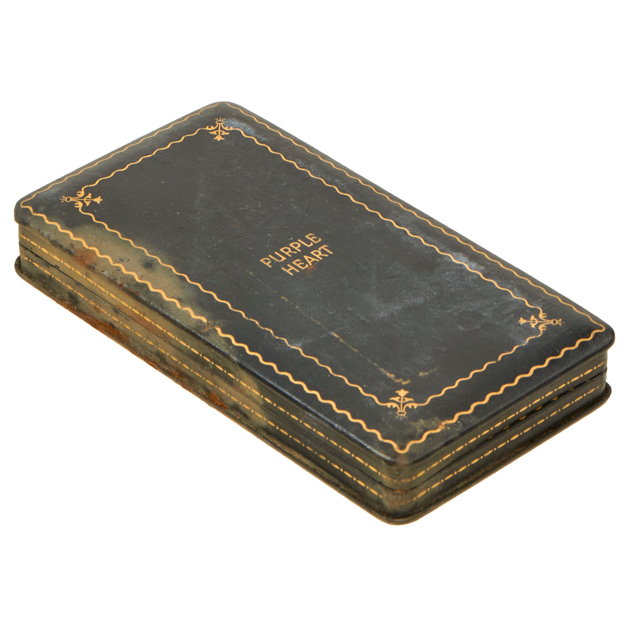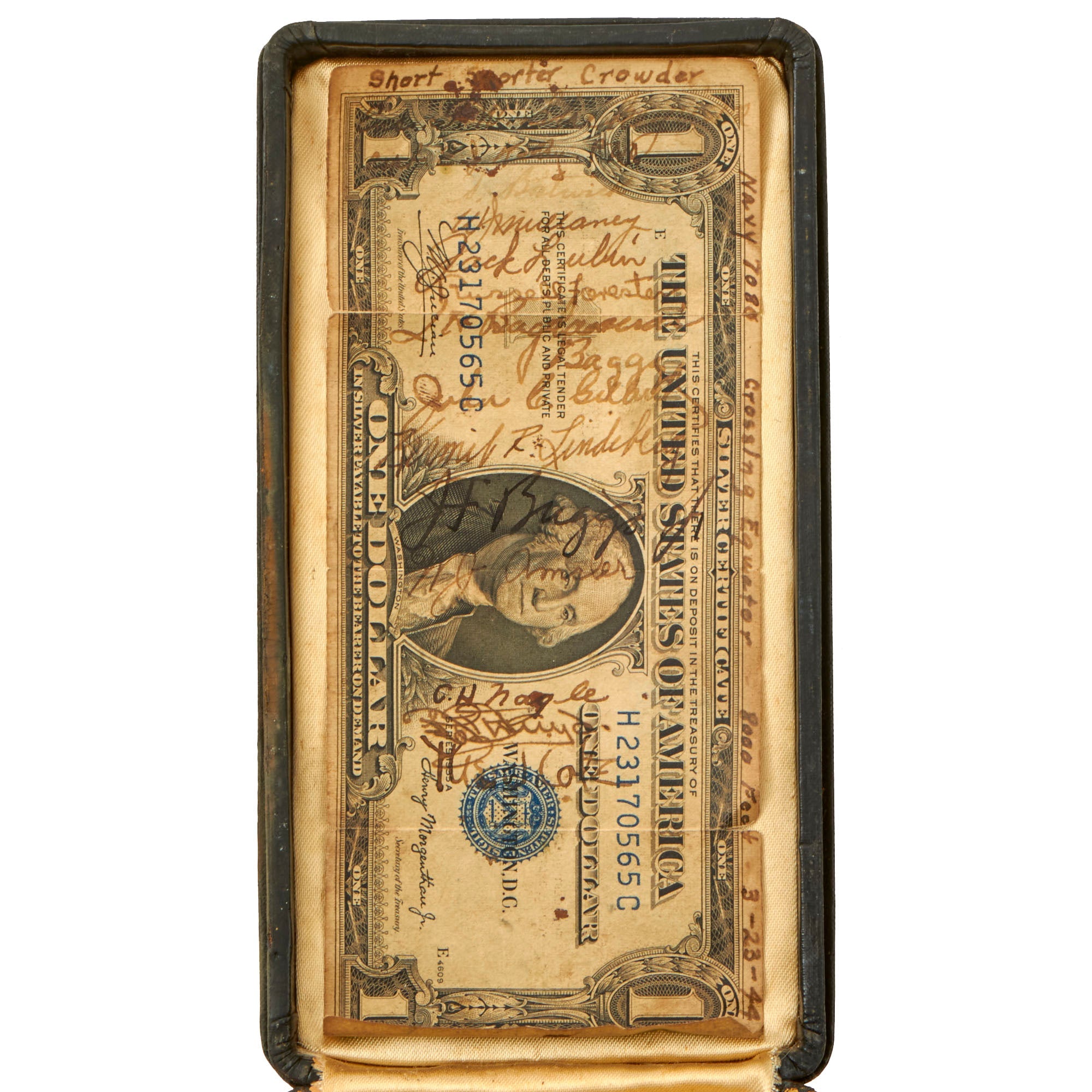This is an interesting unengraved Purple Heart in its original presentation with a lovely short snorter taped to the interior lid. The snorter is on a 1935 Silver Certificate and is inscribed SHORT SNORTER CROWDER NAVY 7080 CROSSING EQUATOR 8000 FT - 3-23-44 with a few different signatures of his comrades.