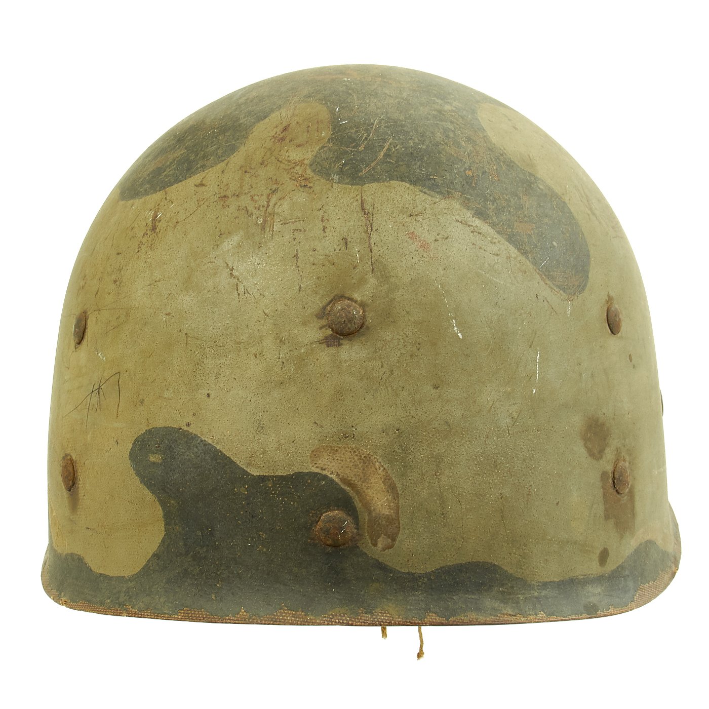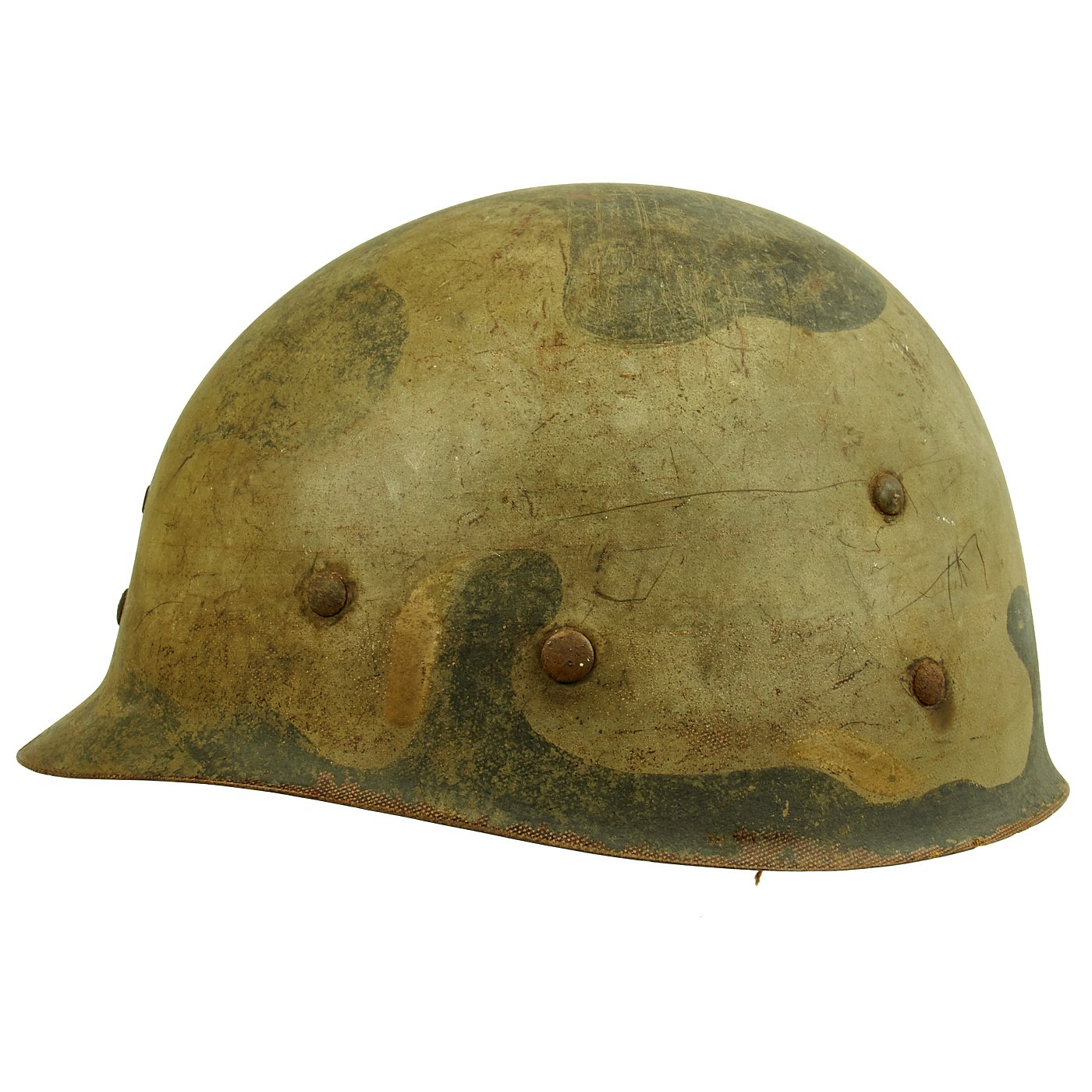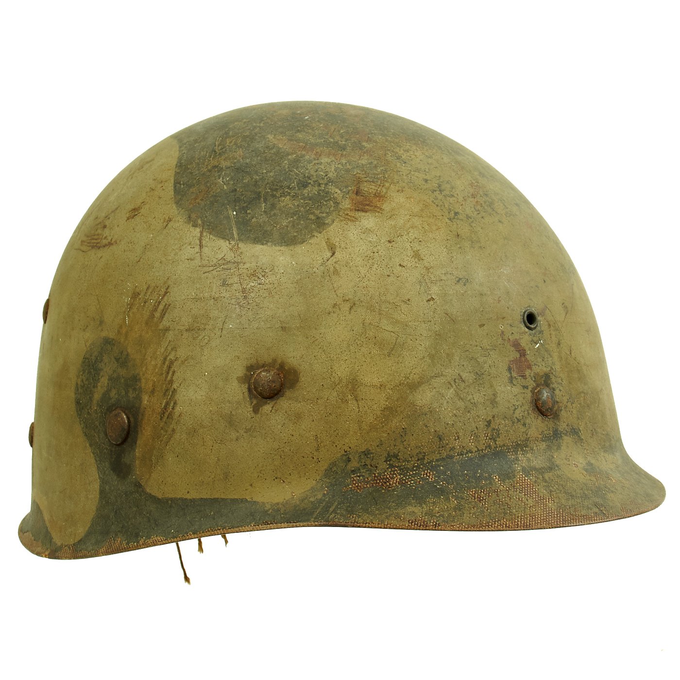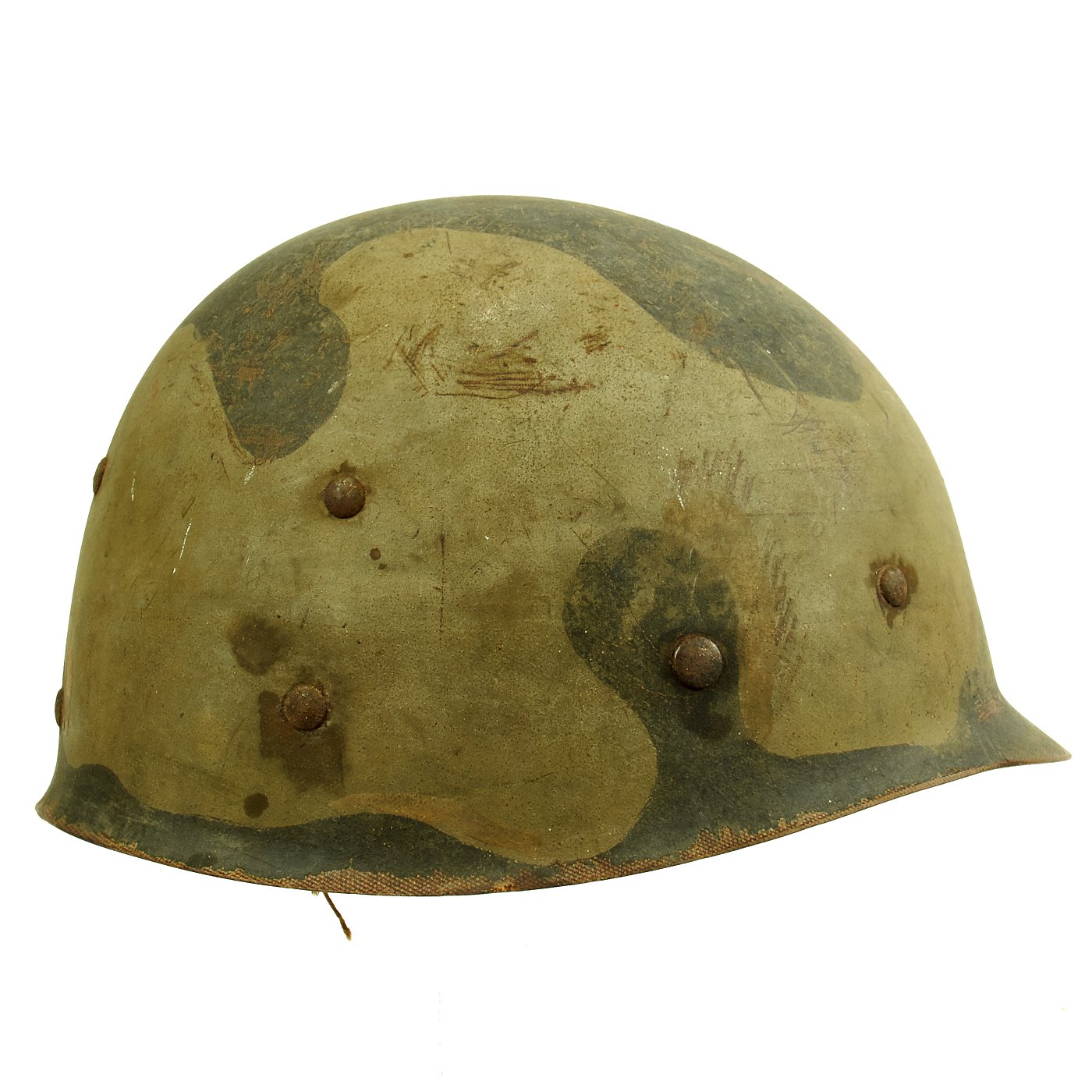 Original Item: Only One Available. This is a very rare WWII Issue M1 "Low Pressure" Helmet Liner. which has been painted on the outside with a very good camouflage paint scheme. The weight of the complete helmet could be cumbersome in some situations, such as working behind the enemy lines, and this provided some level of protection from branches and other minor obstacles. The camouflage paint job made the soldier that much harder to spot.