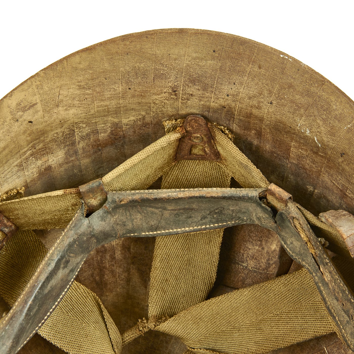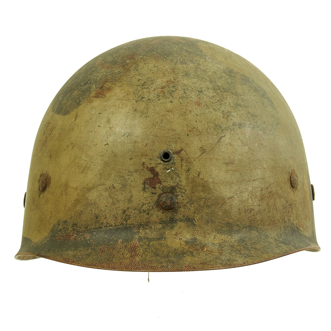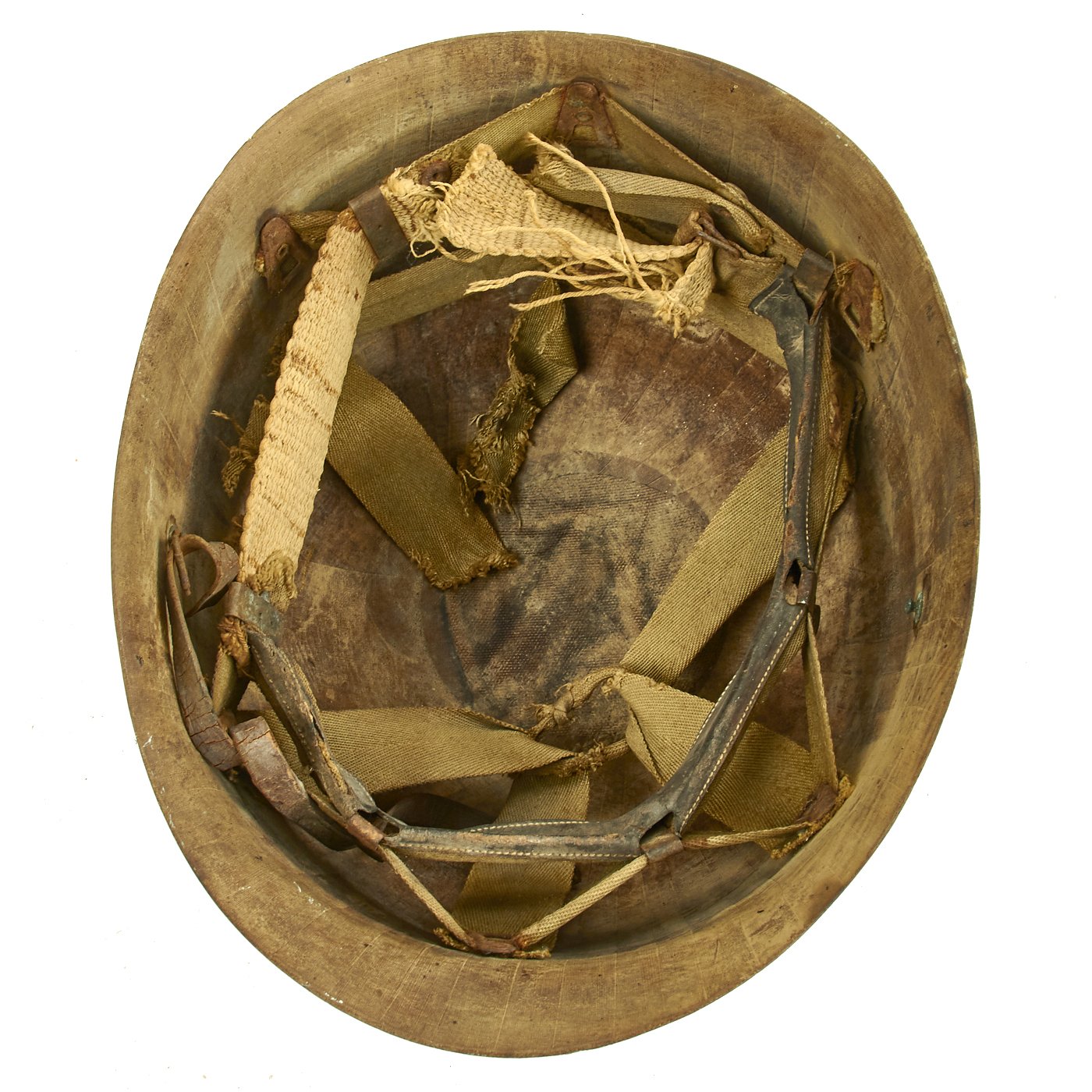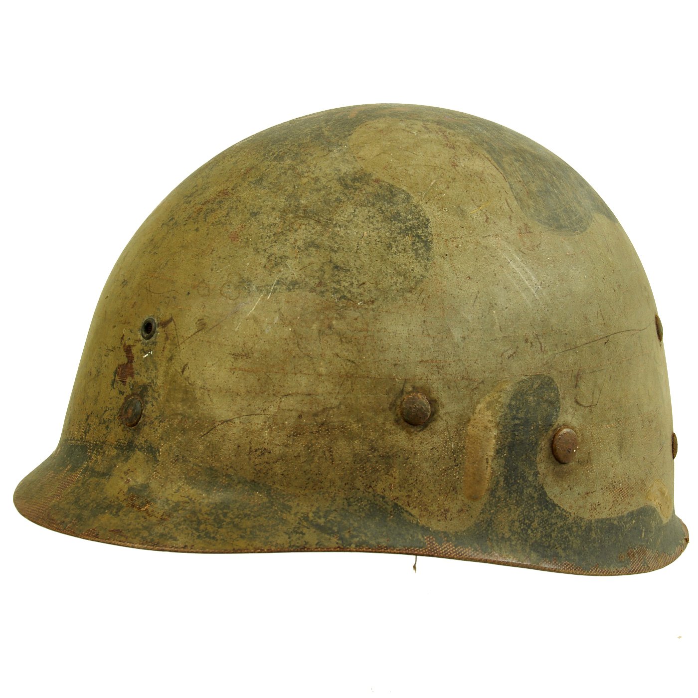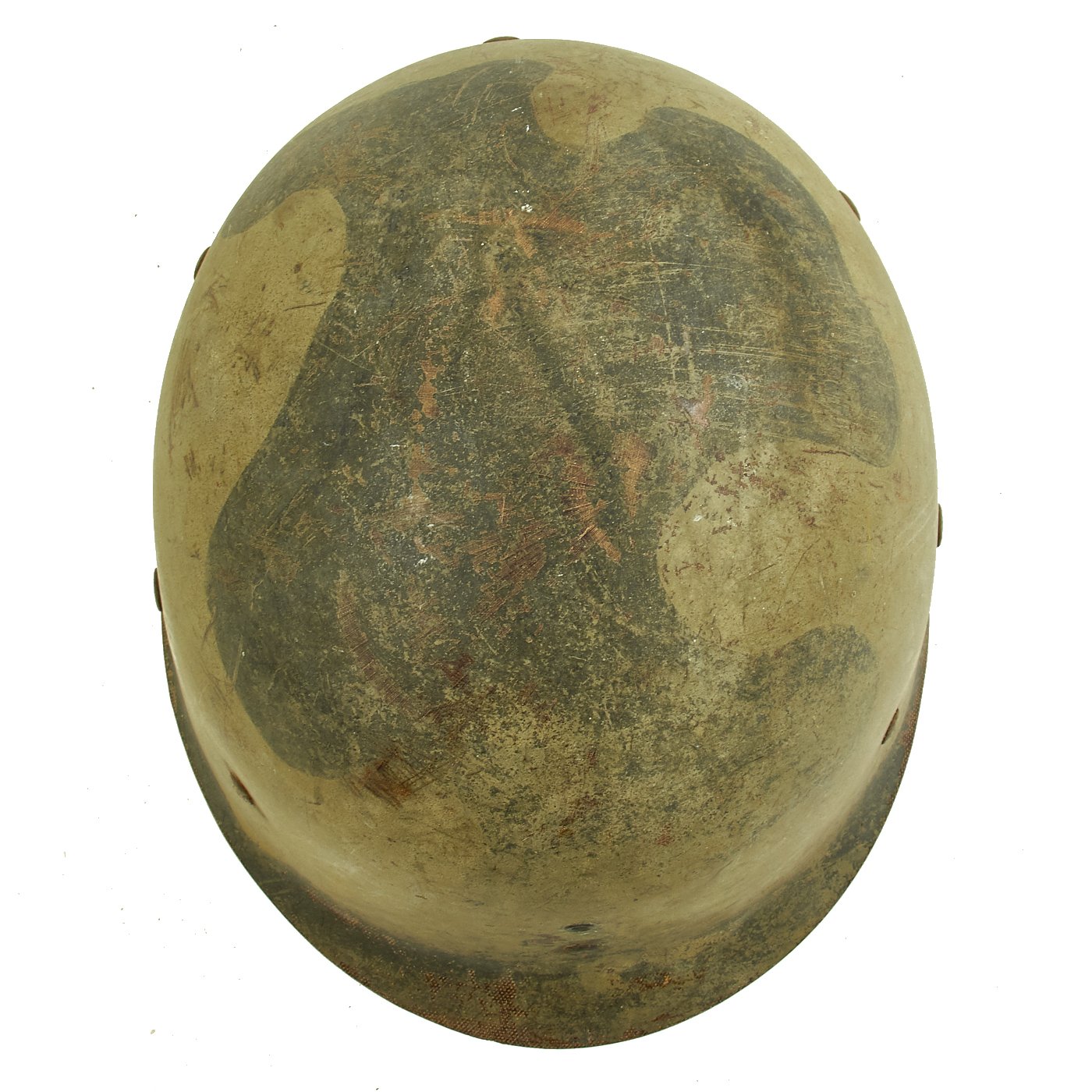 Original Item: Only One Available. This is a very rare WWII Issue M1 "Low Pressure" Helmet Liner. which has been painted on the outside with a very good camouflage paint scheme. The weight of the complete helmet could be cumbersome in some situations, such as working behind the enemy lines, and this provided some level of protection from branches and other minor obstacles. The camouflage paint job made the soldier that much harder to spot.