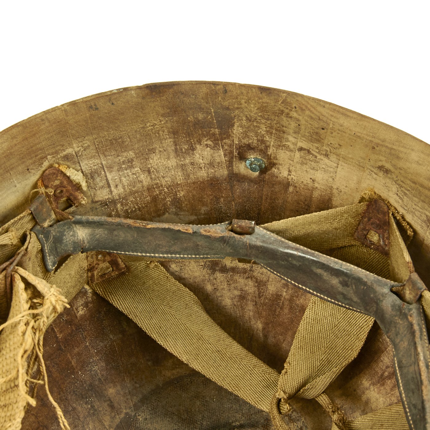 This true US WWII M-1 helmet liner be identified through the frontal eyelet hole. Other correct WWII features include cotton OD Green #3 herringbone twill (HBT) cloth suspension liner, held onto the helmet by "A" shaped washers. From the looks of it, this helmet liner saw extensive use in the field, and was even repaired with a canvas strap. Perhaps it was used in the Pacific theater, where replacements were not as easy to find.