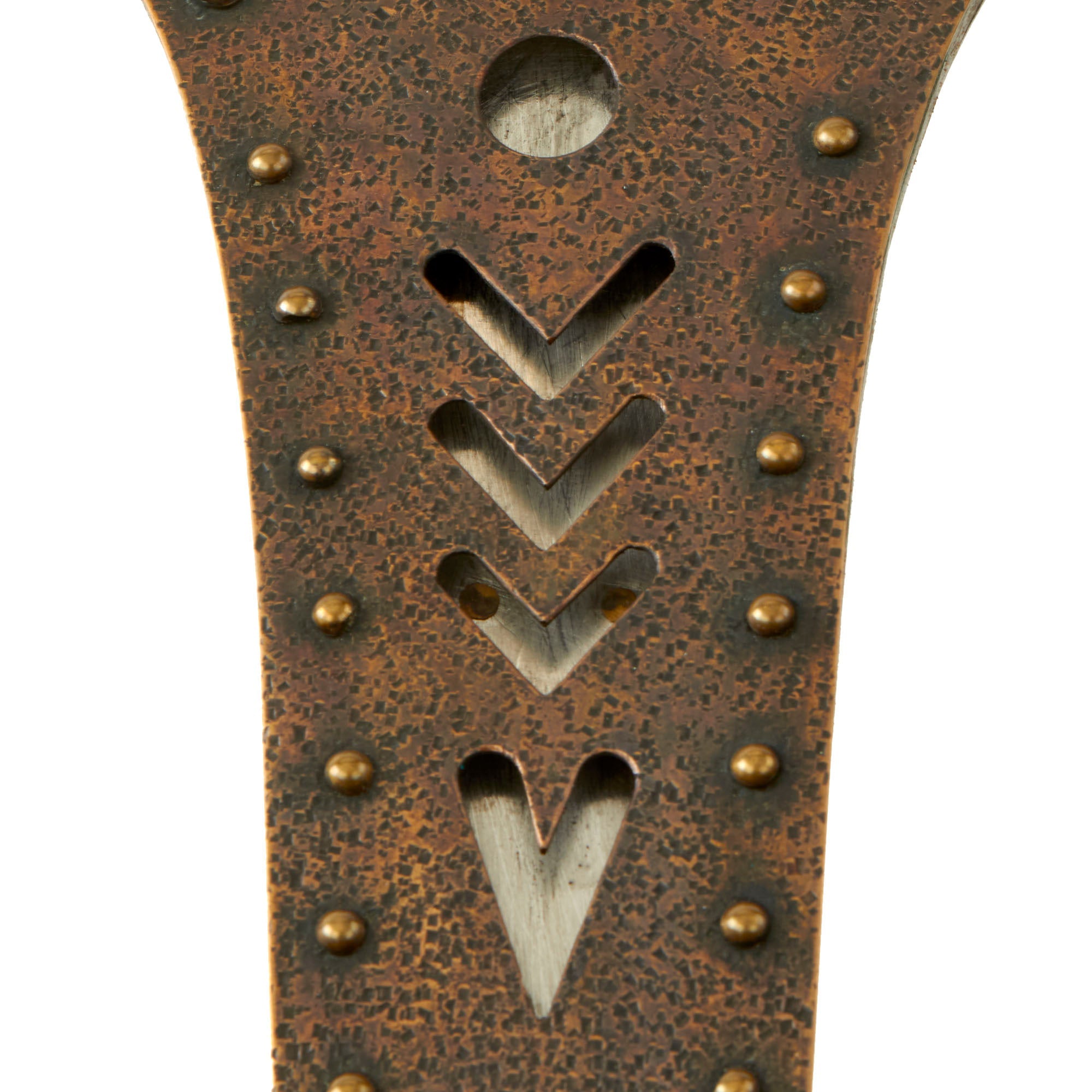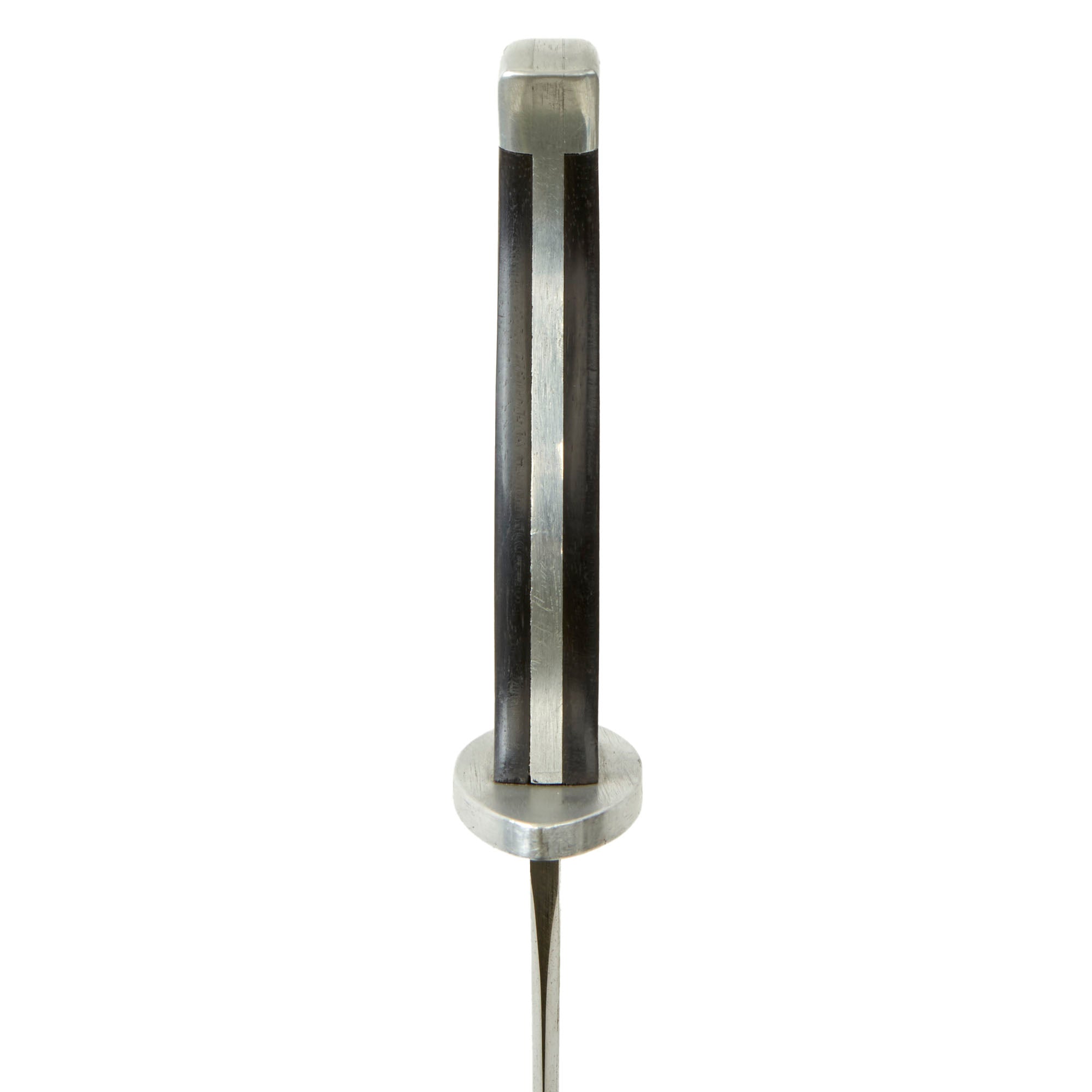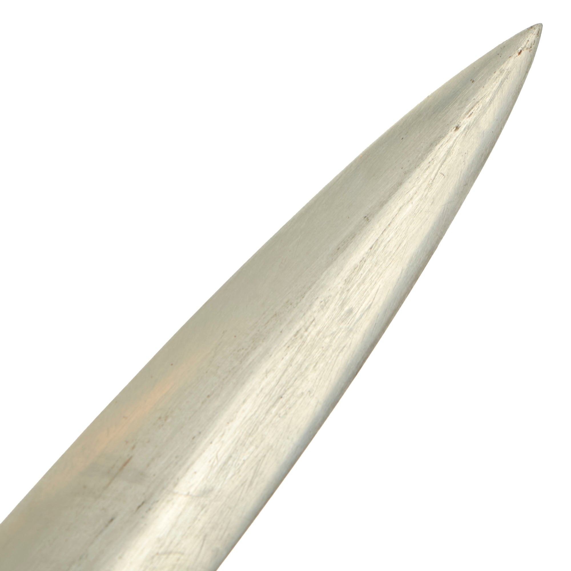 Original Item: Only One Available. This Warther Fighting Knife is in excellent condition, perhaps have never been used, and is a remarkable piece of weaponry. It adheres to the traditional Warther knife design with a full-length tang dagger blade that measures 7 7/8 inches and an overall length of 12 1/8 inches. The knife is ergonomically designed to fit the hand perfectly, providing unparalleled balance and control. The rear of the scabbard’s brass belt loop is stamped in three lines: