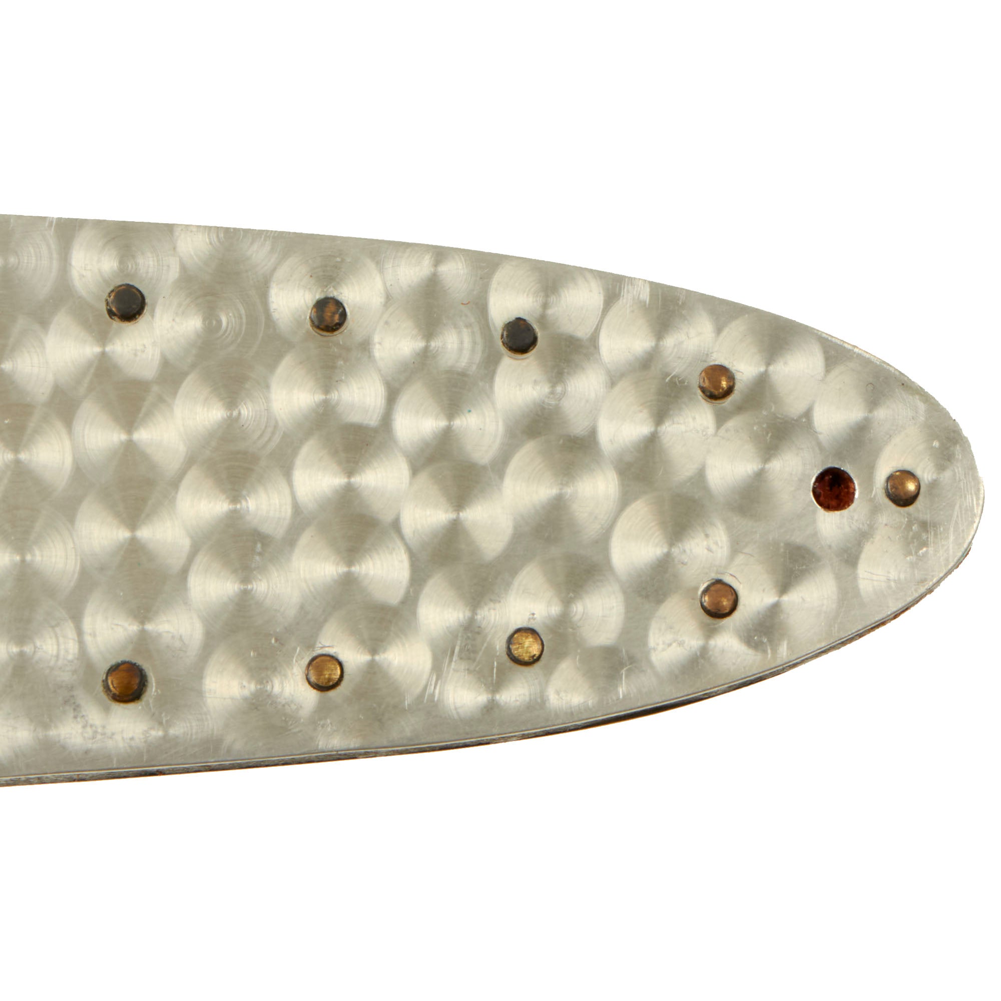 The blade of the knife has retained its original polish, with only a few scattered areas of very minor surface oxidation and discoloration due to age. These imperfections are primarily present around the ricasso and guard area. Additionally, there is some oxidation along the tang between the scales, and some minor discoloration on the aluminum fittings. The scabbard is in equally excellent condition with almost all of the front paint still intact and the rear still showing the hand-applied jeweled pattern. All markings on the belt loop, are clearly and crisply stamped.