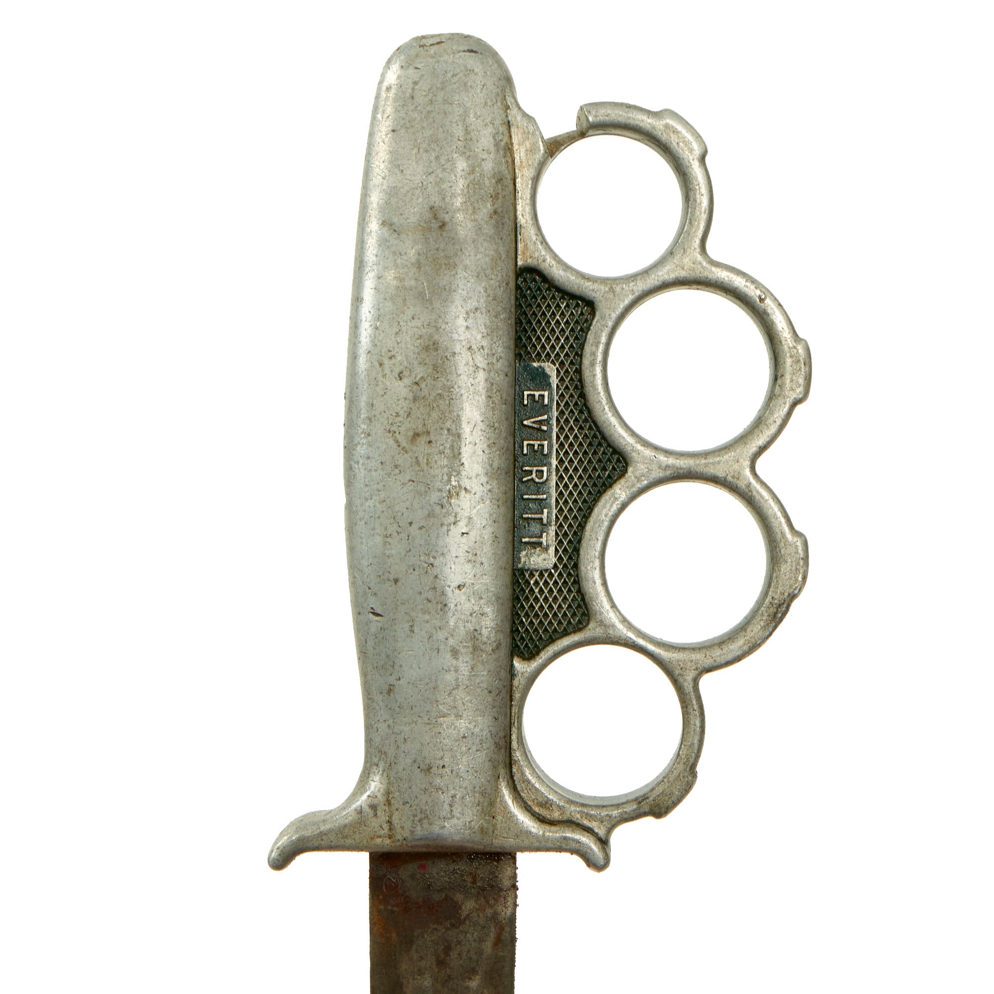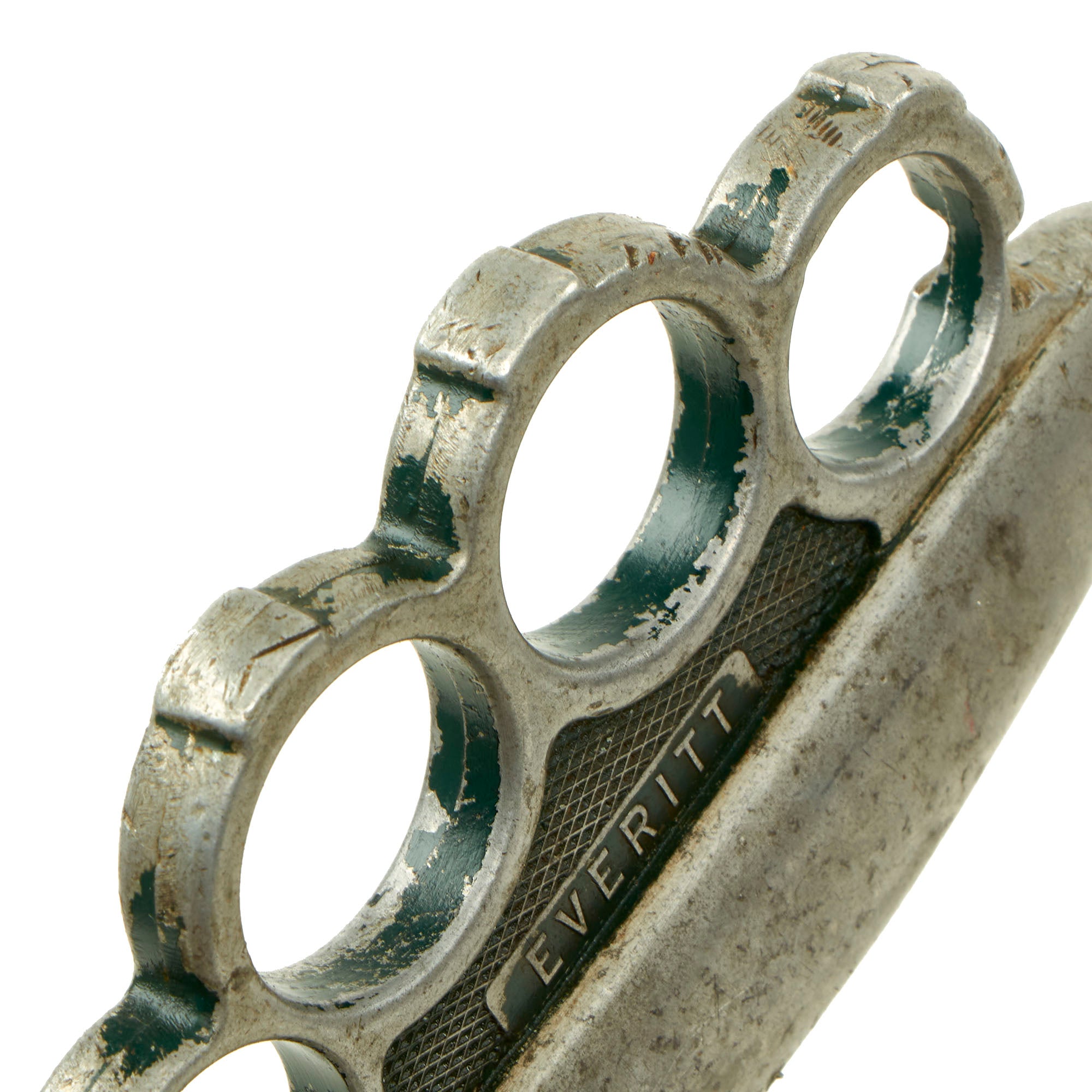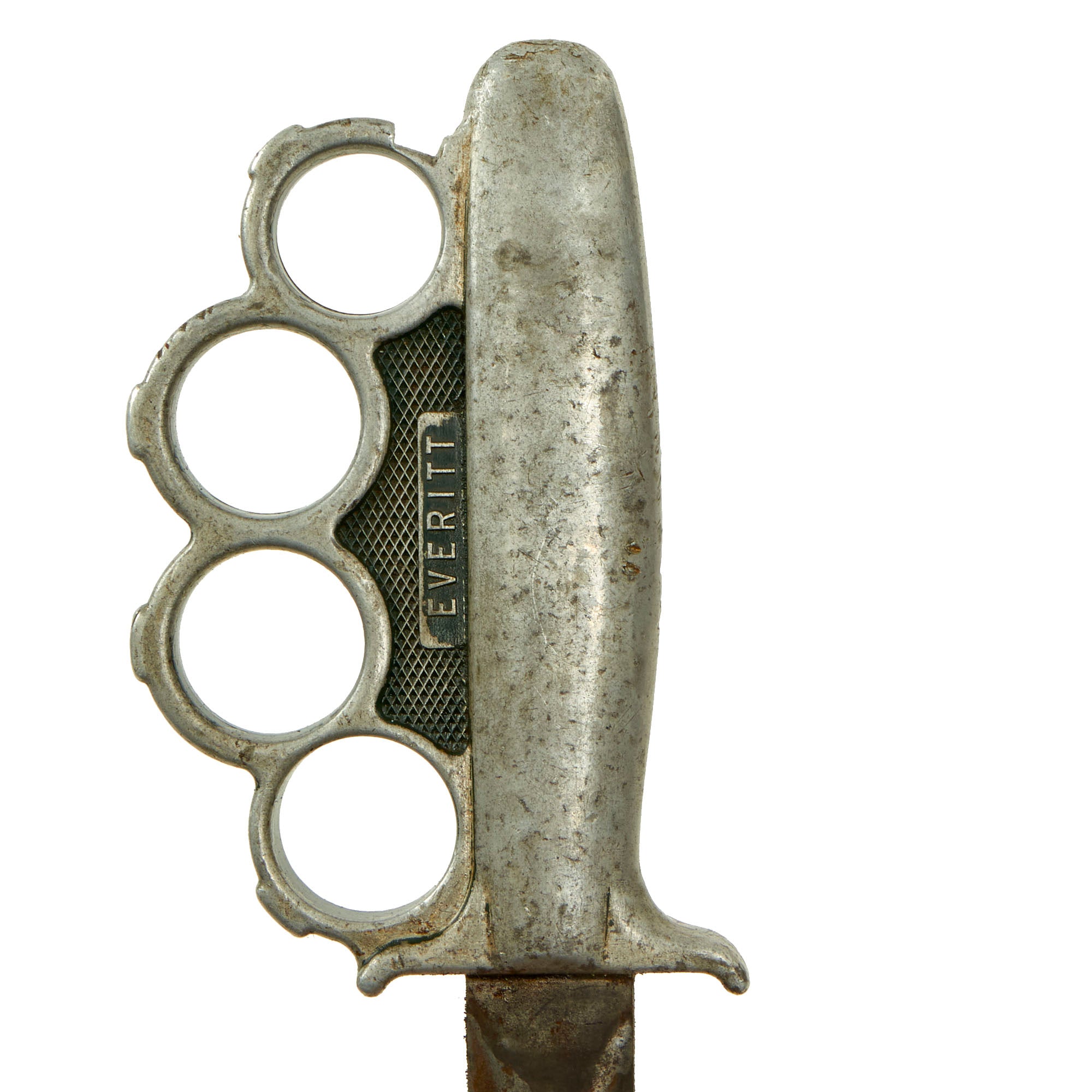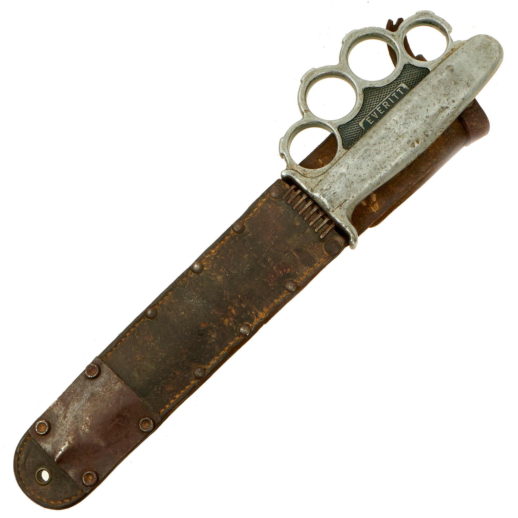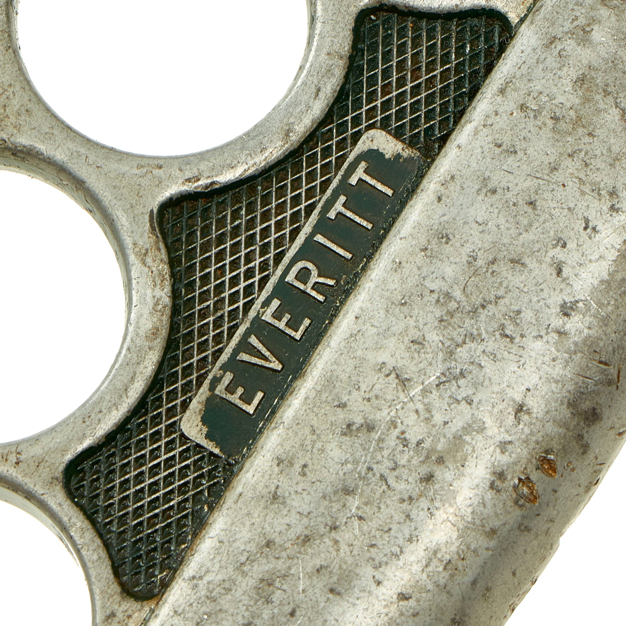 Original Item: Only One Available. This is a lovely example of the rare U.S. WWII Everitt Knuckle fighting knife that features the desirable green painted handle, with the correct original scabbard. No reference indicates that anyone knows who “Everitt” was, or who the company that produced the knives was. Some have surmised that it was the location of manufacture, but due to the passage of time, most likely the true answer will never be known.