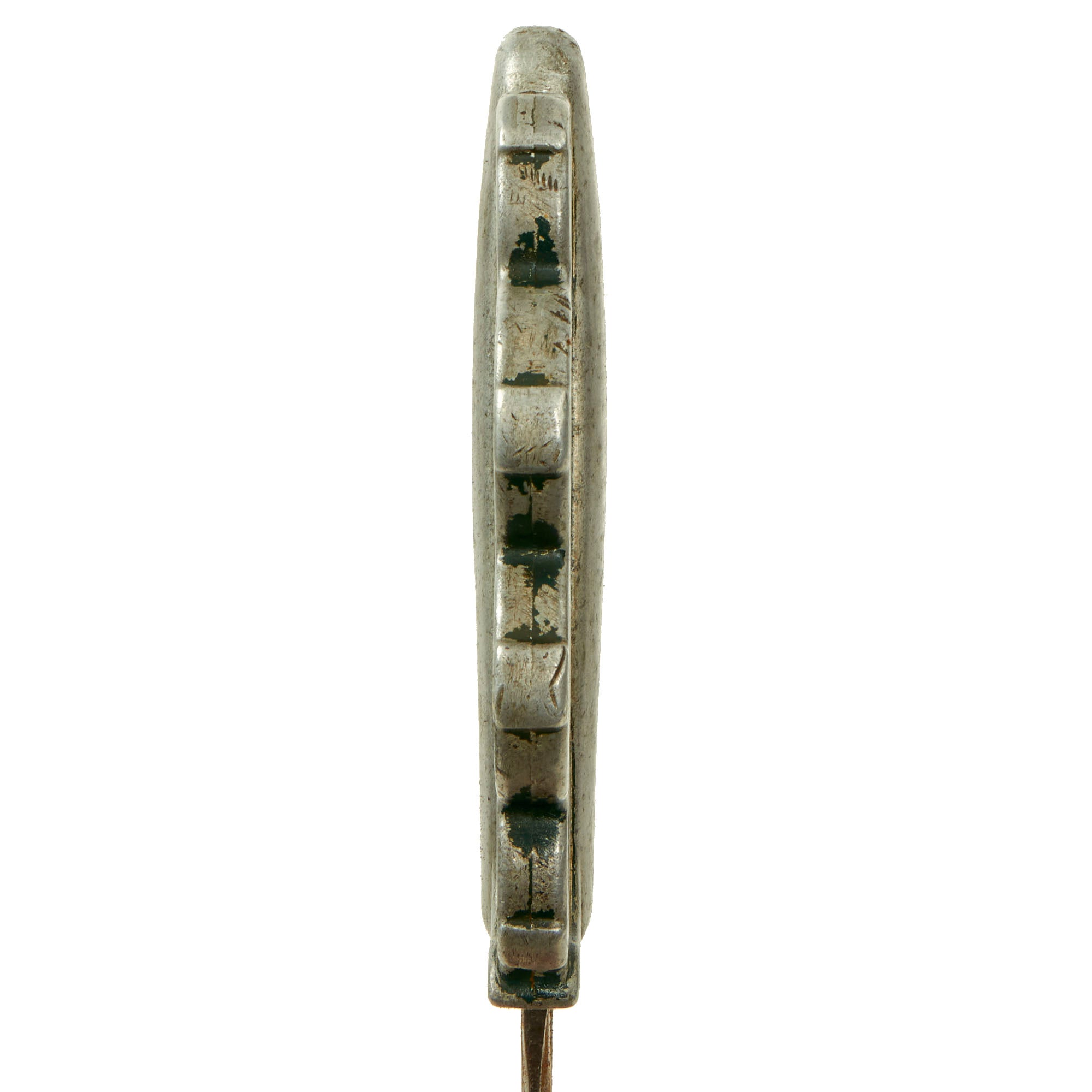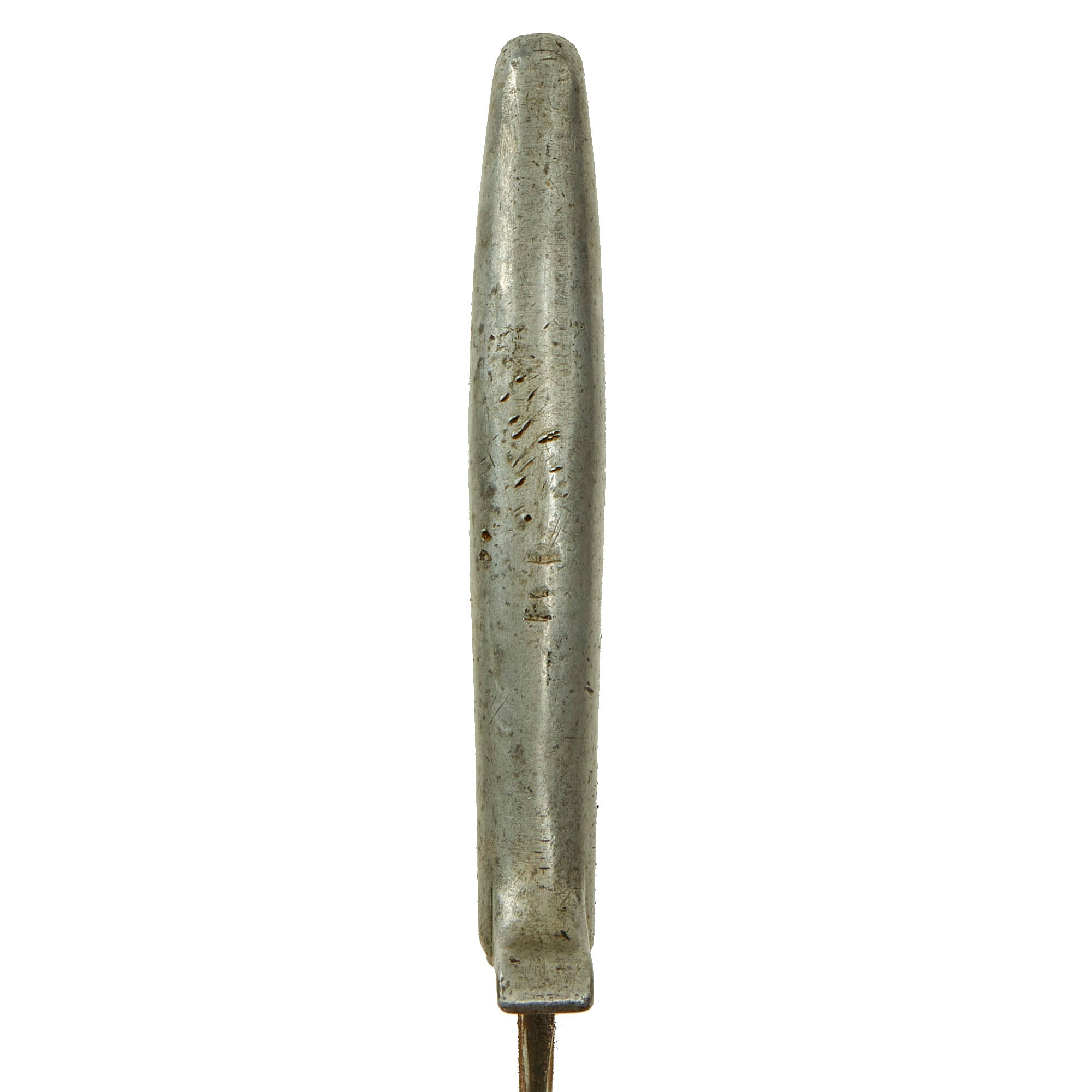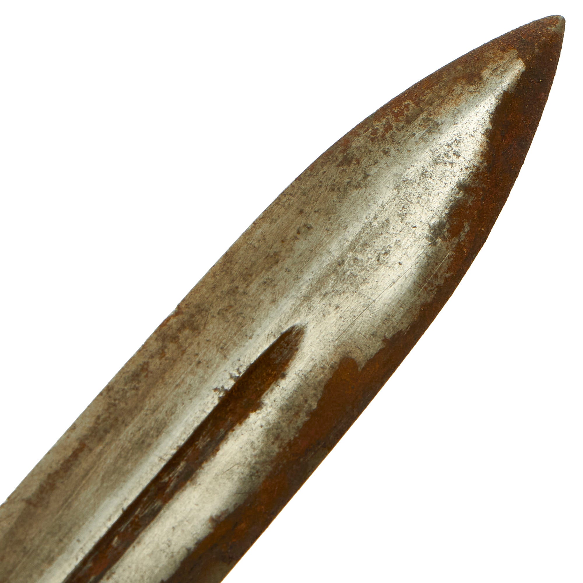 The blade is a simple double-edged spear-point design, which measures about 7 inches long with thin central fullers. The knife is clearly intended for stabbing and only offered limited utility for the other duties that a combat knife might be called upon to deliver. The blades were usually painted with black enamel, however this example now has an oxidized blade with a gray patina and rust present. The blade does have some small areas of rust on one side, with some more advanced oxidation on the other. The blade itself does show real signs of use.