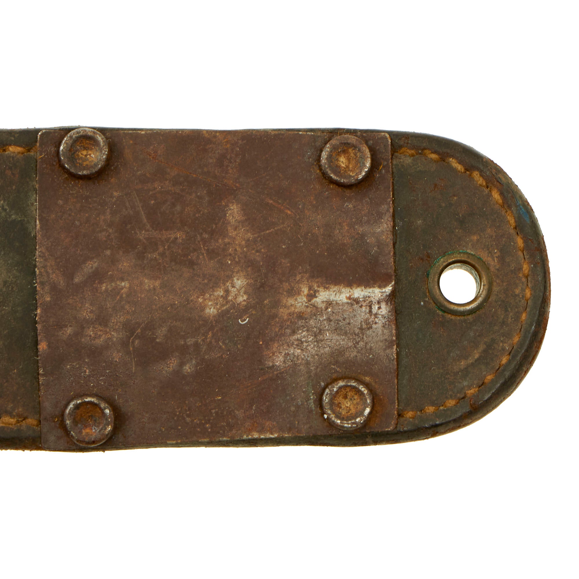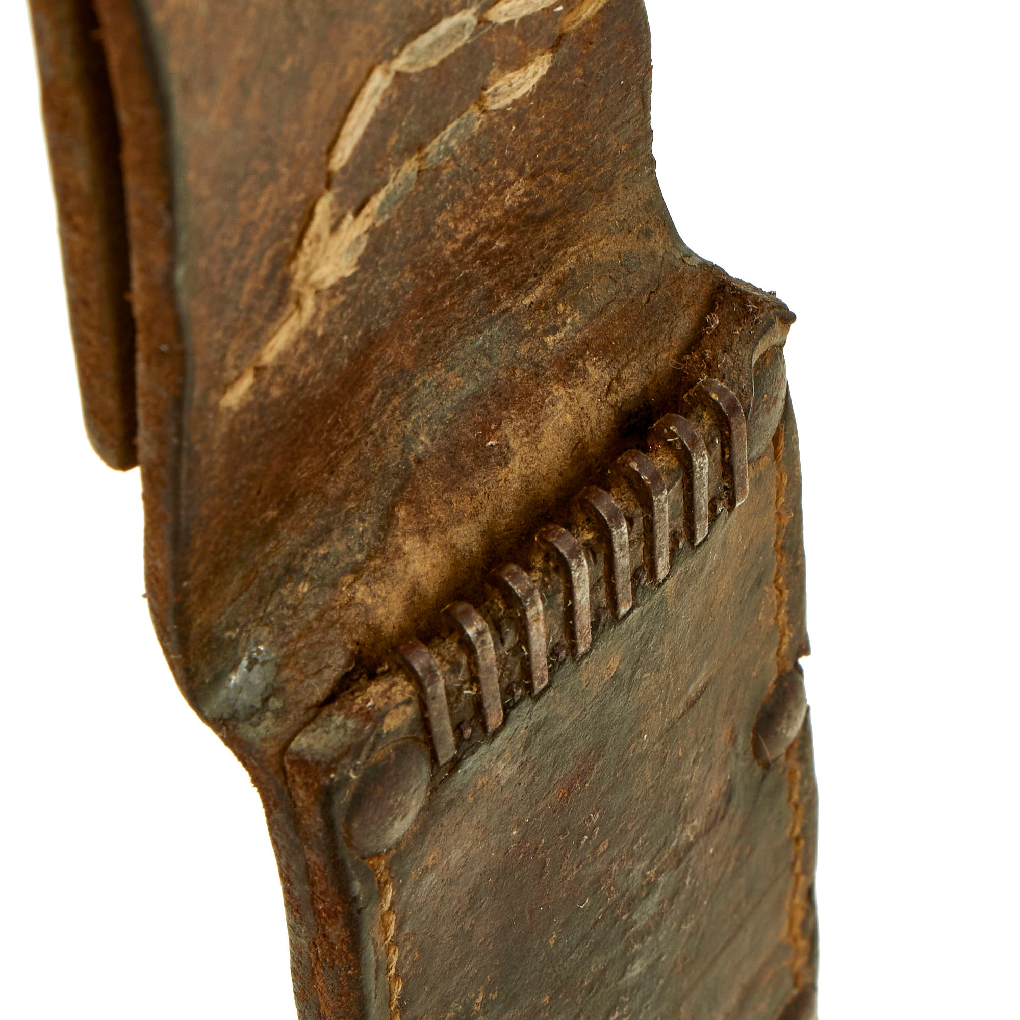 The correct scabbard for these knives are almost rarer than the knife itself, as they are often degraded or lost. This scabbard appears to be correct, but it is an M6 scabbard used with the M3 fighting knife. The leather is very worn and all original markings are no longer visible. All staples and rivets are present. The only real issue with the scabbard is the female end snap is missing entirely along with the end of the leather strap used to secure it.