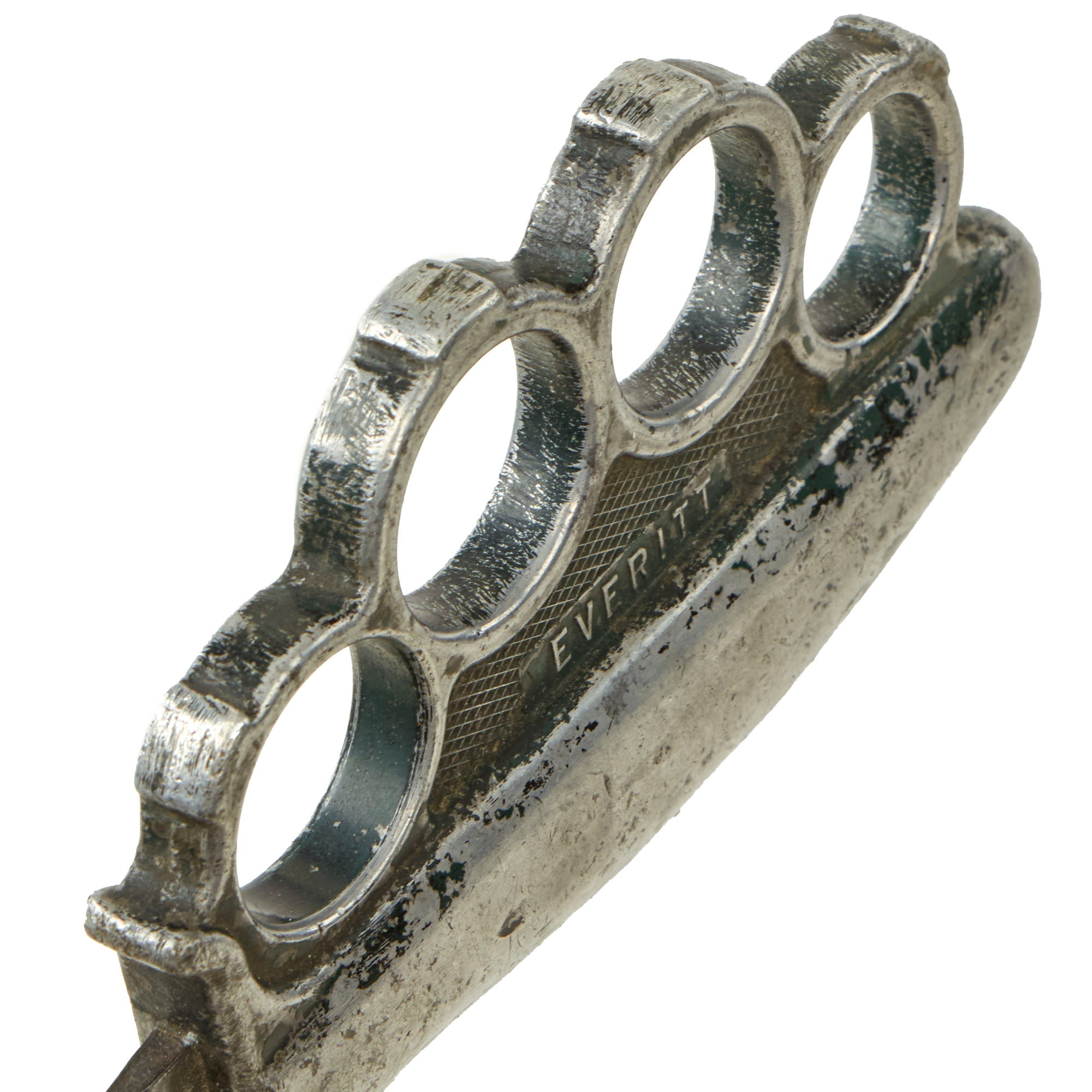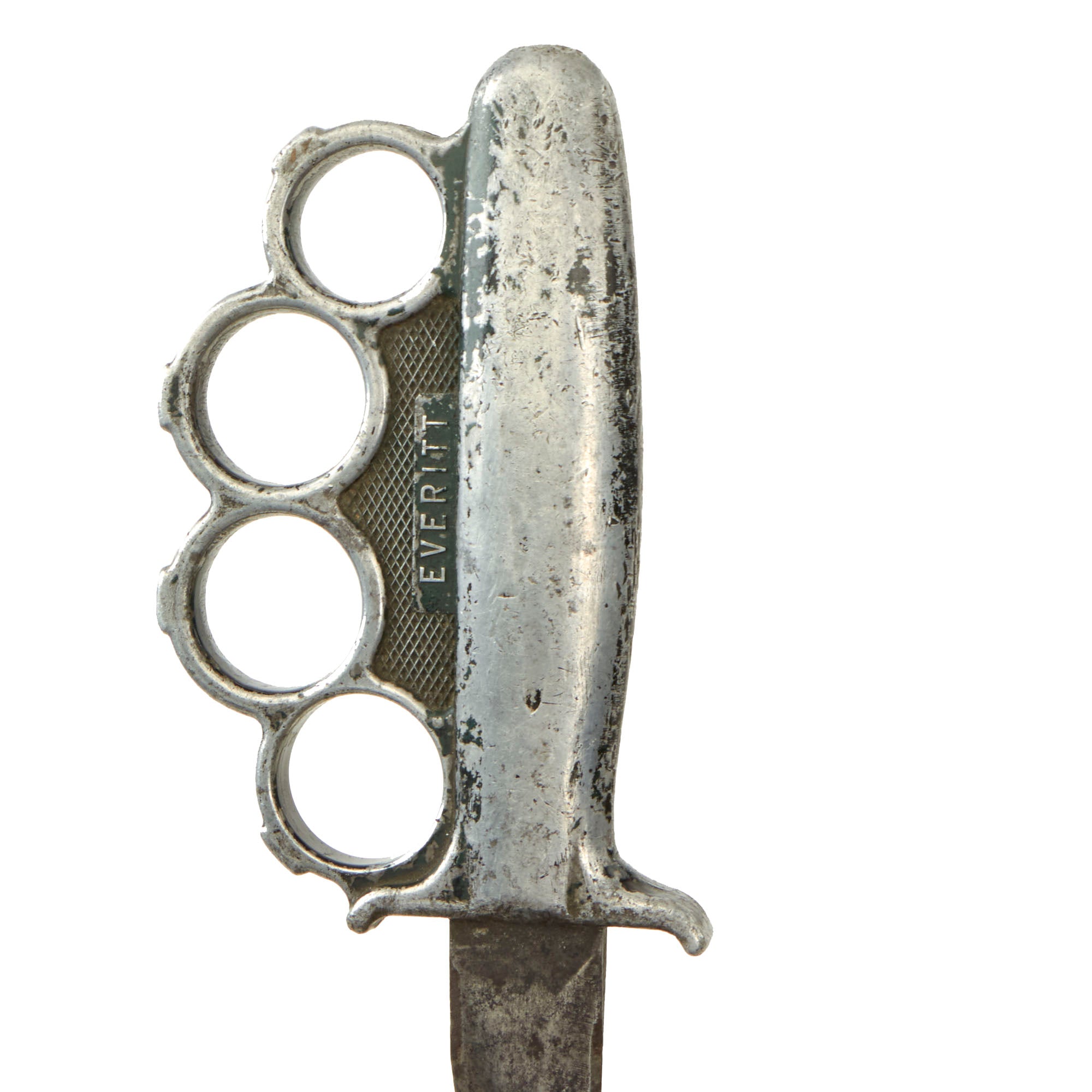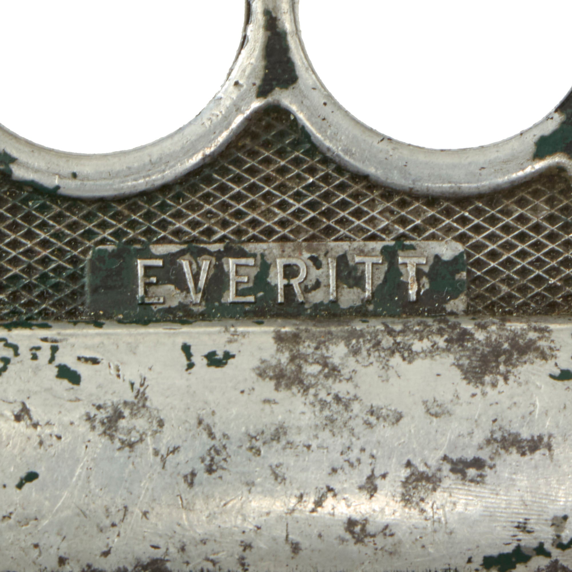 Original Item: Only One Available. This is a lovely example of the rare U.S. WWII Everitt Knuckle fighting knife that features the desirable green painted handle, with the correct original scabbard. No reference indicates that anyone knows who “Everitt” was, or who the company that produced the knives was. Some have surmised that it was the location of manufacture, but due to the passage of time, most likely the true answer will never be known.