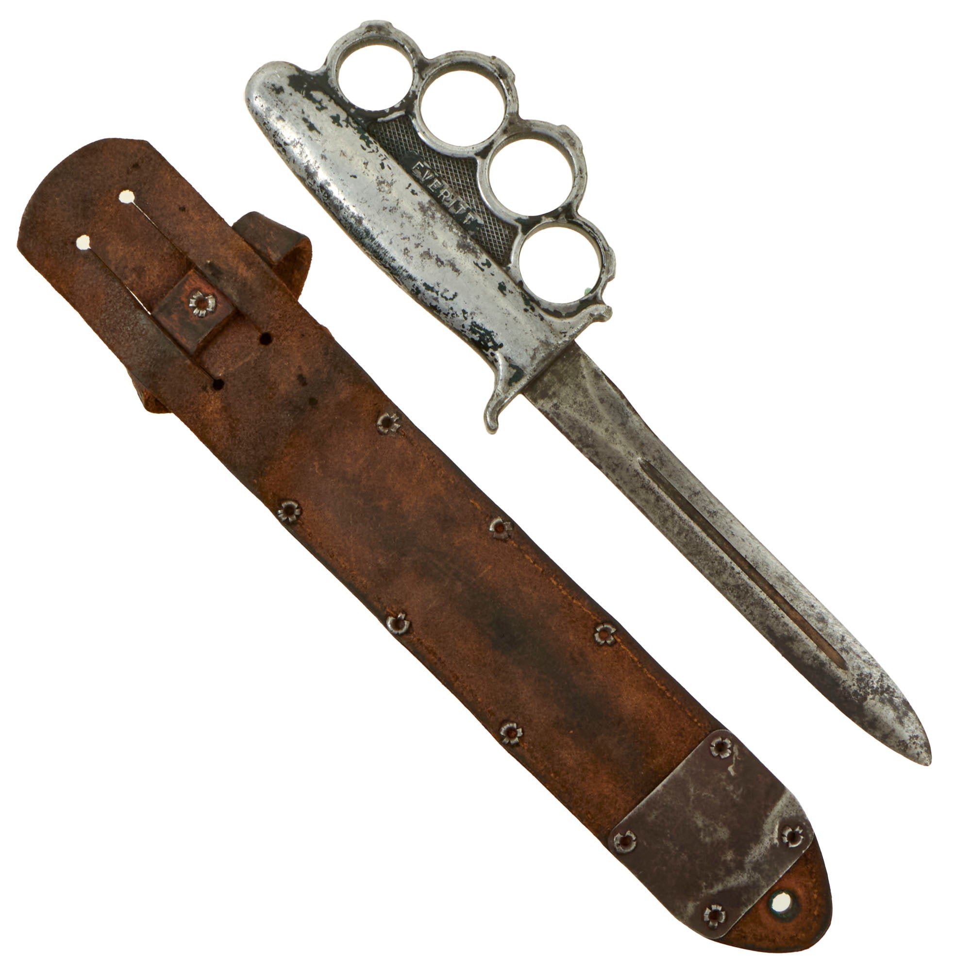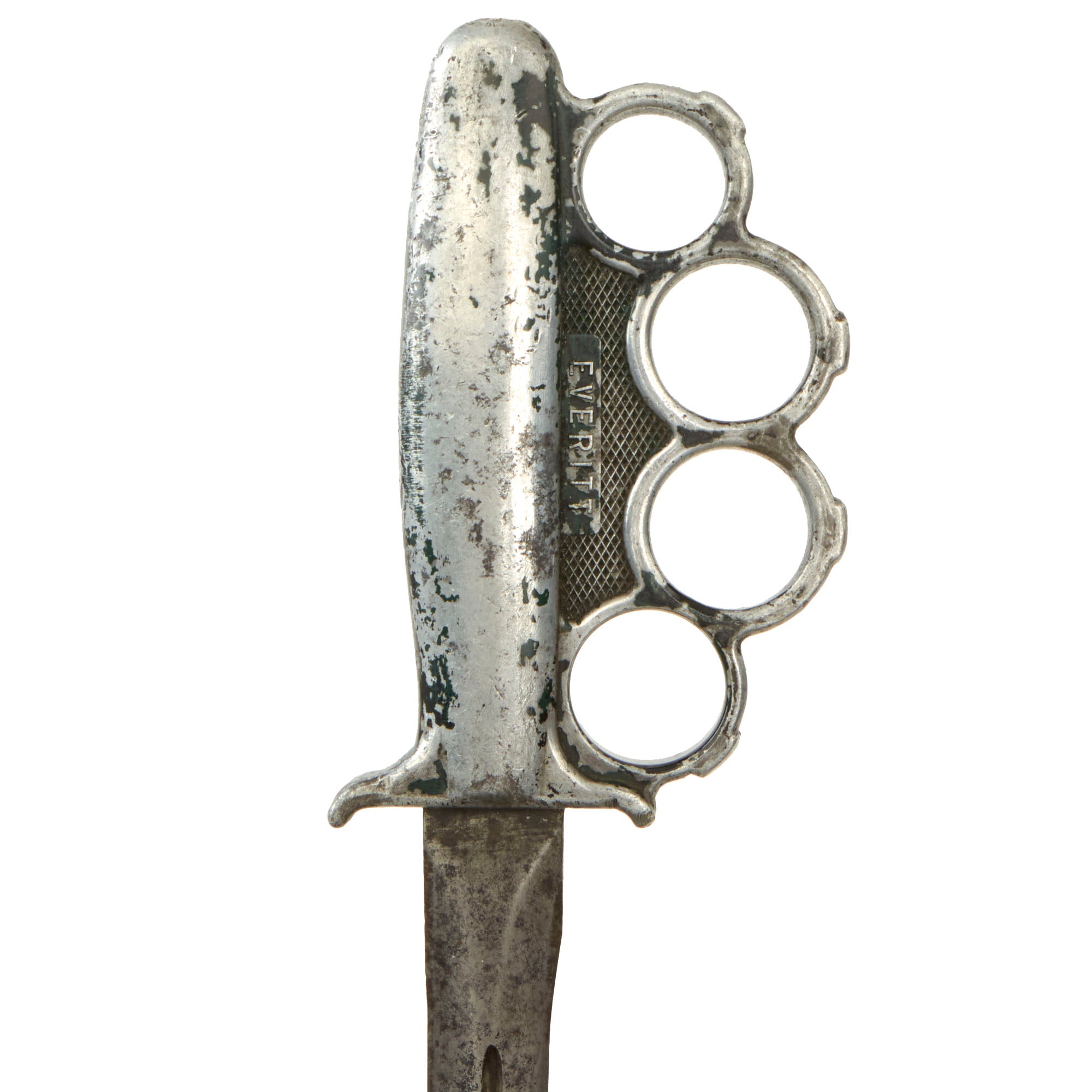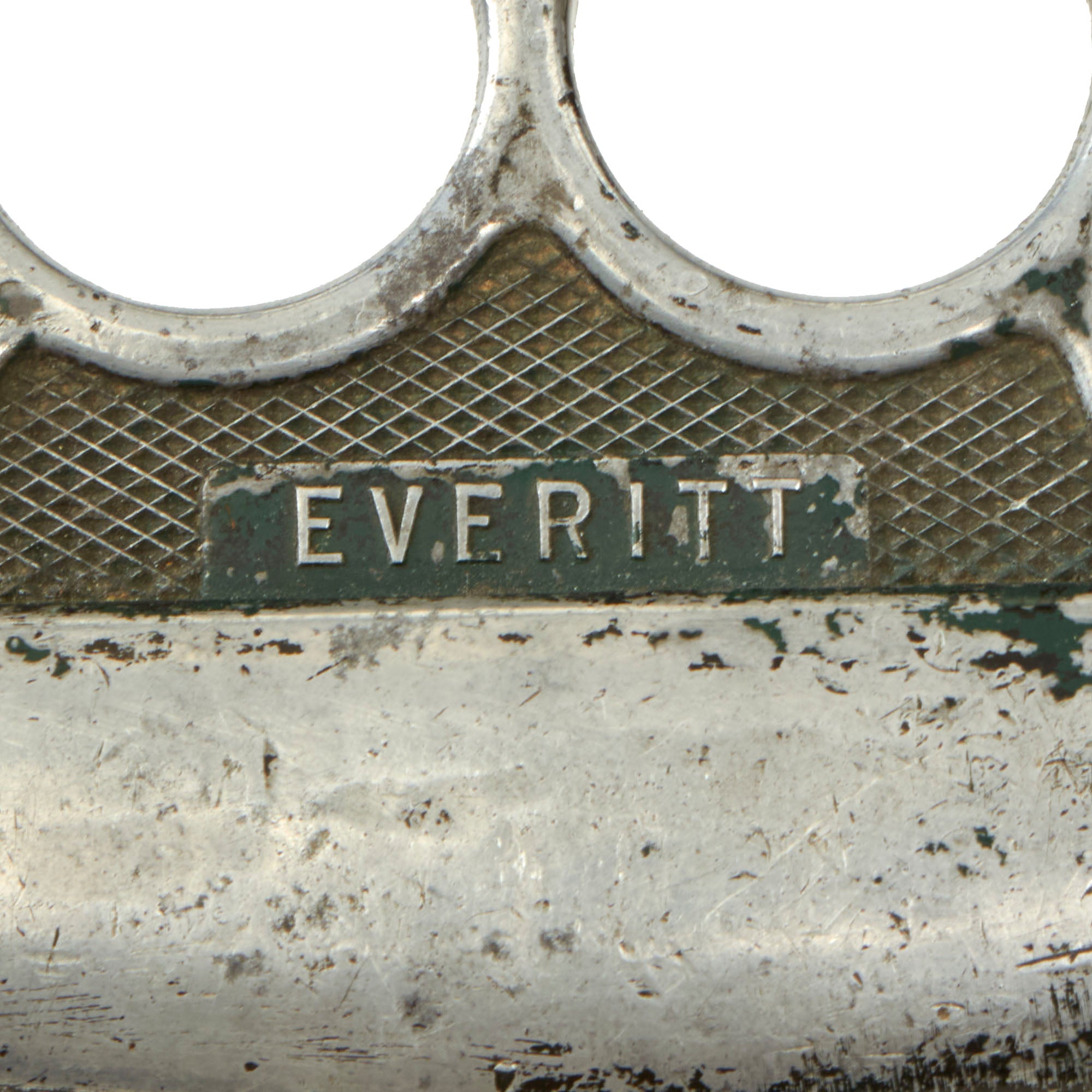 Original Item: Only One Available. This is a lovely example of the rare U.S. WWII Everitt Knuckle fighting knife that features the desirable green painted handle, with the correct original scabbard. No reference indicates that anyone knows who “Everitt” was, or who the company that produced the knives was. Some have surmised that it was the location of manufacture, but due to the passage of time, most likely the true answer will never be known.