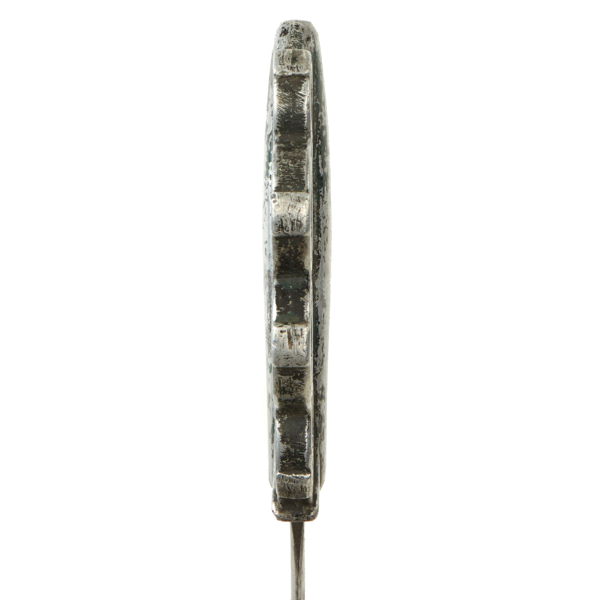 What is known is that these fighting knives were produced for use by US troops in the Pacific Theater of operations, and measure almost 12 inches in overall length. They feature a 5 inch long cast aluminum hilt, with four finger holes, which have small flat raised areas on the outside of each. The "palm" area of the grip is checkered, with a raised EVERITT marking. This is important to note, as most replicas of these have a stamped marking, and lack the proper texture. These knives came with either a black or green enamel paint on the handle, and this example has the less often seen green paint, although it is almost all gone. It retains roughly 25% of the paint.