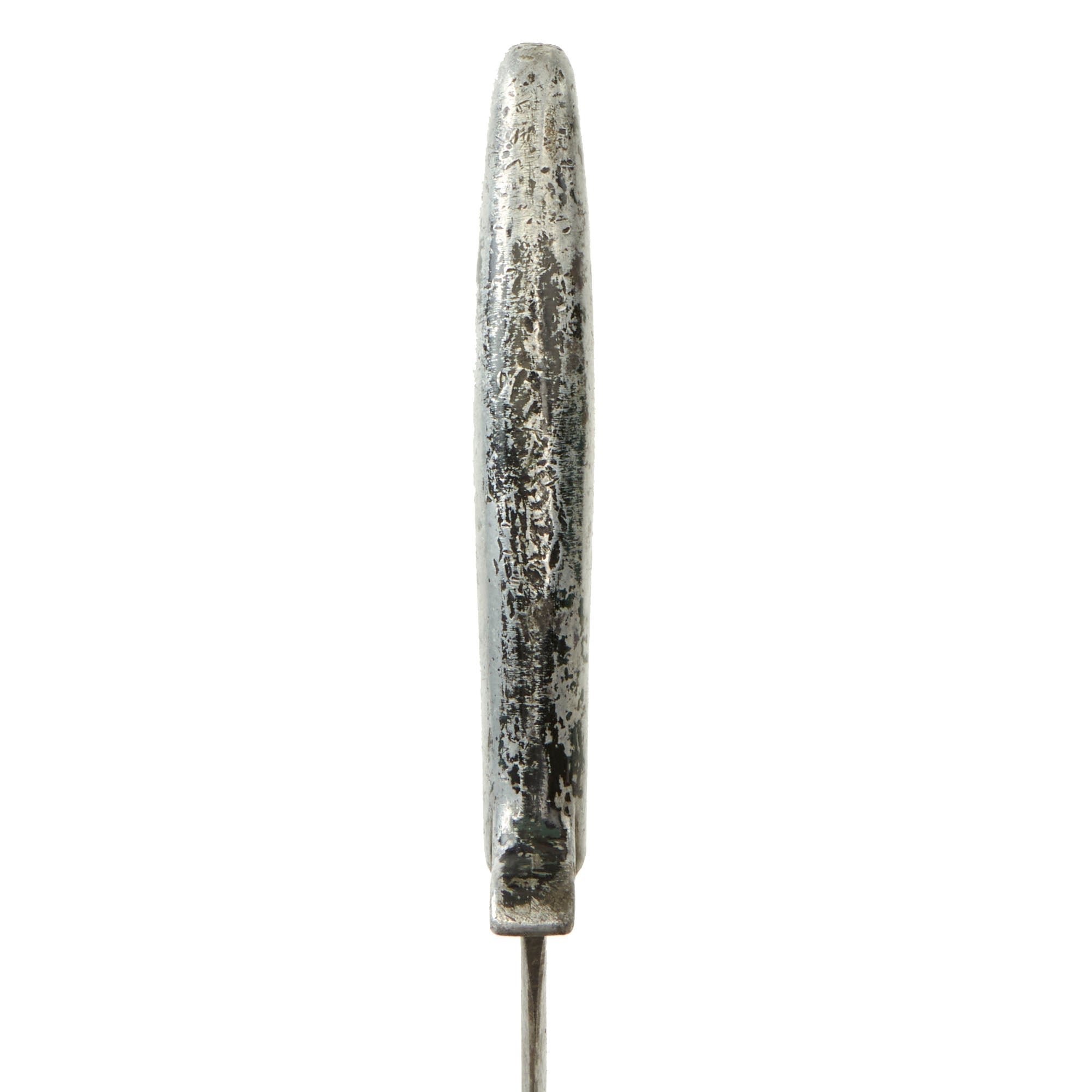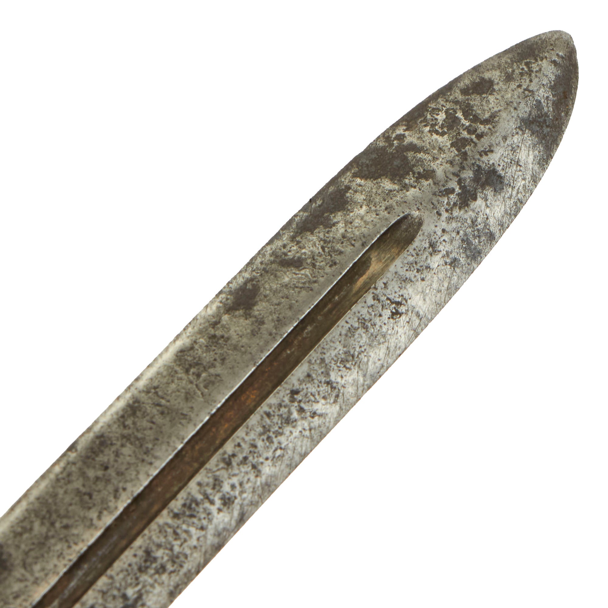 The blade is a simple double-edged spear-point design, which measures about 7 inches long with thin central fullers. The knife is clearly intended for stabbing and only offered limited utility for the other duties that a combat knife might be called upon to deliver. The blades were usually painted with black enamel, and this example retains a bit of that black enamel finish. The tip is also a bit worn down. The blade itself does show signs of use.
