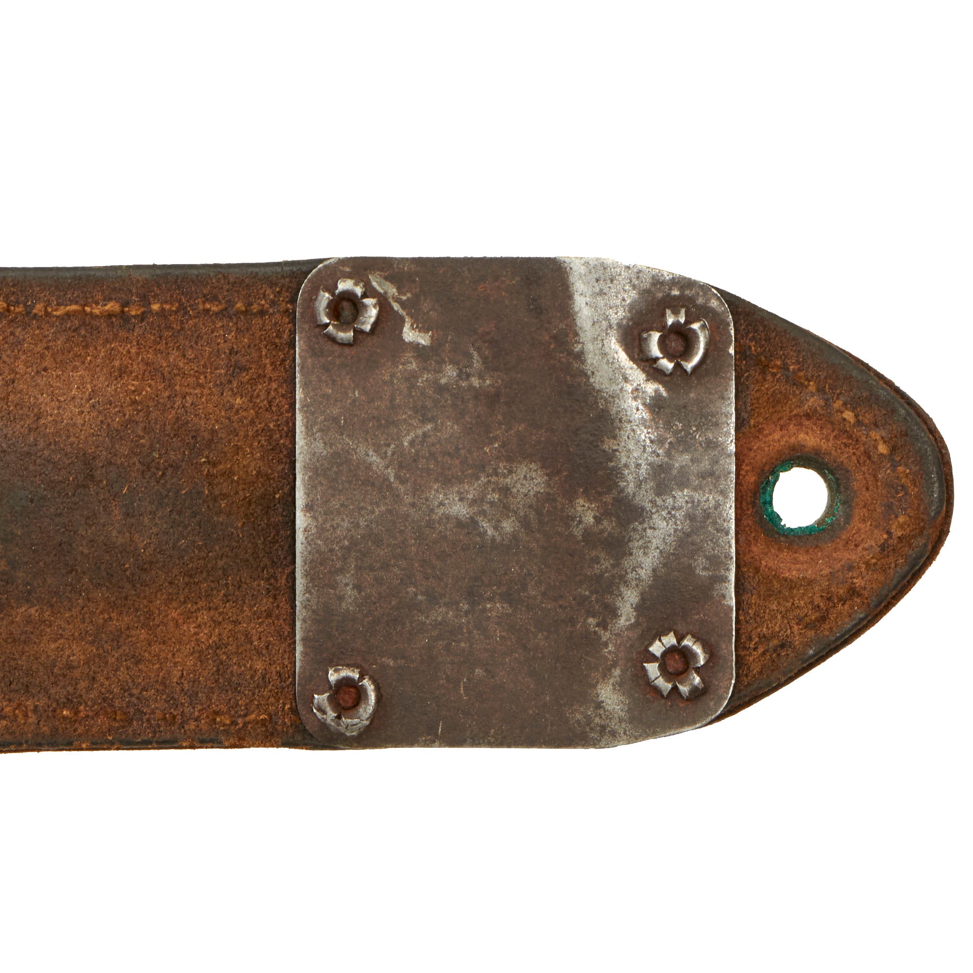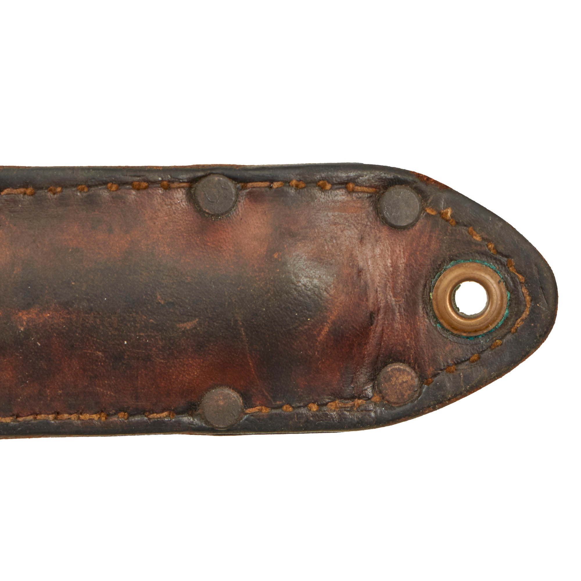 The correct scabbard for these knives are almost rarer than the knife itself, as they are often degraded or lost. This scabbard is absolutely correct, with the 6 staples on the throat, along with 10 round side rivets, and the metal plate on the BACK of the scabbard. The design is somewhat like the M6 leather scabbard, but definitely has some important differences, as can be seen. The scabbard is in good shape, however there is definitely evidence of moisture damage. This side matches the corrosion on the blade, so this knife and scabbard are matched. The retaining loop is still intact, something we never see on these.