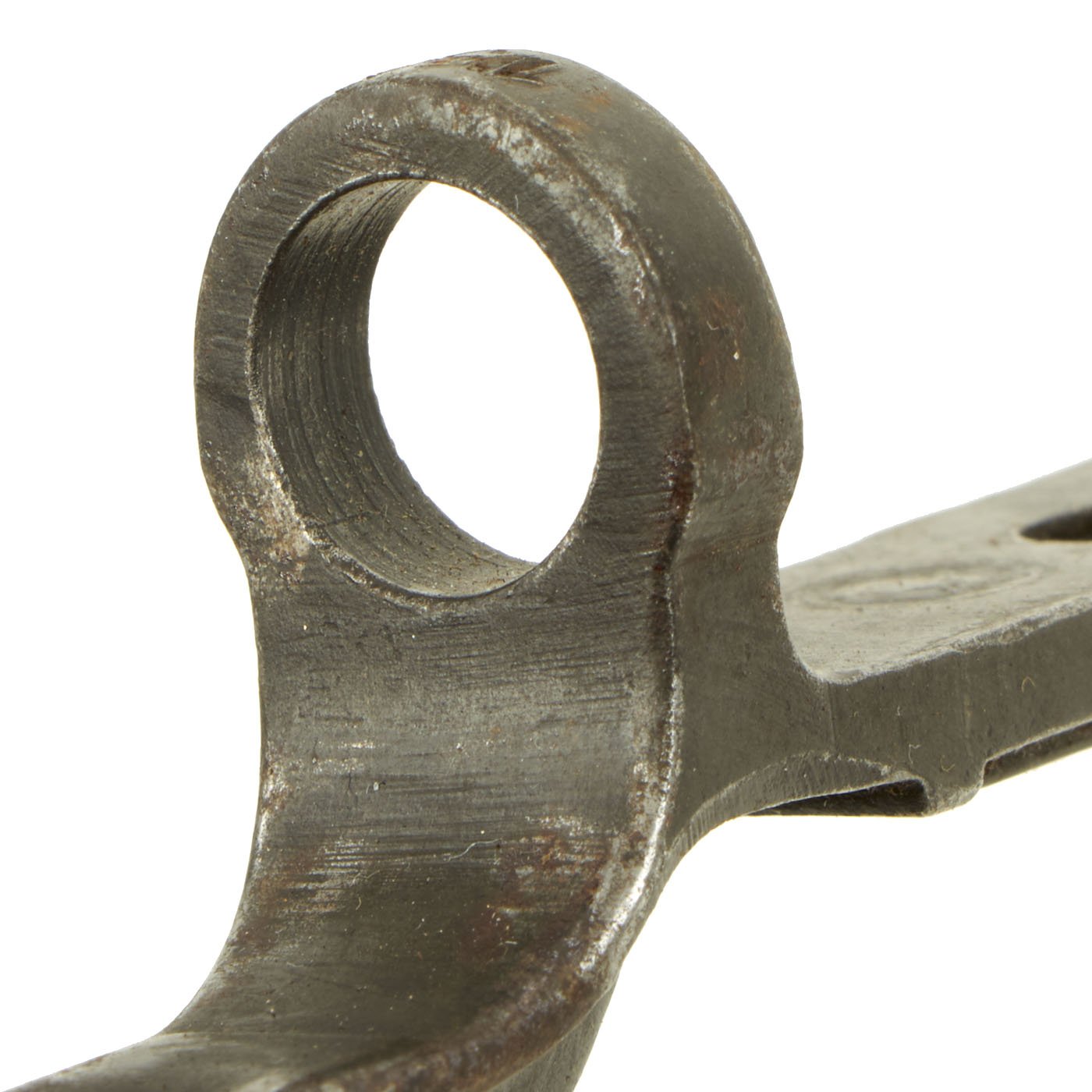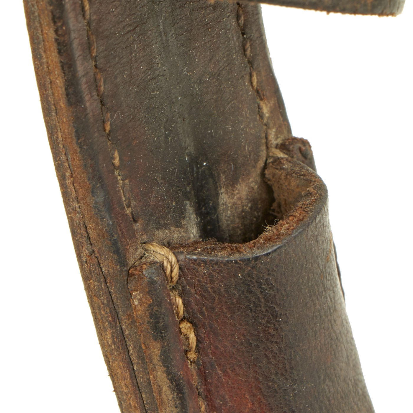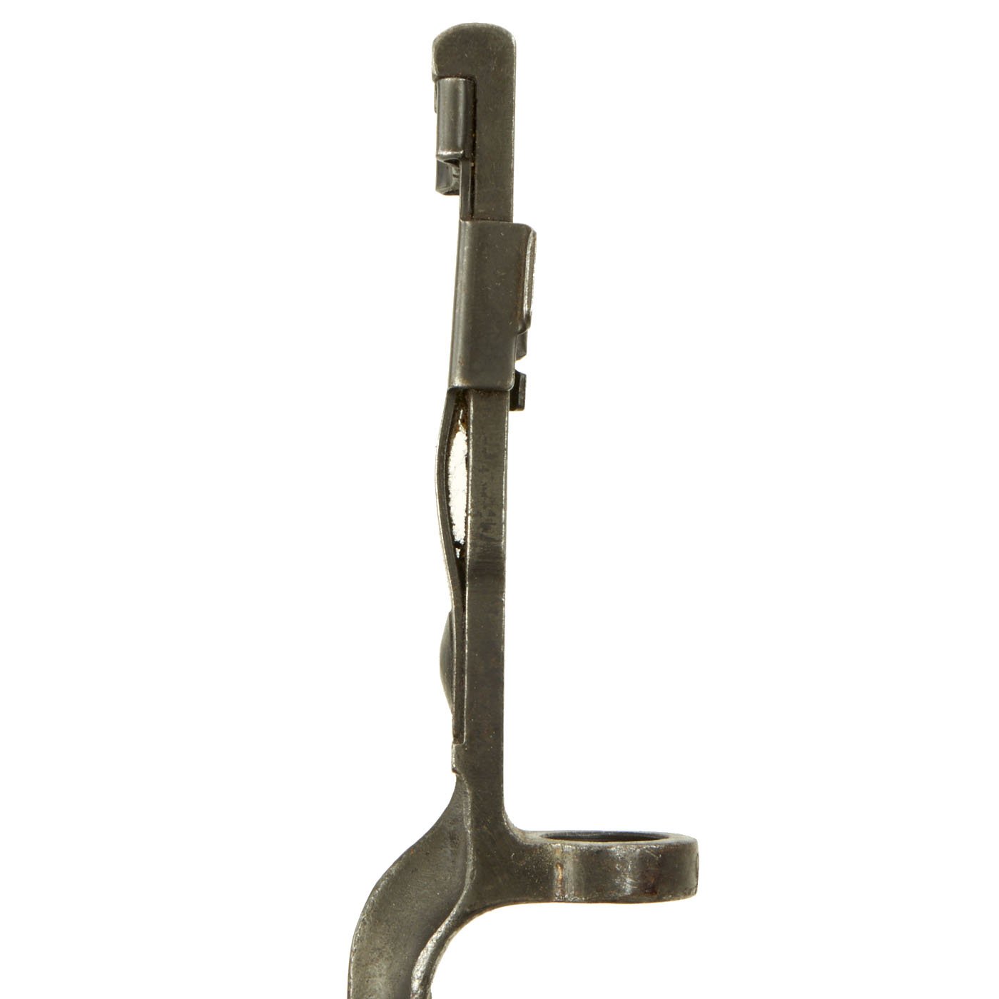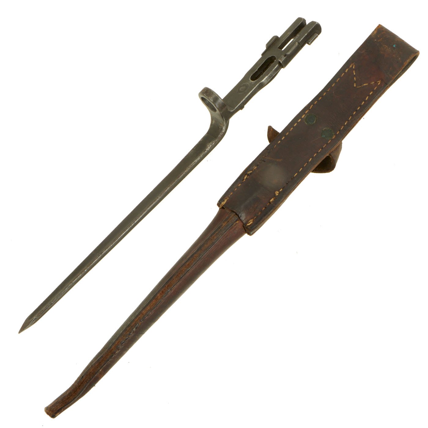 Original Item: Only One Available. This is a very good example of a Model 1941 Johnson rifle bayonet complete with original leather scabbard. The bayonet is numbered 150 on the muzzle ring. The leather scabbard is in very good condition, though the leather is somewhat stiff. It does show some wear, and has matured to a nice dark brown color. The stitching is mostly intact, though it was cut through above the securing strap, as scabbard as issued only had allowance for a 1 inch wide belt. The leather loop on the stud side of the securing strap is missing as well.