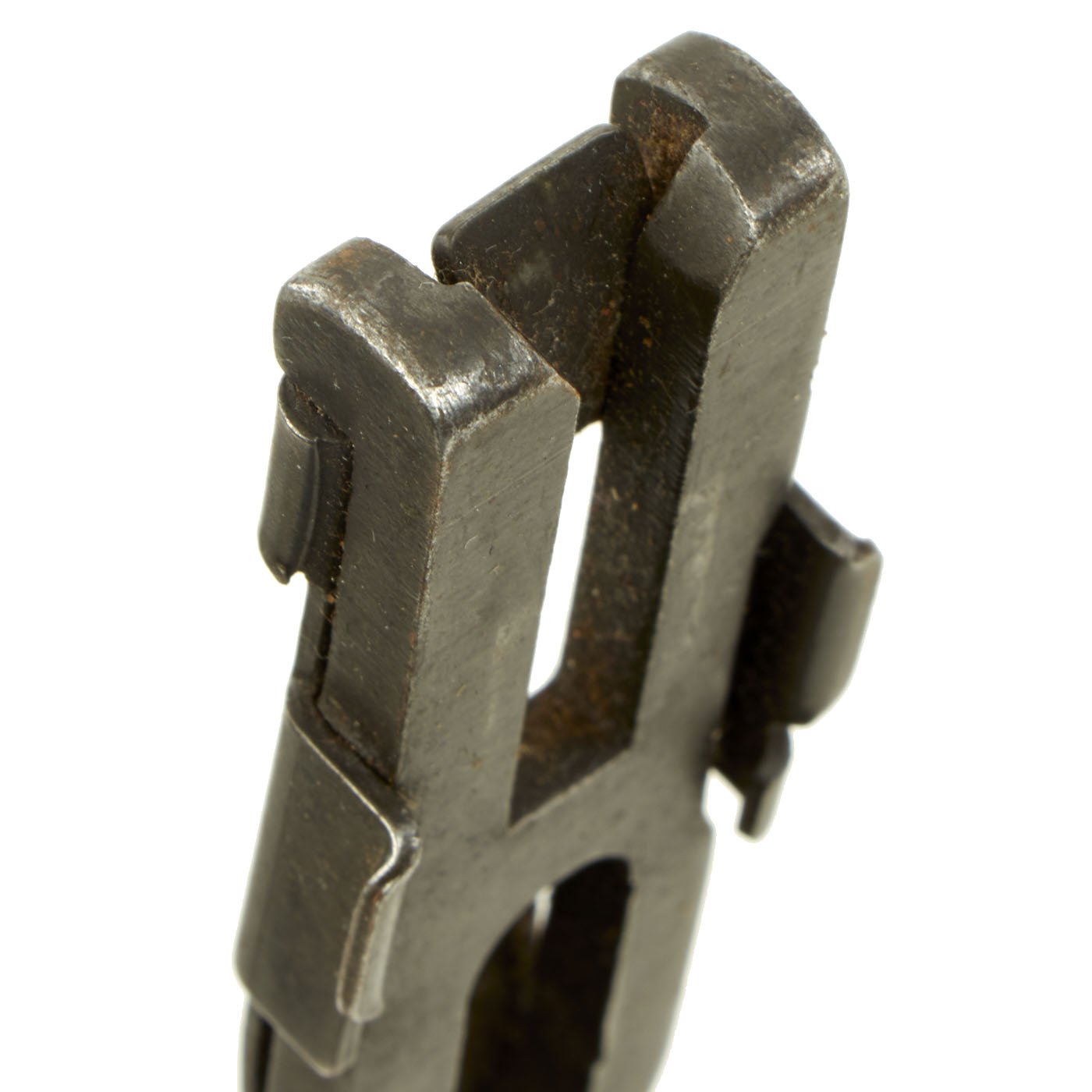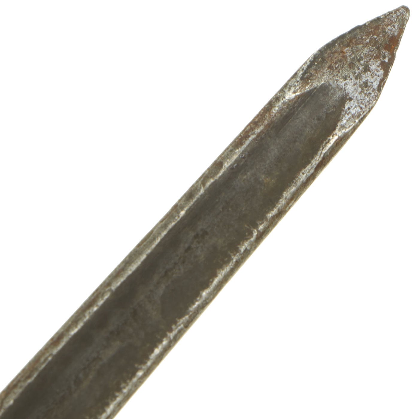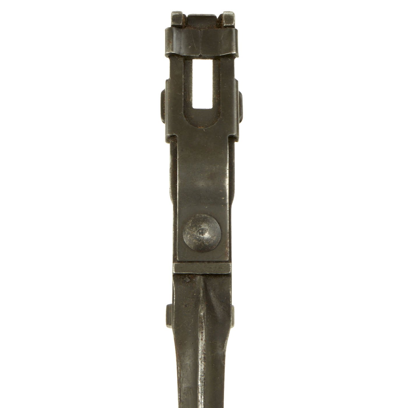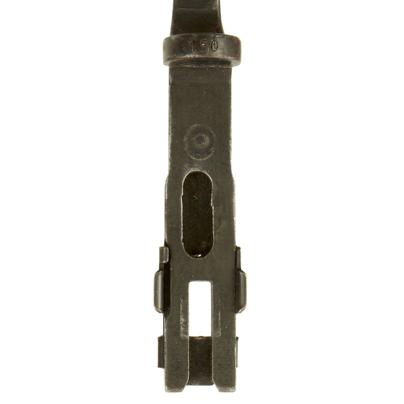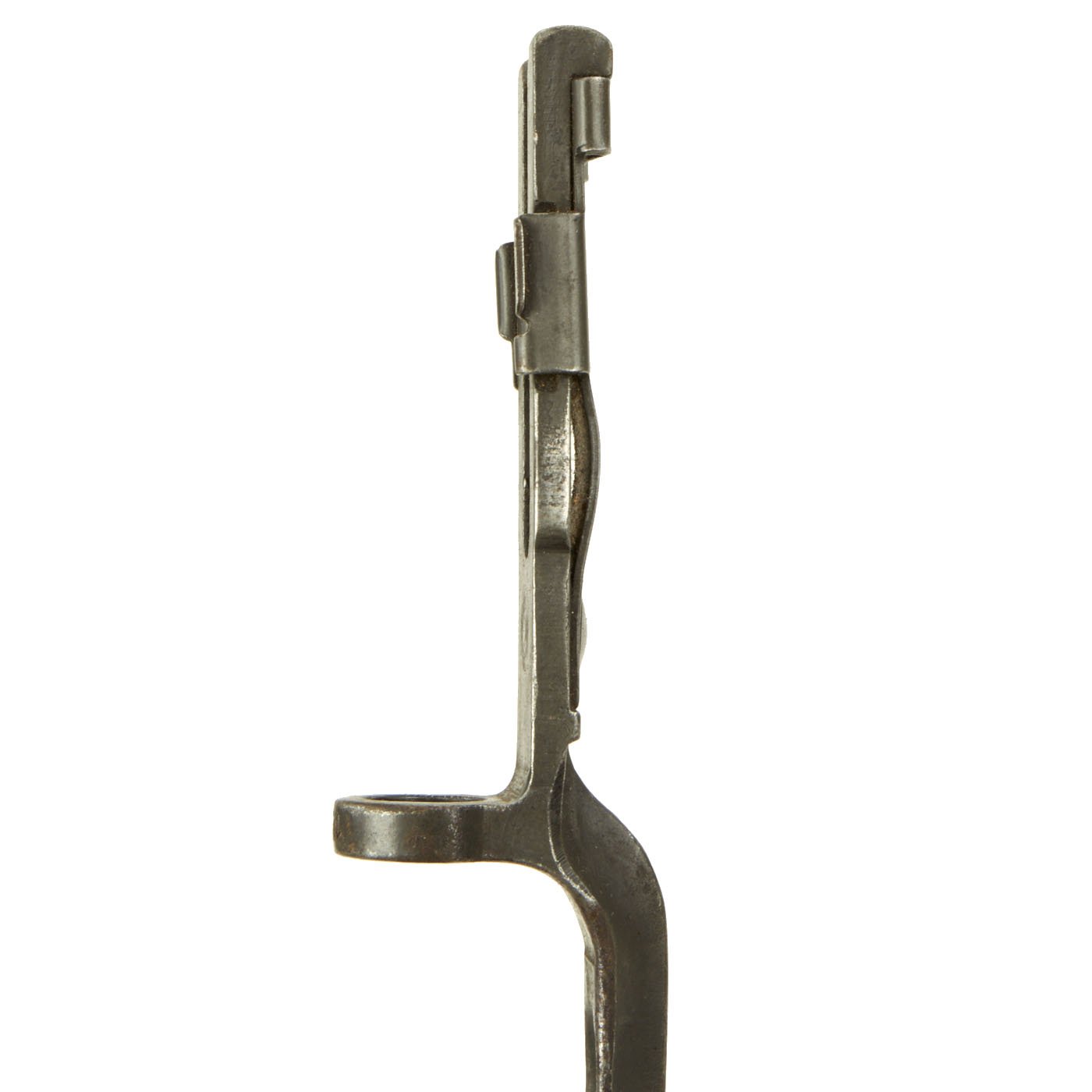 Original Item: Only One Available. This is a very good example of a Model 1941 Johnson rifle bayonet complete with original leather scabbard. The bayonet is numbered 150 on the muzzle ring. The leather scabbard is in very good condition, though the leather is somewhat stiff. It does show some wear, and has matured to a nice dark brown color. The stitching is mostly intact, though it was cut through above the securing strap, as scabbard as issued only had allowance for a 1 inch wide belt. The leather loop on the stud side of the securing strap is missing as well.
