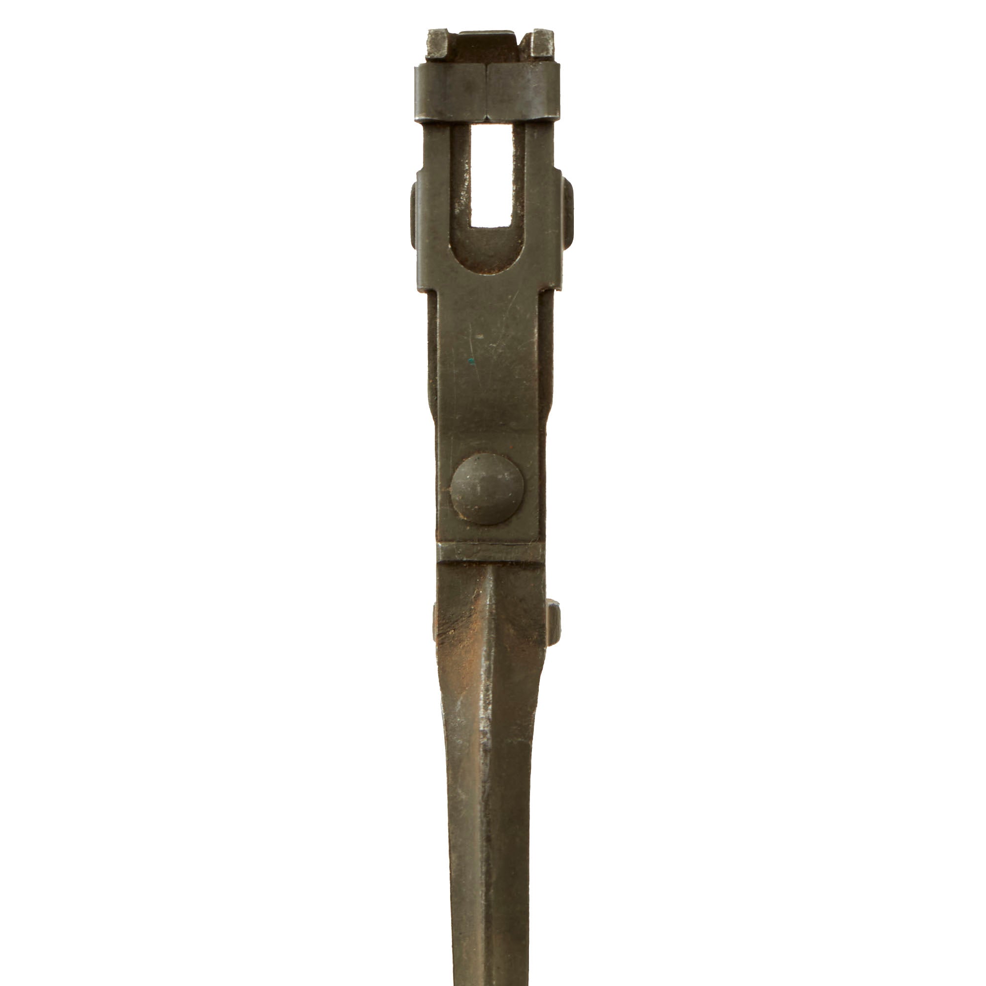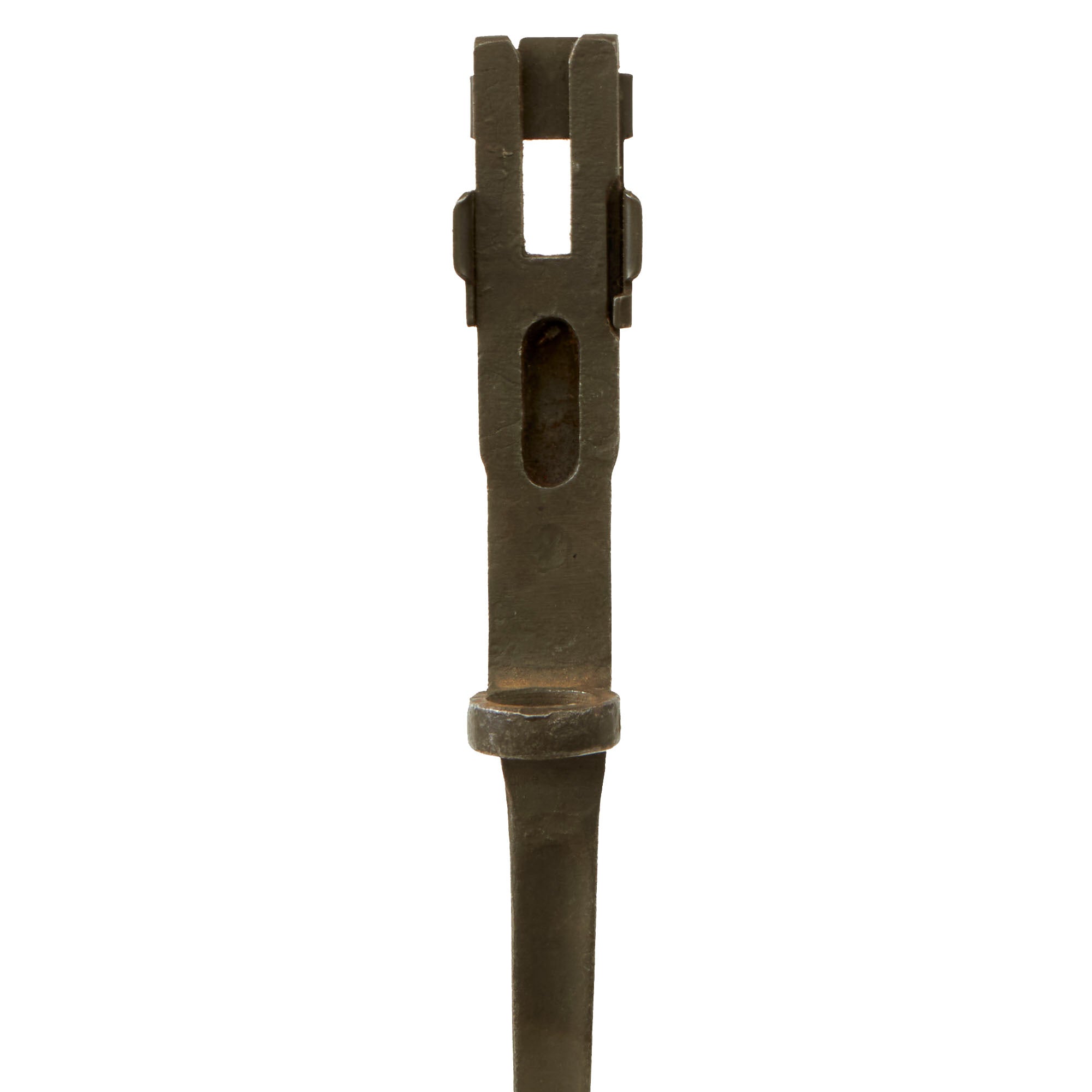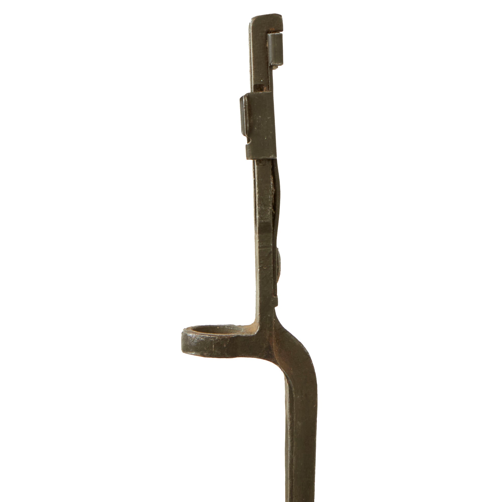 Original Item: Only One Available. This is a very good example of a Model 1941 Johnson rifle bayonet complete with original leather scabbard. Some of these we have seen have a serial number on the spring or muzzle ring, however this example is unmarked. The leather scabbard is in very good condition, though the leather is somewhat stiff. It does show some wear, and has matured to a nice dark brown color. The stitching is mostly intact, though it was cut through above the securing strap, as scabbard as issued only had allowance for a 1 inch wide belt.