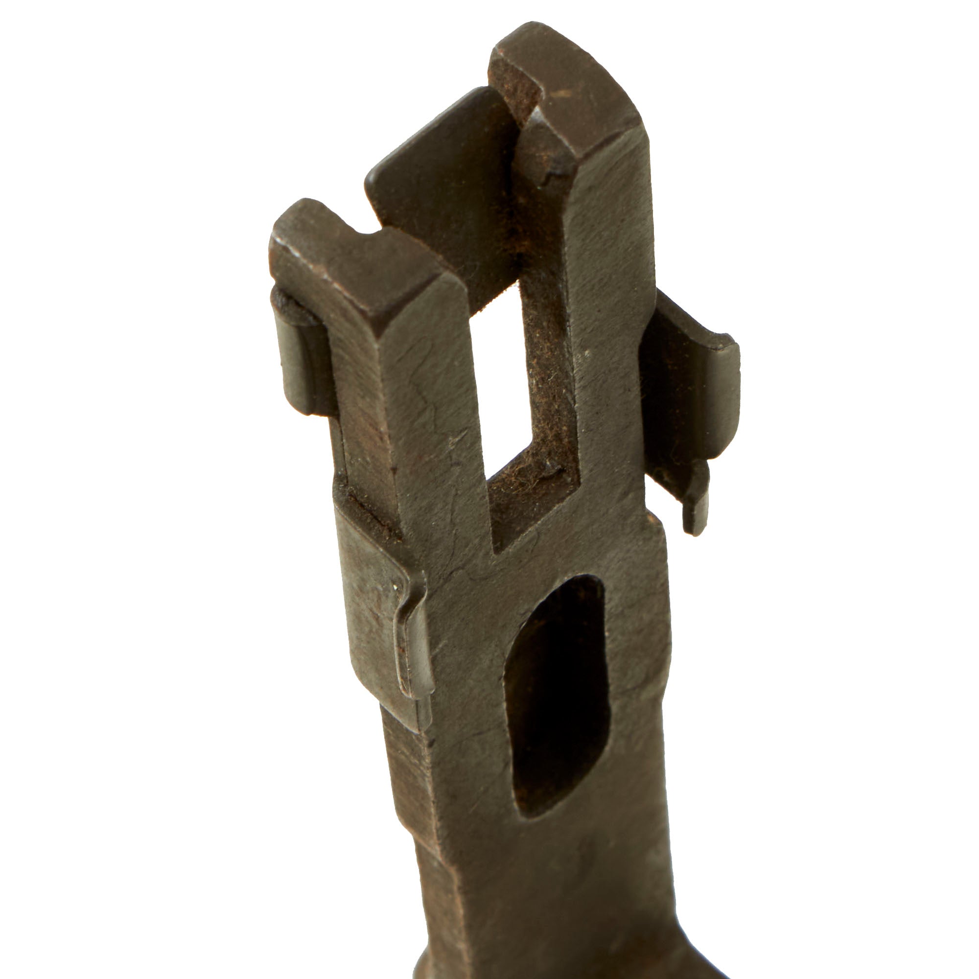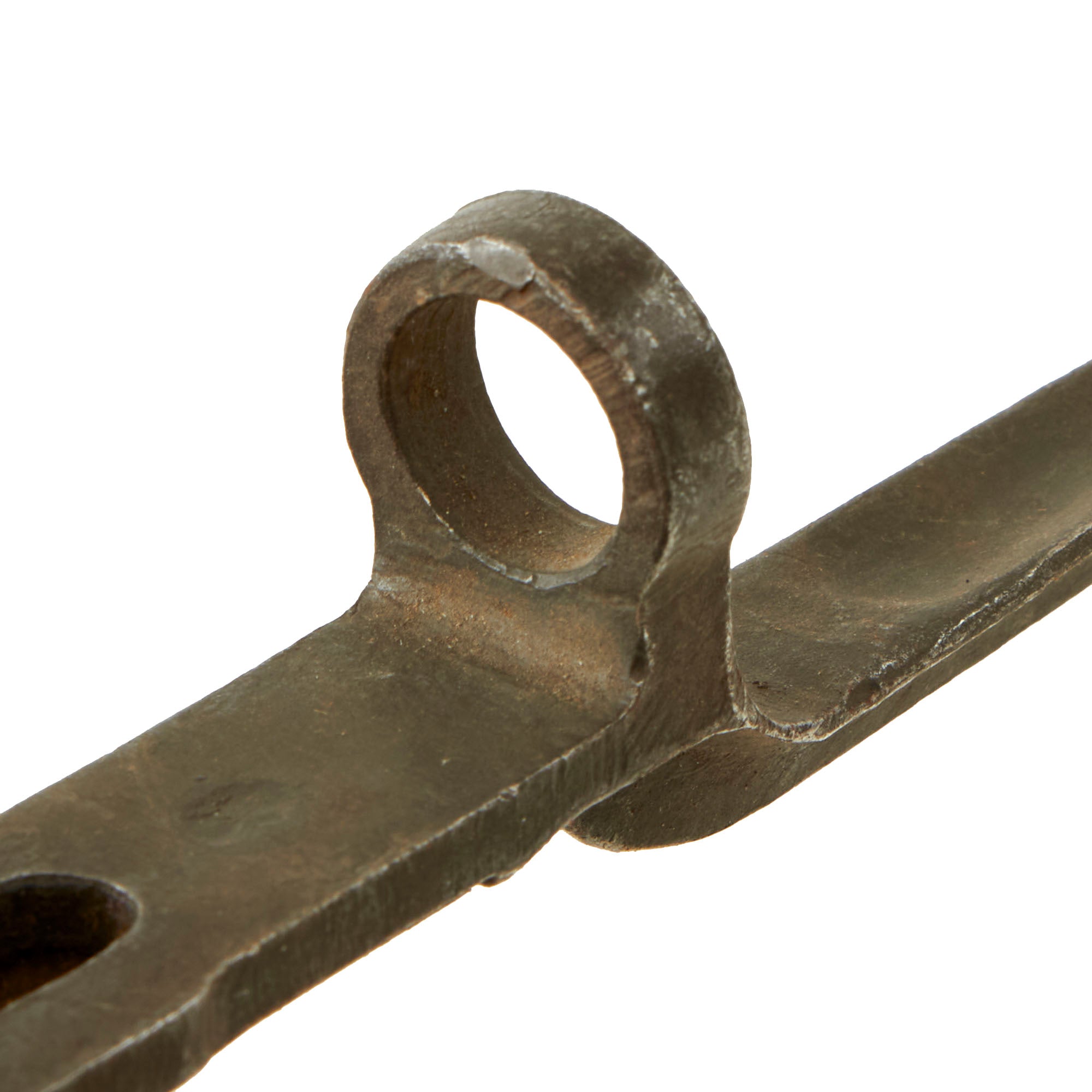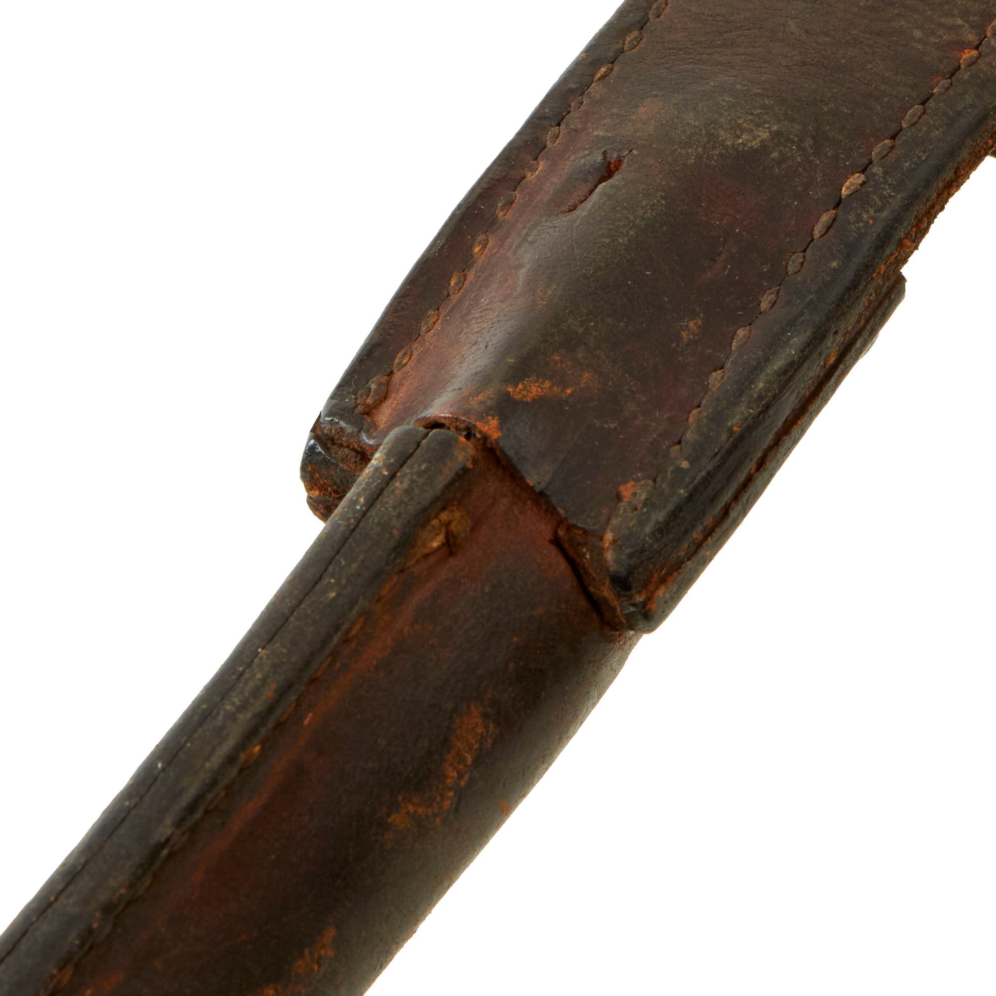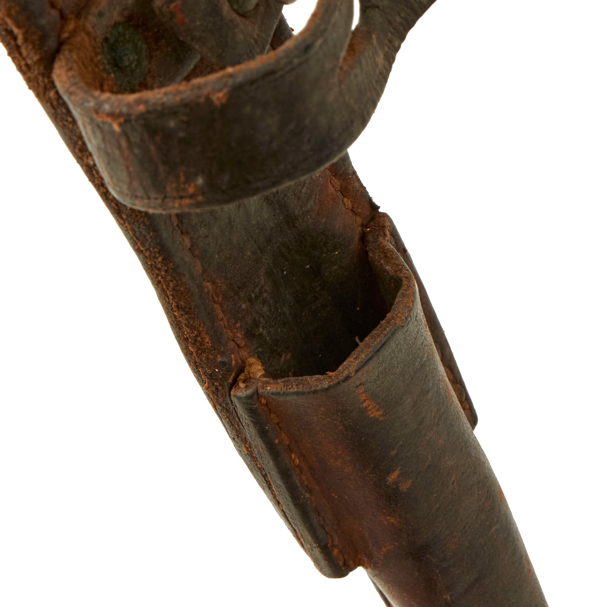 Original Item: Only One Available. This is a very good example of a Model 1941 Johnson rifle bayonet complete with original leather scabbard. Some of these we have seen have a serial number on the spring or muzzle ring, however this example is unmarked. The leather scabbard is in very good condition, though the leather is somewhat stiff. It does show some wear, and has matured to a nice dark brown color. The stitching is mostly intact, though it was cut through above the securing strap, as scabbard as issued only had allowance for a 1 inch wide belt.