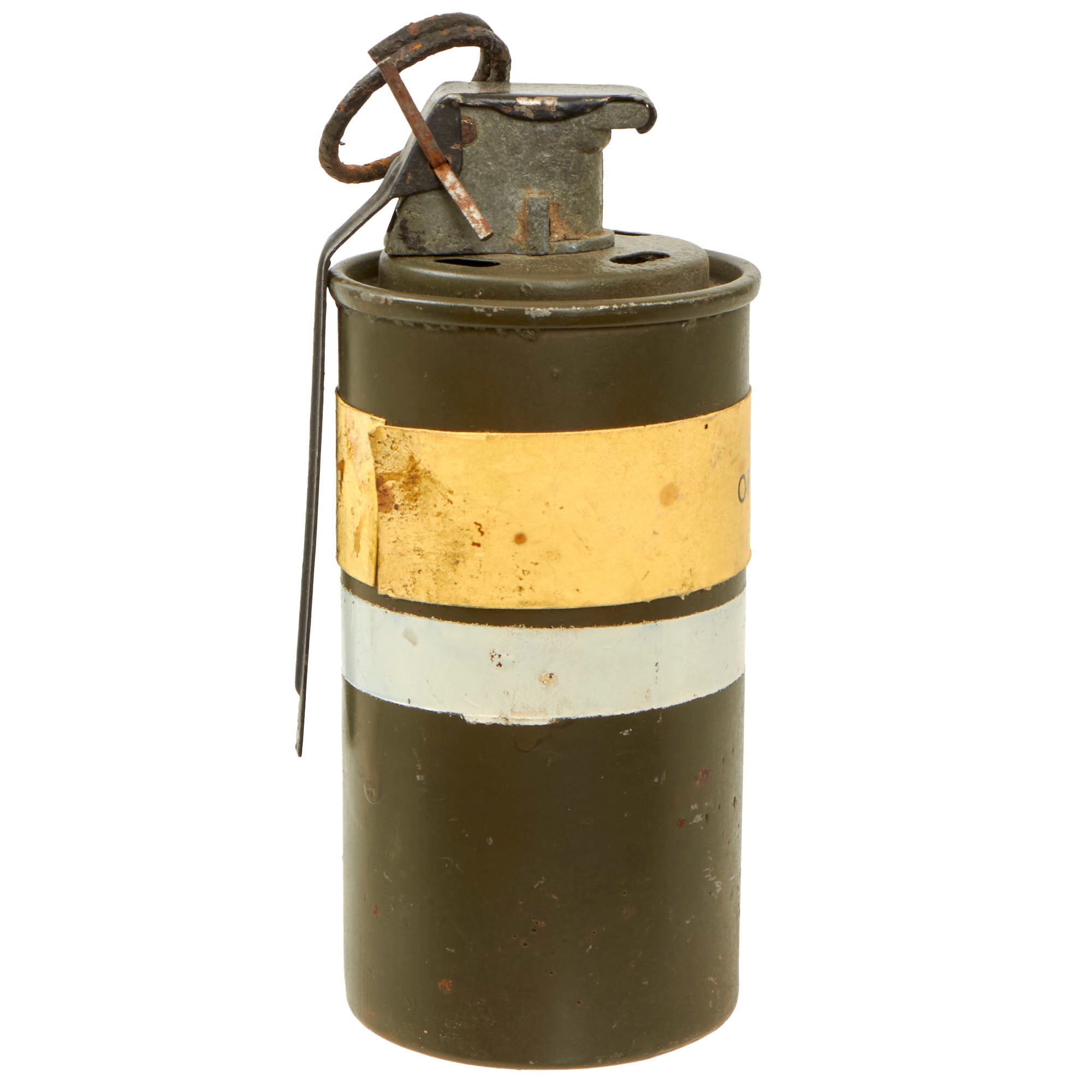 The body of the grenade measures 4½” tall with a 2⅜” diameter. The fuse screws off well but is a bit oxidized, and the pull ring is heavily oxidized. The fuze is not marked at all. There is peppering across the body which is under the green paint, meaning it’s been repainted at one point.