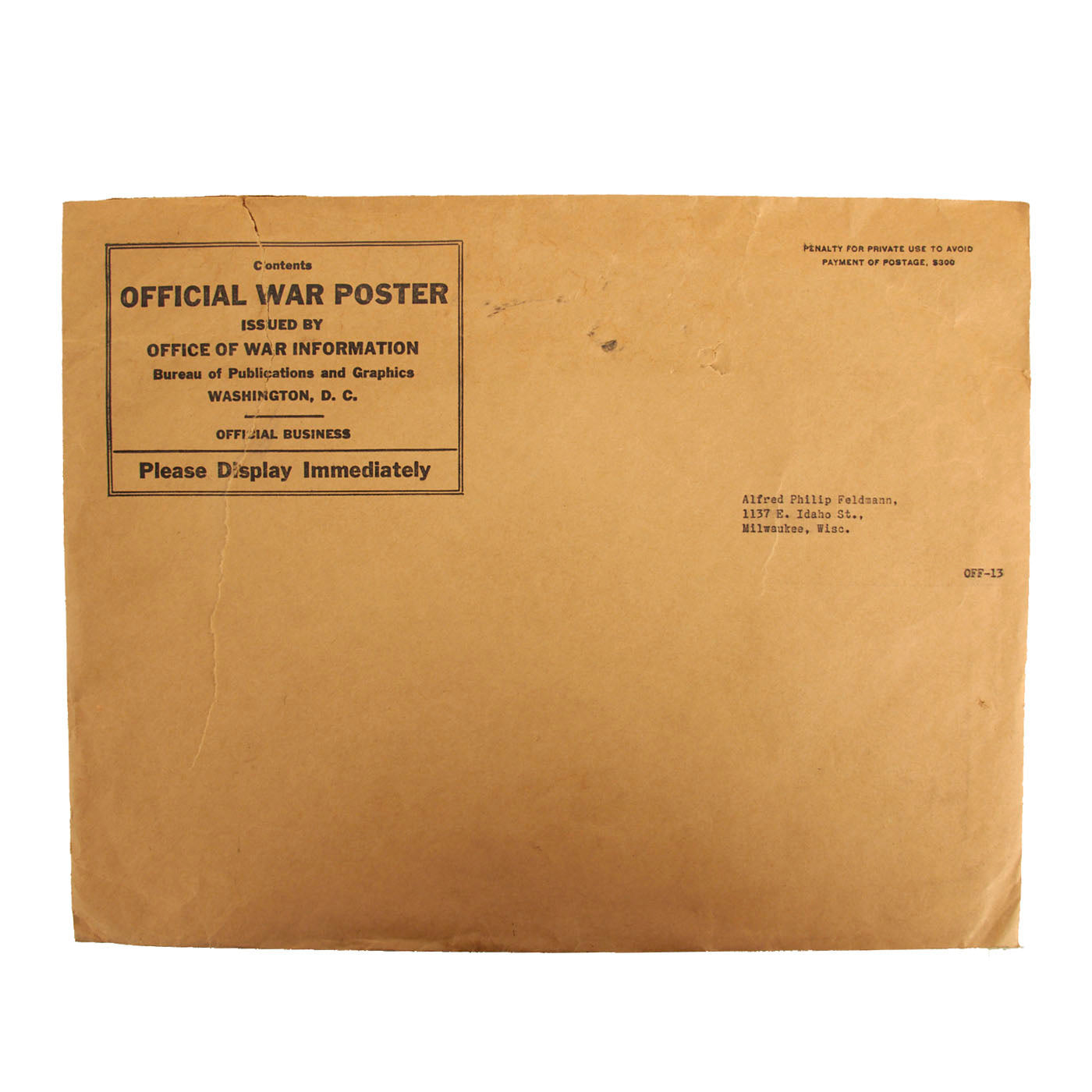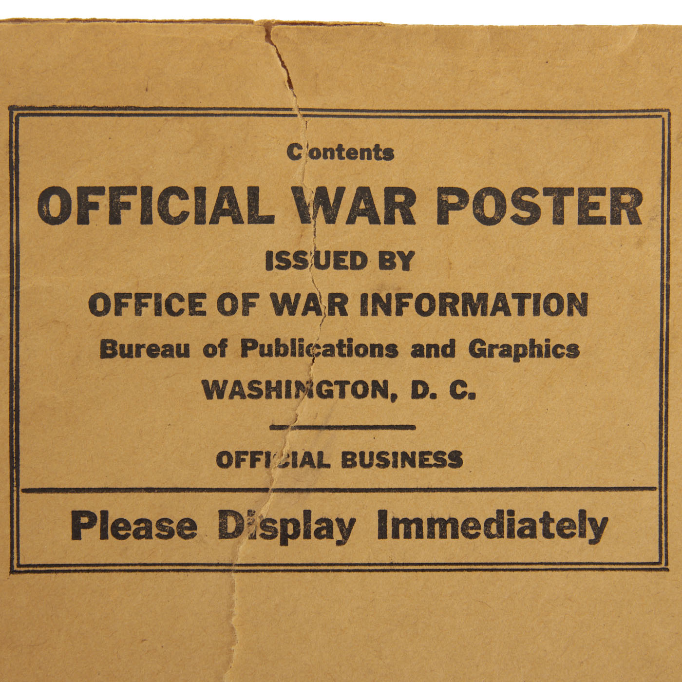 This iconic poster unfortunately does have tearing (taped) and wear present. There are creases present which is ok as they were made during the distribution process during the war and the envelope comes with it as proof! These envelopes are rather rare as most of them were discarded after removing the poster, so to find them is incredible. The envelope does have tearing present which is repaired with clear tape from the inside. The poster comes more than ready to be mounted, framed and displayed!