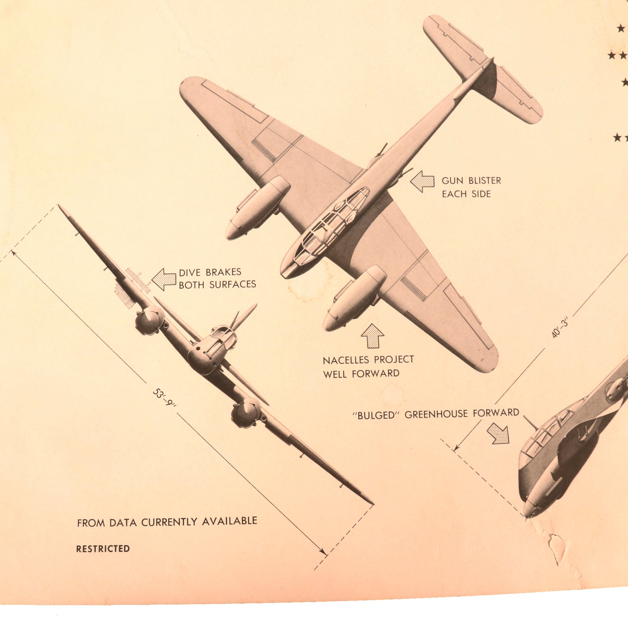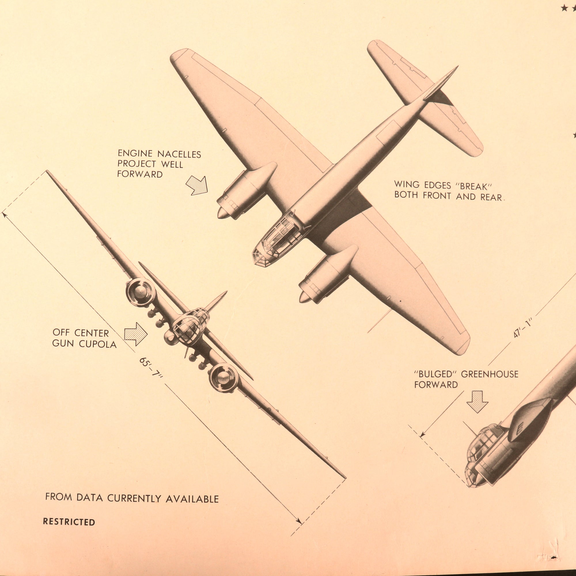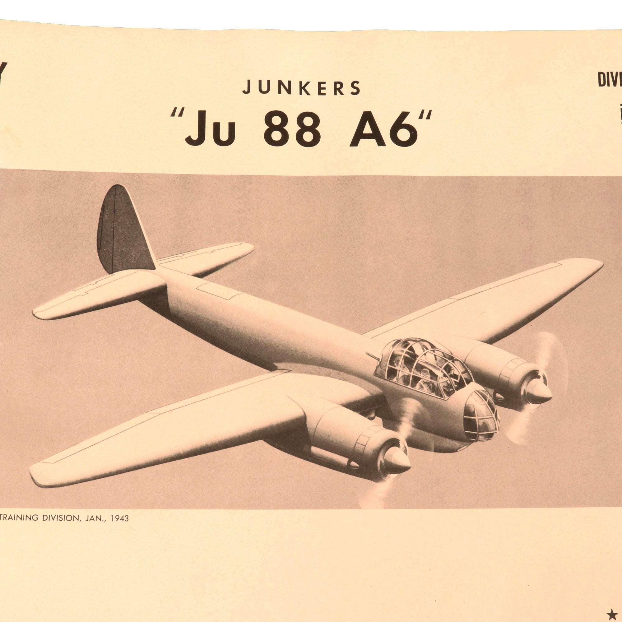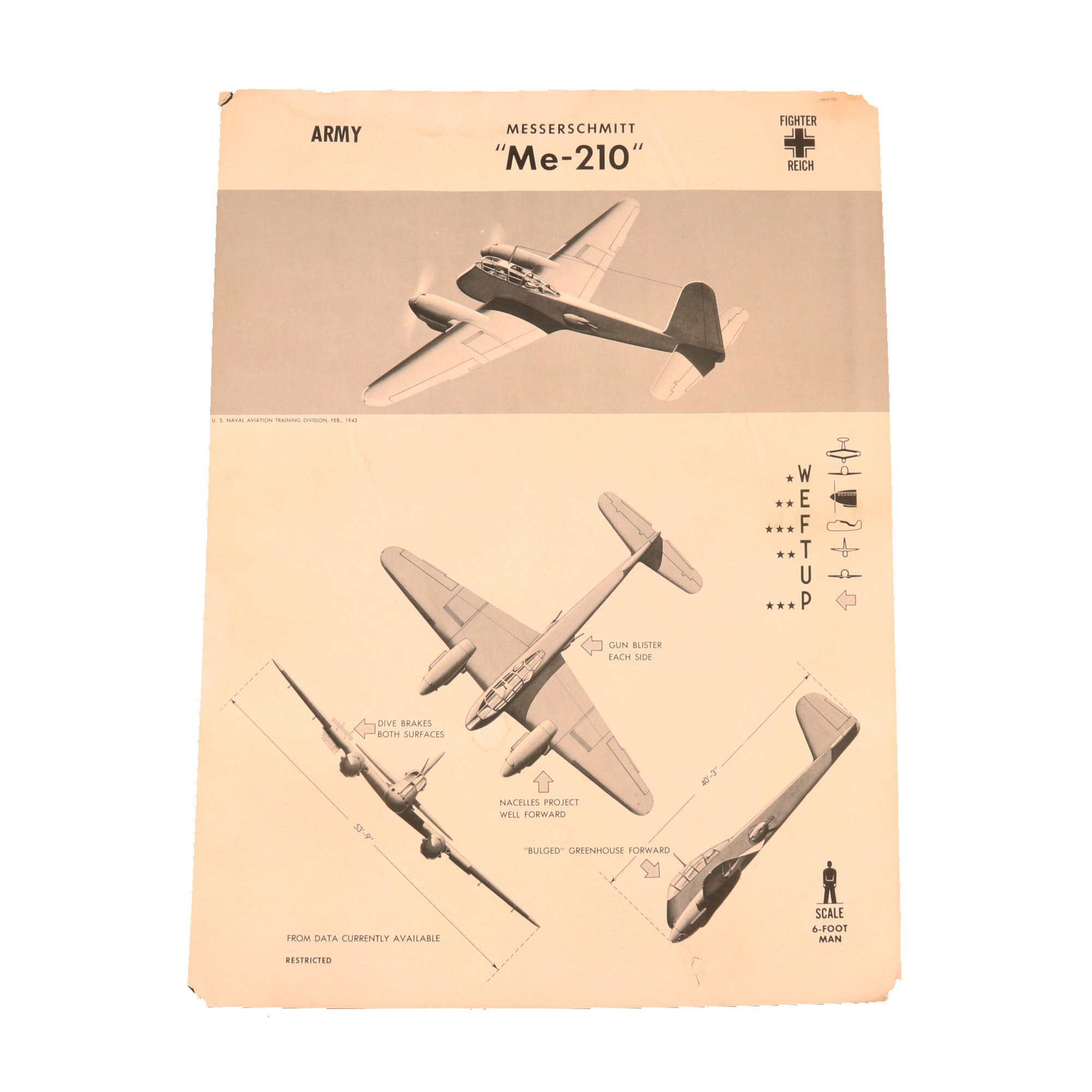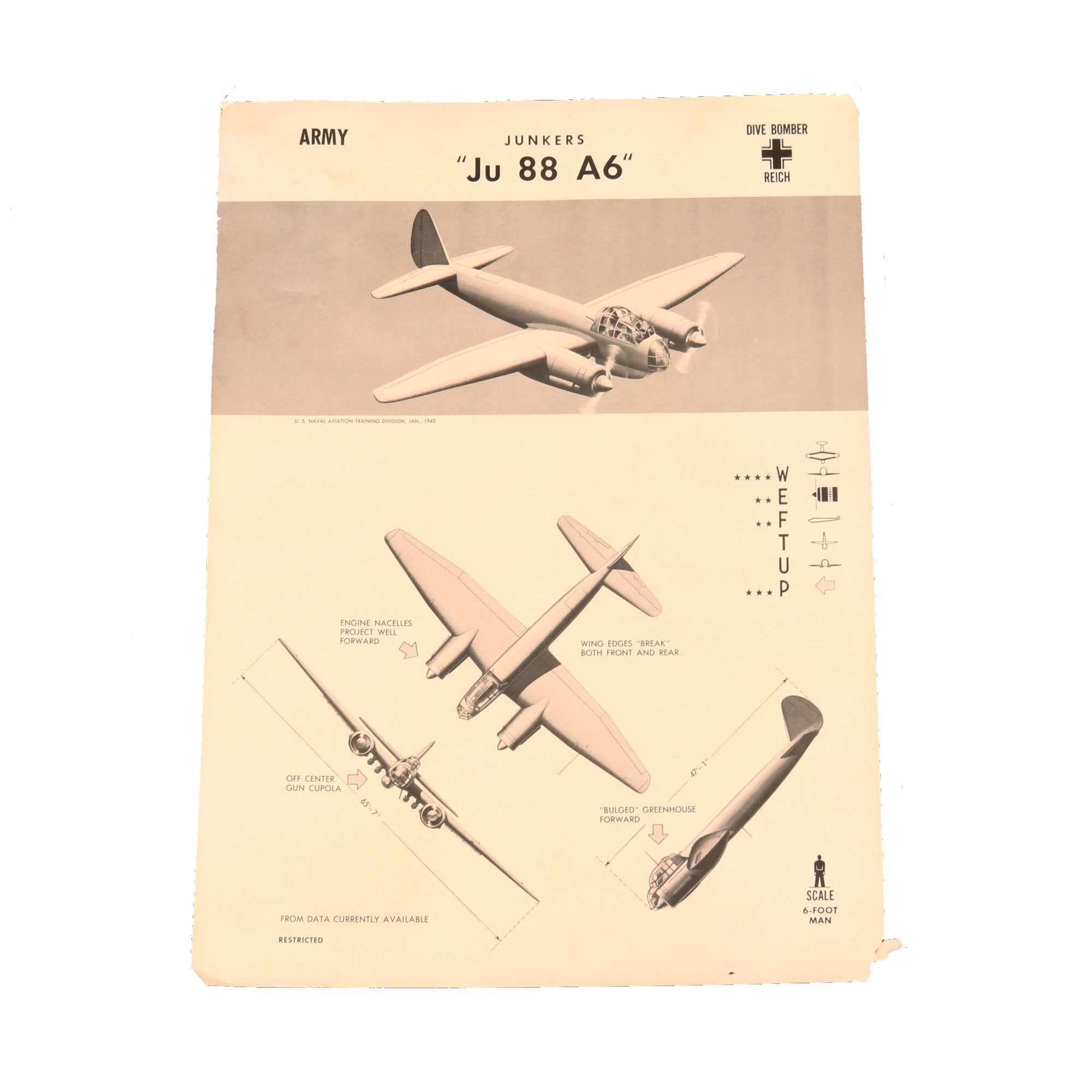 Original Items. Only One Lot Available. This is a lovely lot of two recognition posters used by the U.S. Army to help soldiers identify enemy aircraft based on silhouettes and different angles. Posters such as these also would have been posted up in public places on the homefront and around military installations to familiarize friendly from foe. Both are in fair condition with some issues.The first depicts the Messerschmitt Me-210, showing the bomber from several angles with a 6-foot man for sale. This poster has small tears at all four corners. It’s marked Restricted at the bottom.The second depicts the Junkers Ju 88 A6, showing the aircraft from several angles with a 6-foot man for sale. This poster has small tears at all four corners. It’s marked Restricted at the bottom.Both posters measure 18½ x 24¾” and would look best framed. A lovely pair of posters, ready for framing and display.