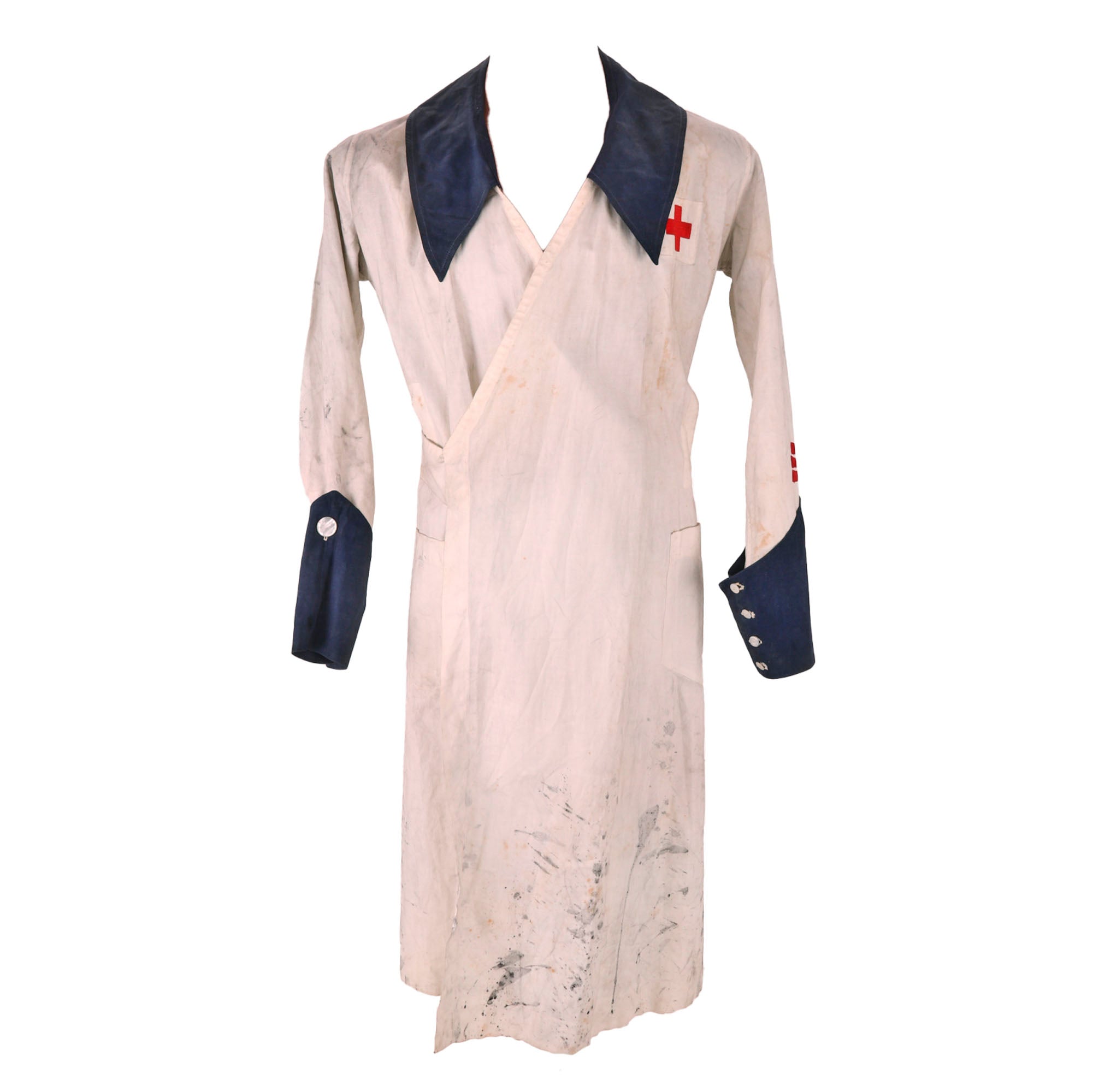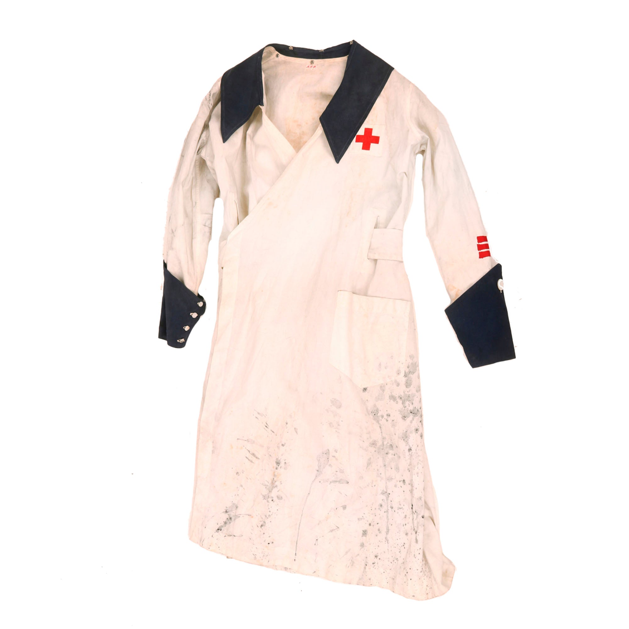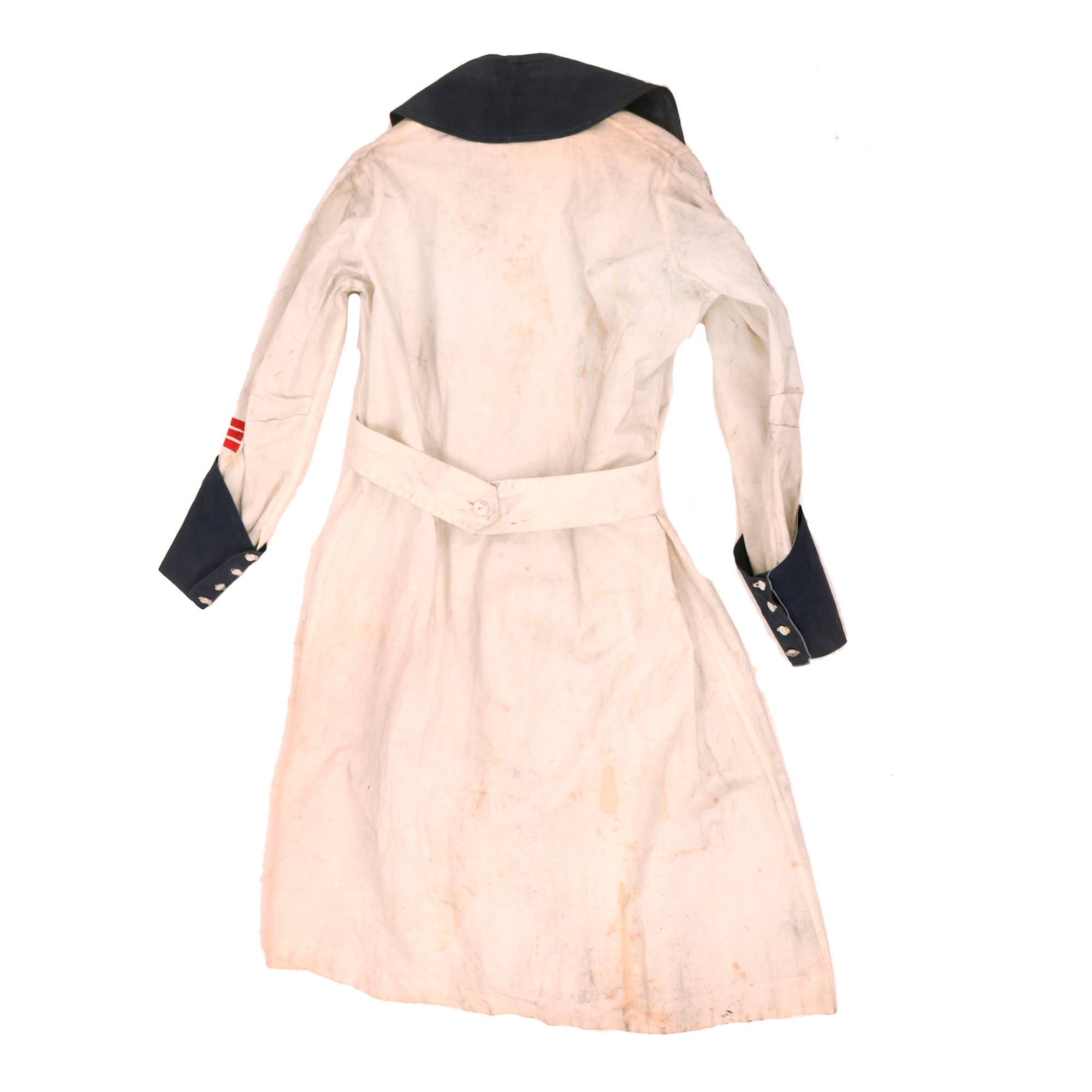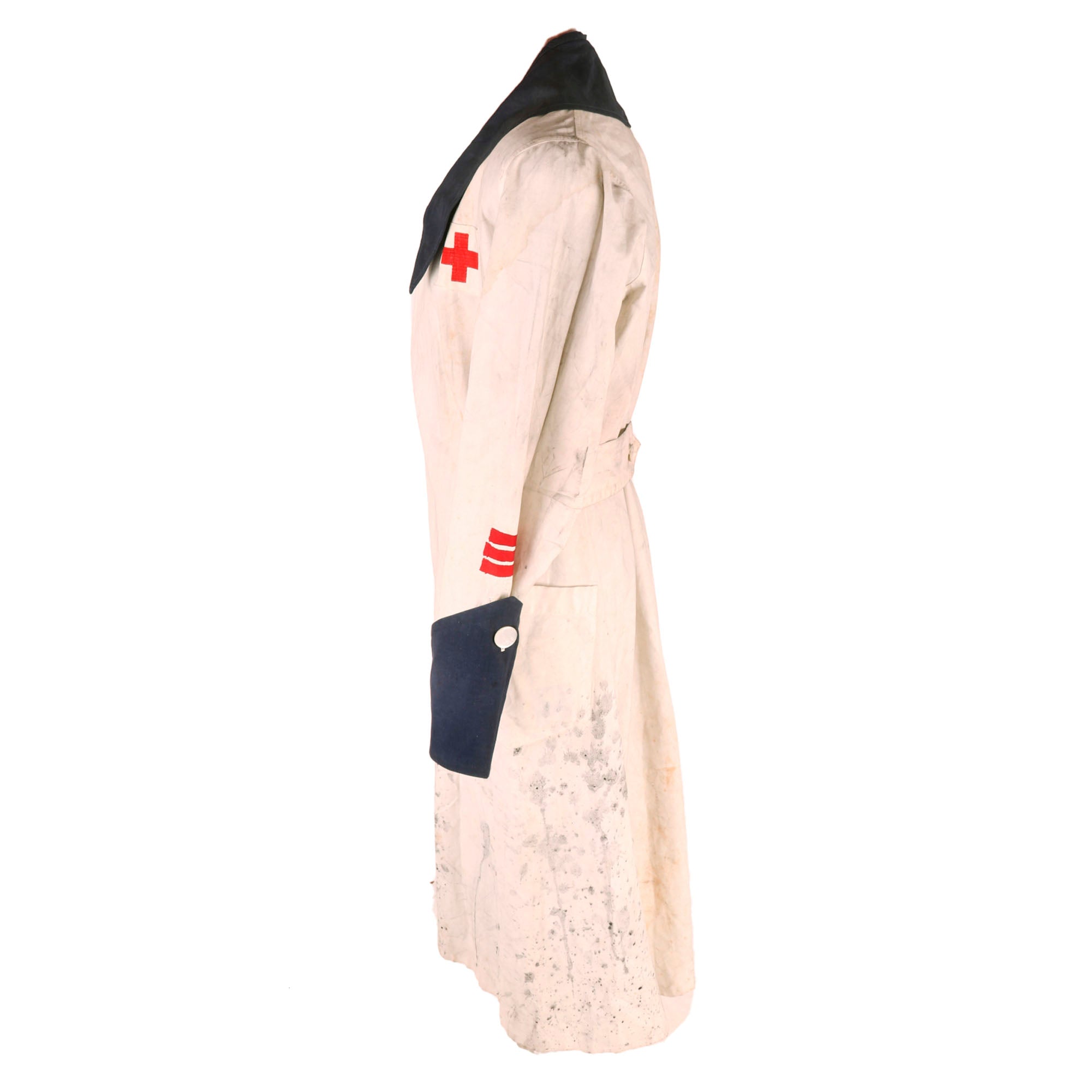 Original Item. Only One Available. This is a fantastic service-worn American Red Cross nurse’s uniform with three red service stripes on the left cuff denoting length of service. The style of uniform denotes use by the Red Cross Production Corps.