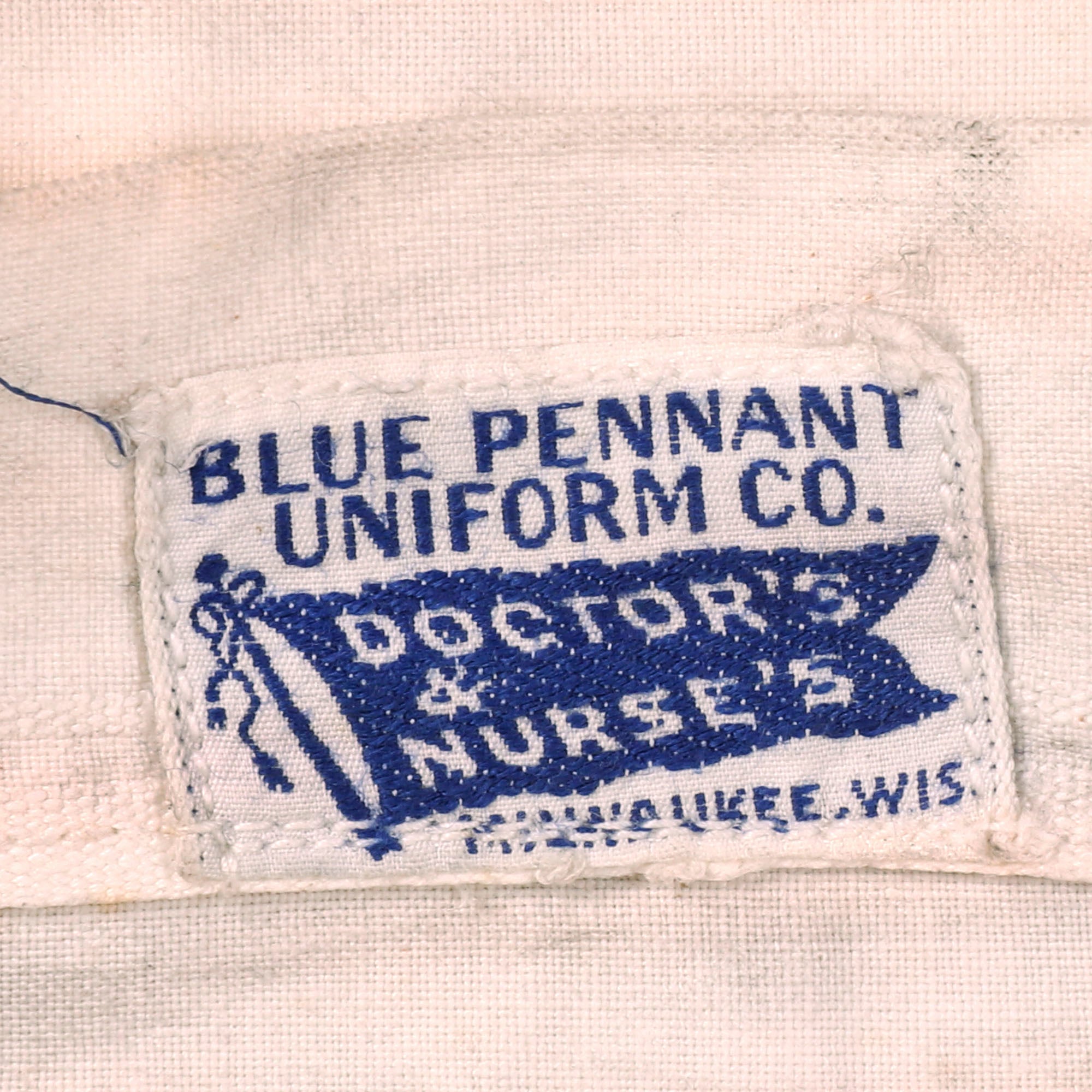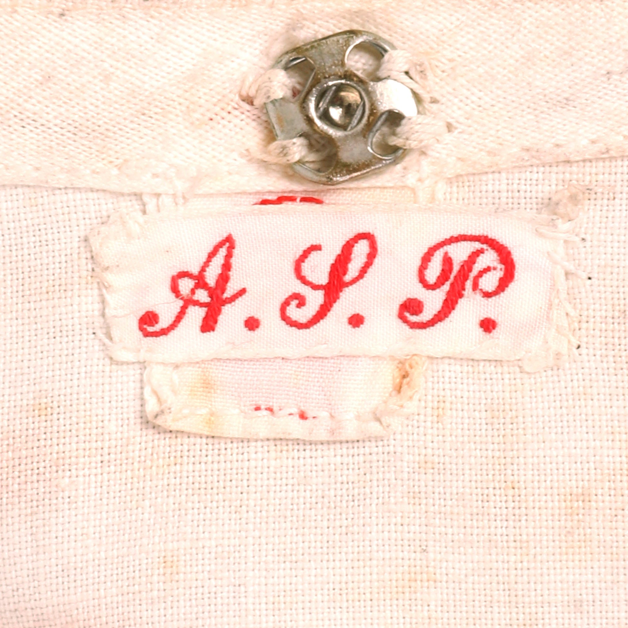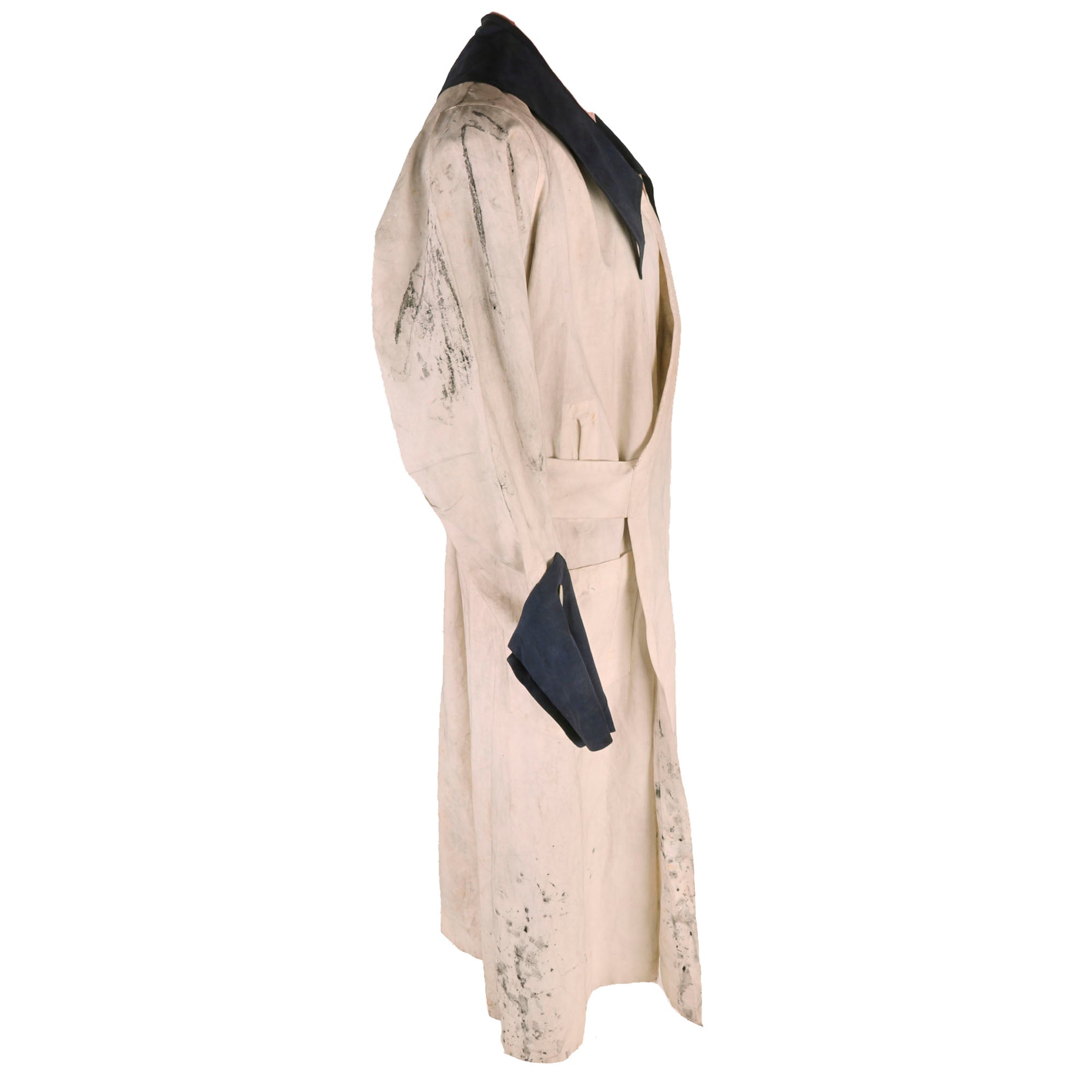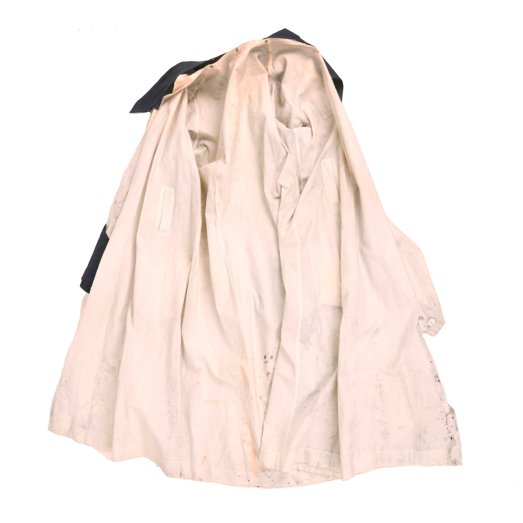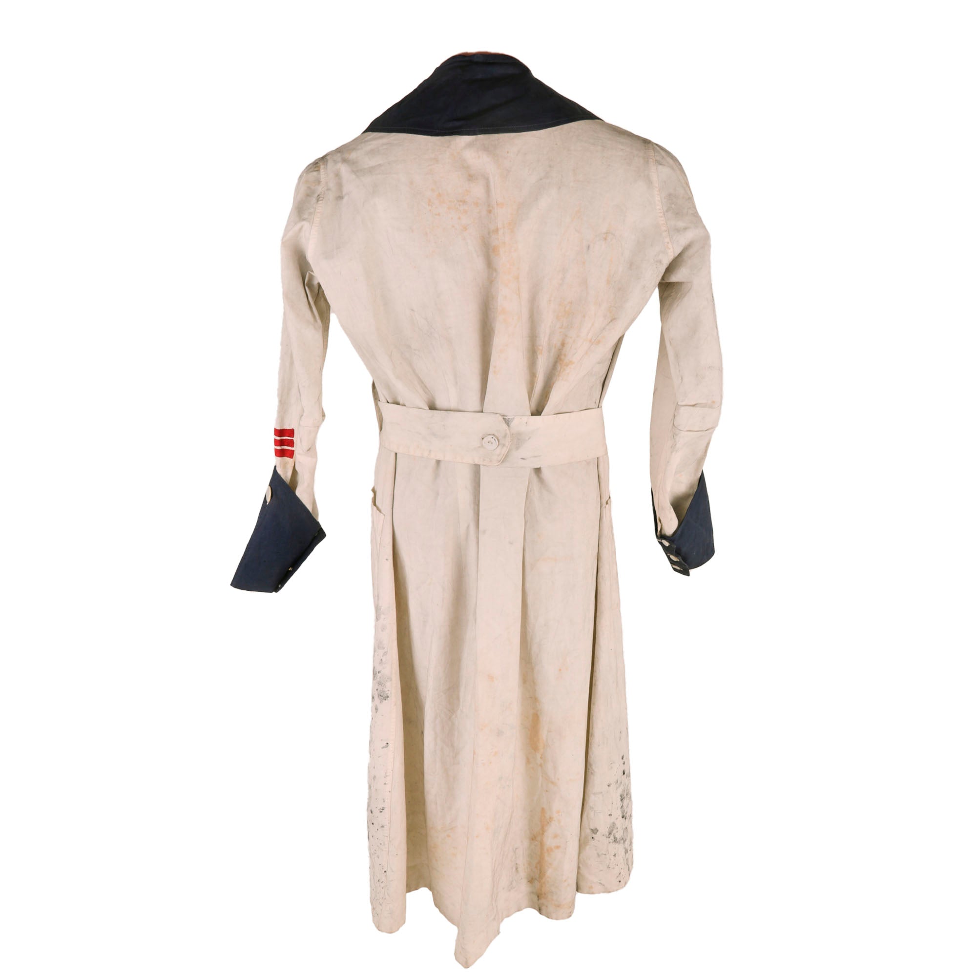 The uniform is heavily worn with black stains on the right sleeve and heavy staining across the dress that gives it a nice overall patina. No attempt has been made to clean this. There is some overall yellowing and aging. Staining near the hem, on the pocket, on the sleeves and shoulders. The blue cuffs are still attached. Great mother of pearl buttons on the cuffs. There is also a tag with initials under the collar, A.S.P.