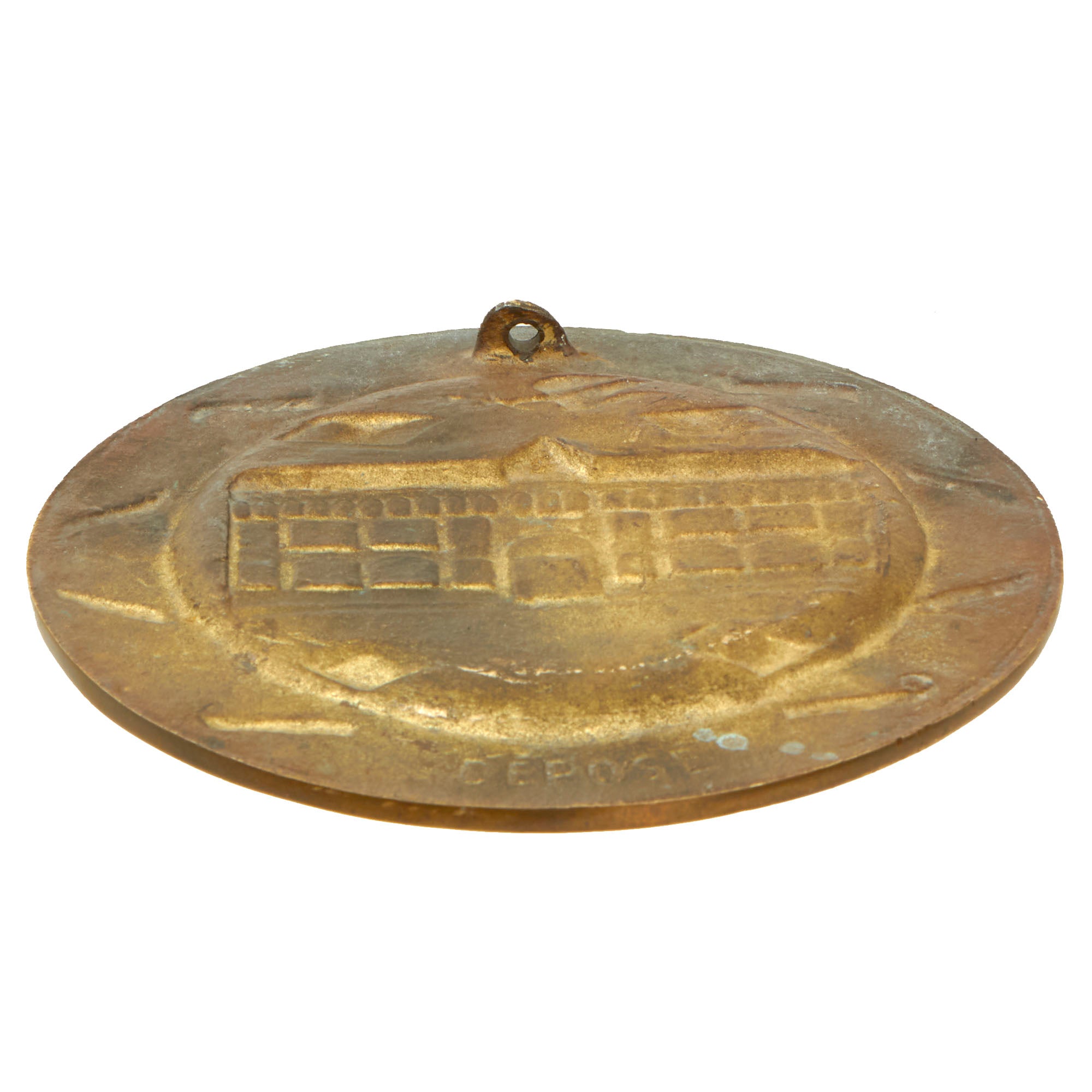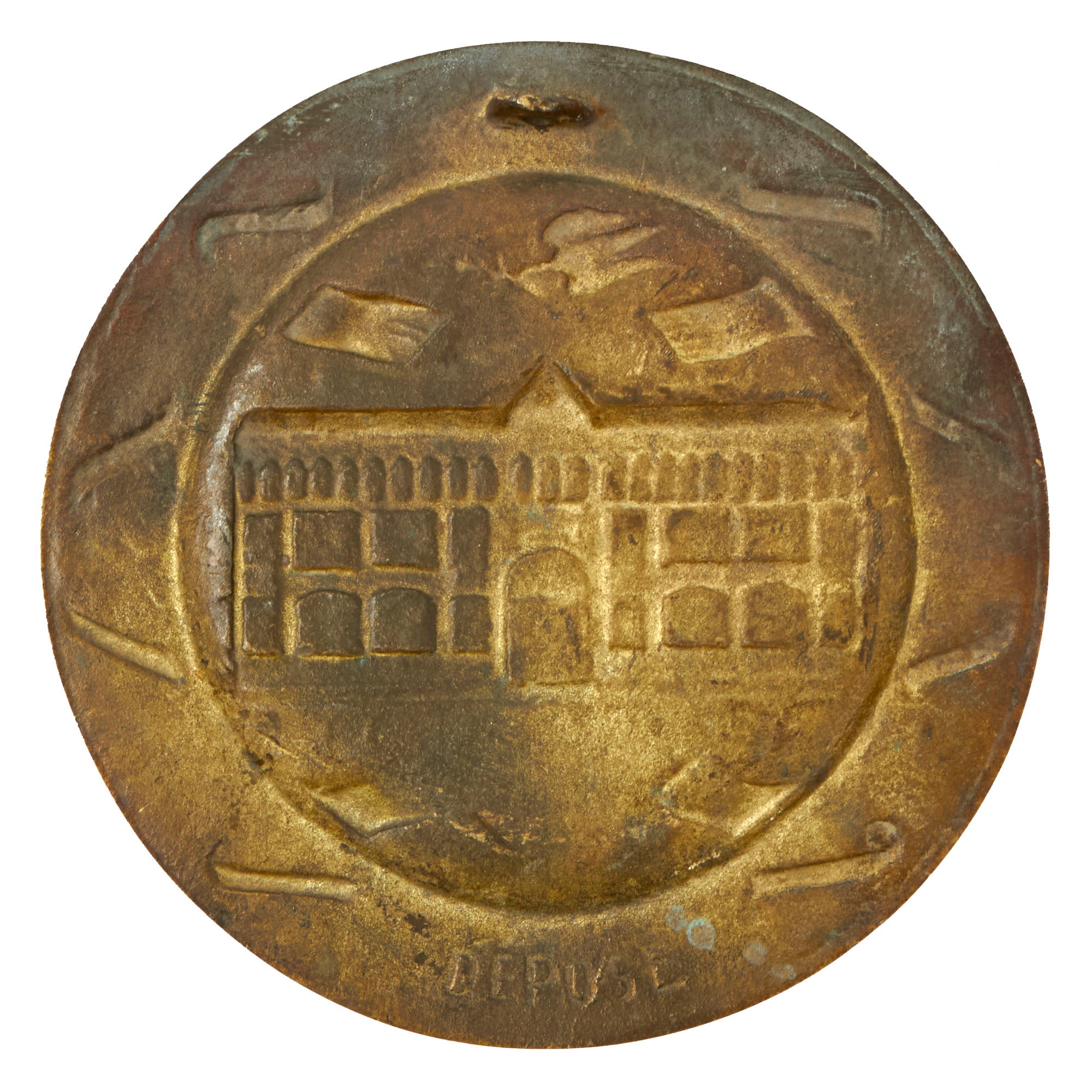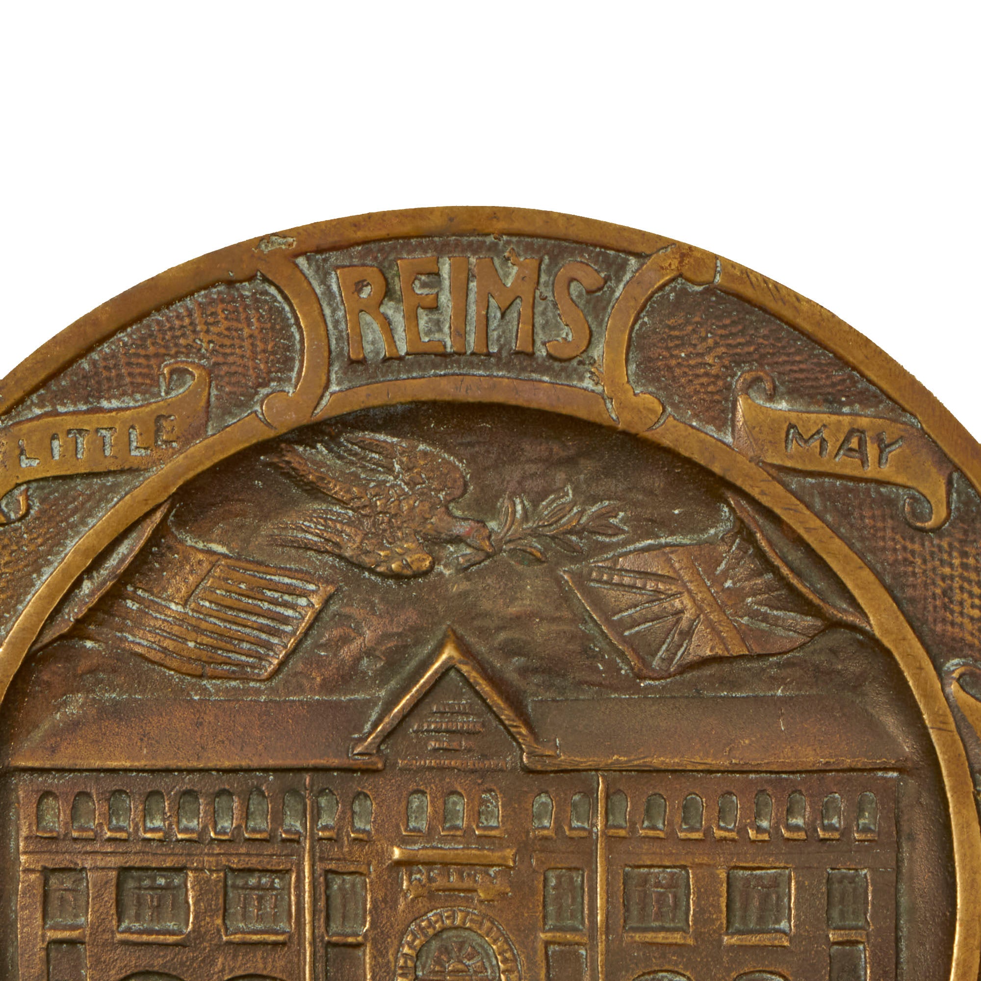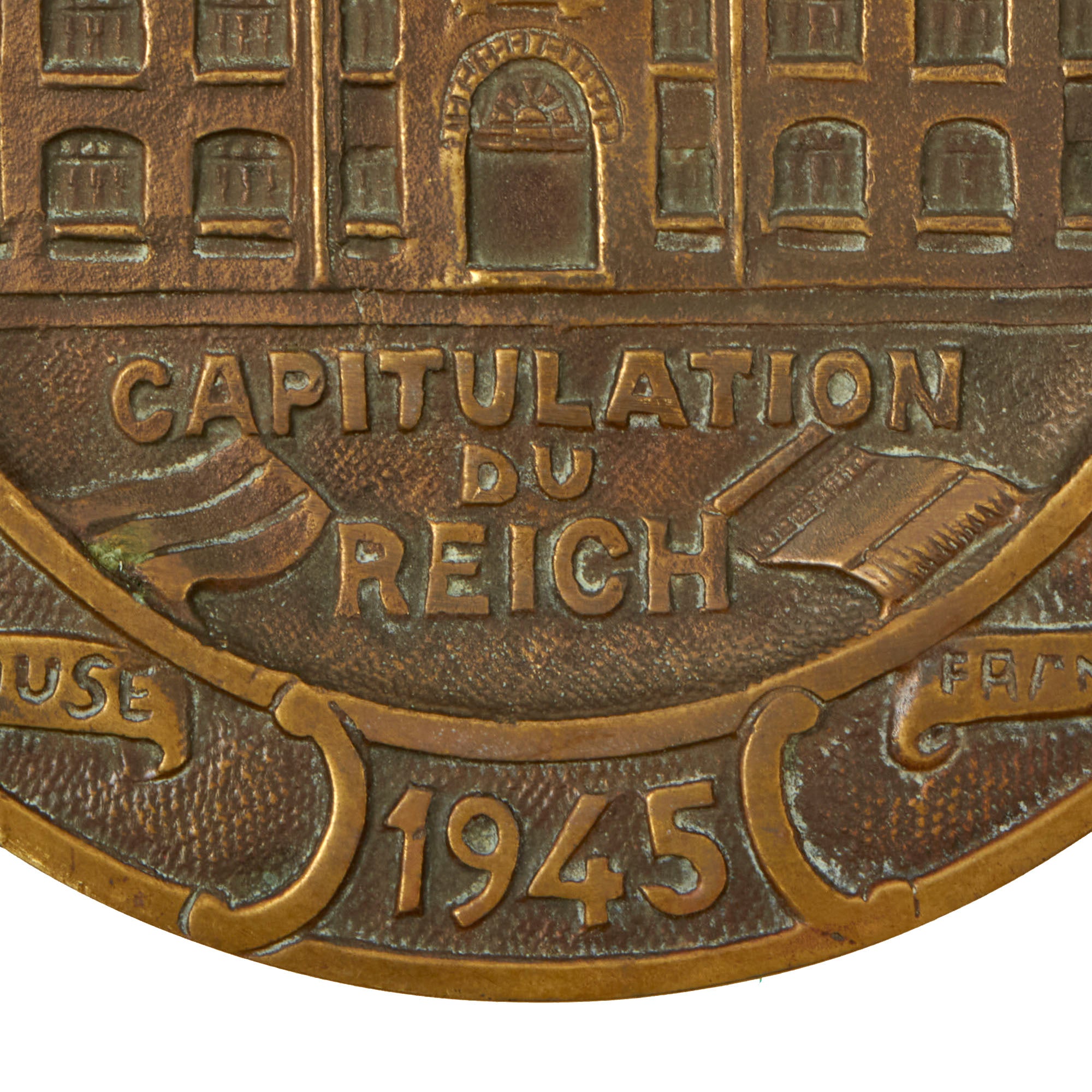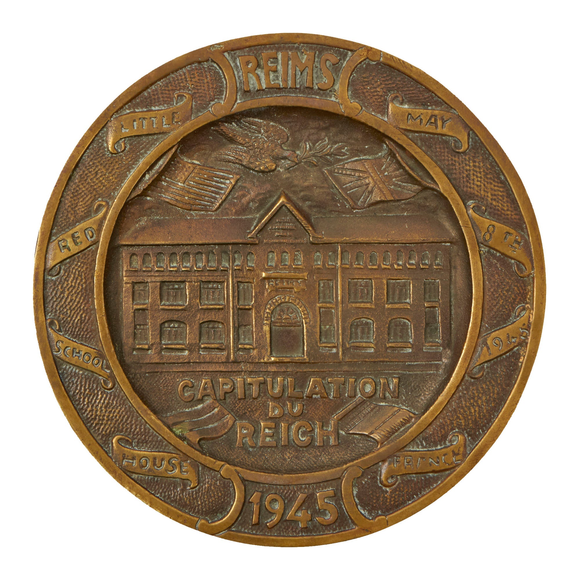 This is a lovely cast brass plate depicting the building in which the surrender took place, with CAPITULATION DU REICH underneath. It is also surrounded with the following text on small banners around it: LITTLE RED SCHOOL HOUSE MAY 8TH 1945 FRANCE REIMS 1945. The plate measures a 5½” diameter, and is in very good condition, with a lovely oxidized patina. The rear has a small hanger loop at the top, and the bottom is marked DÉPOSÉ, which means it is a protected design in France. While France was still recovering from the occupation, they were still able to make these souvenir items for USGIs to take home, which they did in large numbers.