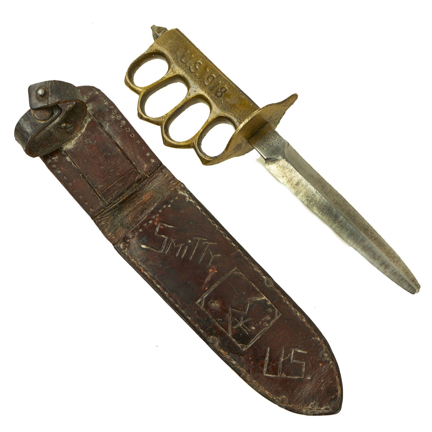 The custom leather scabbard is typical of those used by the U.S. in WWII, which definitely shows that this knife was reissued for use during the war. It is made from multiple pieces of leather, which are both stitched and rivetted together. It has an attached belt loop with a securing strap at the top. Condition is very good, with most of the stitching still intact, and a lovely aged brown leather color. There is however definitely wear and cracking on the retaining strap. The front of the scabbard has been personalized with the name SMiTTY over what looks to be a framed rectangular landscape image, possibly indicating issue in the Pacific Theater of WWII. Below this it is marked U.S..