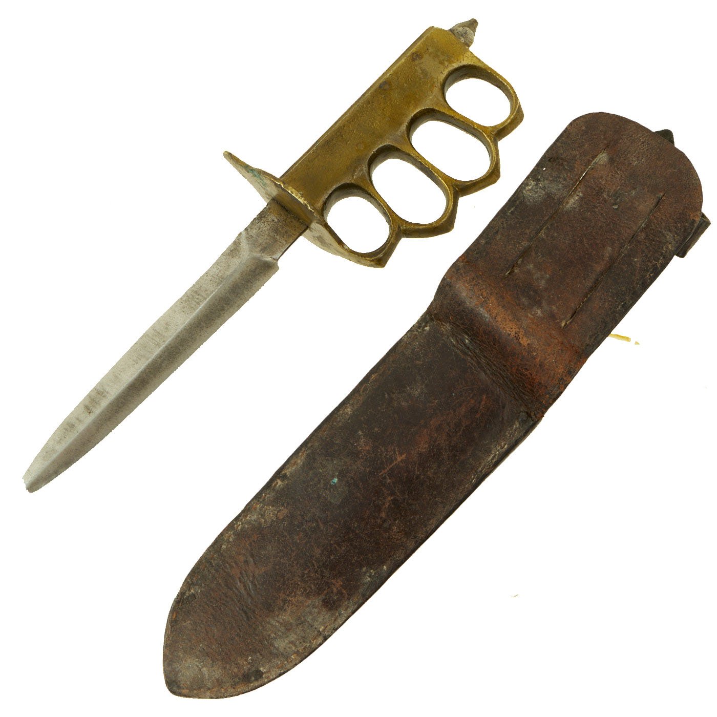 As originally issued, U.S. made knives were entirely blackened; both the blades and the brass knuckle hilts. French-made knives had bright blades, and much less blackening on the hilt. These knives remained in use with the US military, classified as limited standard (secondary issue) through January of 1945, when the knives were officially classified as obsolete. The knives were carried in a blued sheet steel scabbard that was typically maker marked, and was equipped with a pair of wire tabs that were intended to engage the US pistol web belt, but never fit properly so various belts and rigs were used or the scabbards were replaced with more usable ones. Many of the knives issued during World War II ended up in substitute leather scabbards of various designs and styles, many of which were "theater made".