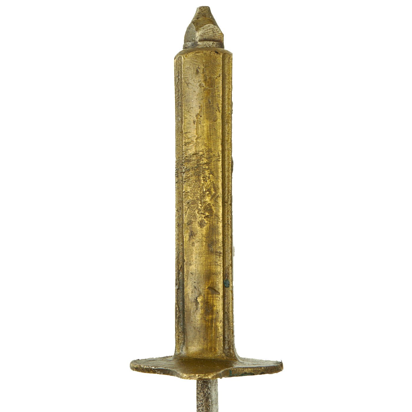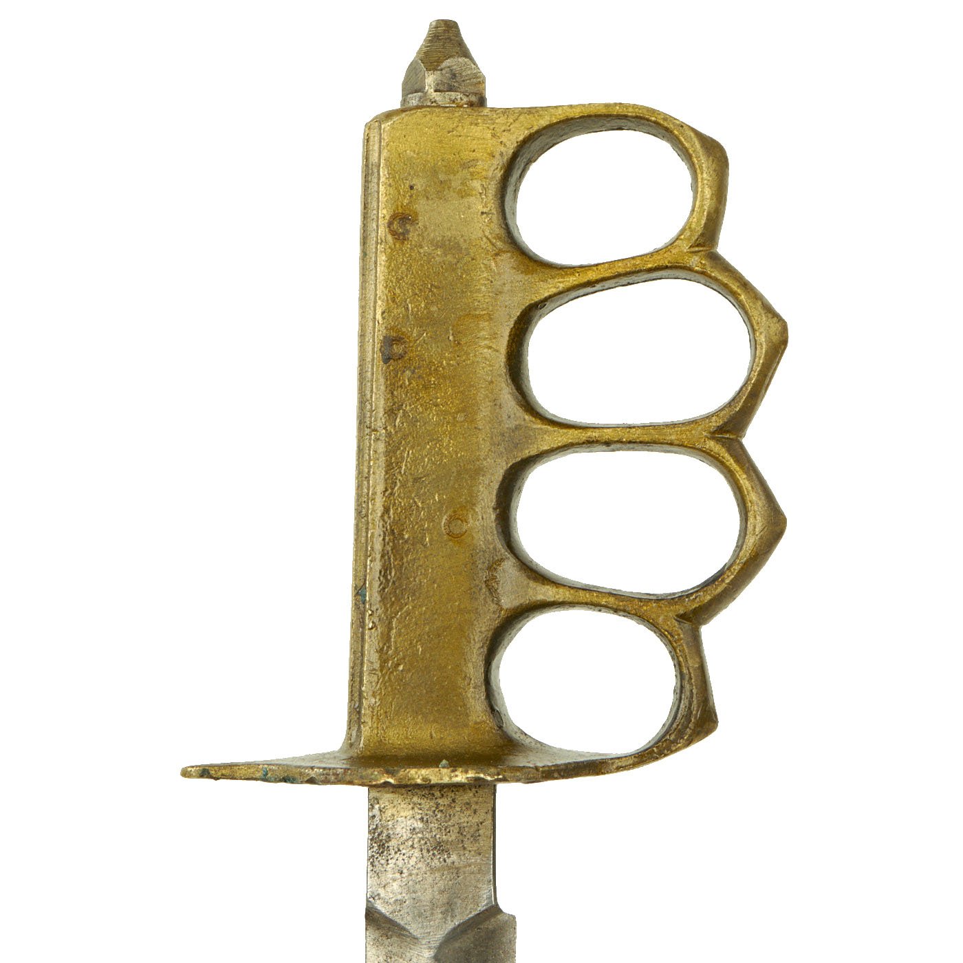 The example of the U.S. Model 1918 Mark I Trench Knife offered here is in very good condition. The knife is one of the French made examples which is marked on the ricasso with a (Reclining Lion) / AU LION. The blade mark is very crisp and well defined, much better than is usually encountered these days. This brass grip of the knife is clearly marked: U. S. 1918. As is usually the case with the AU LION marked knives, the cast brass grip is much rougher and cruder than the US made versions. As is also typical of the French made knives, the knuckle points are also less defined and not as sharp as the US made knives. The French made grips are cast with a variety of minor differences, and this one is cast with two grooves along the top edge of the grip. The brass knuckle grip has a lovely brass color with a bit of patina, and spots of oxidation.