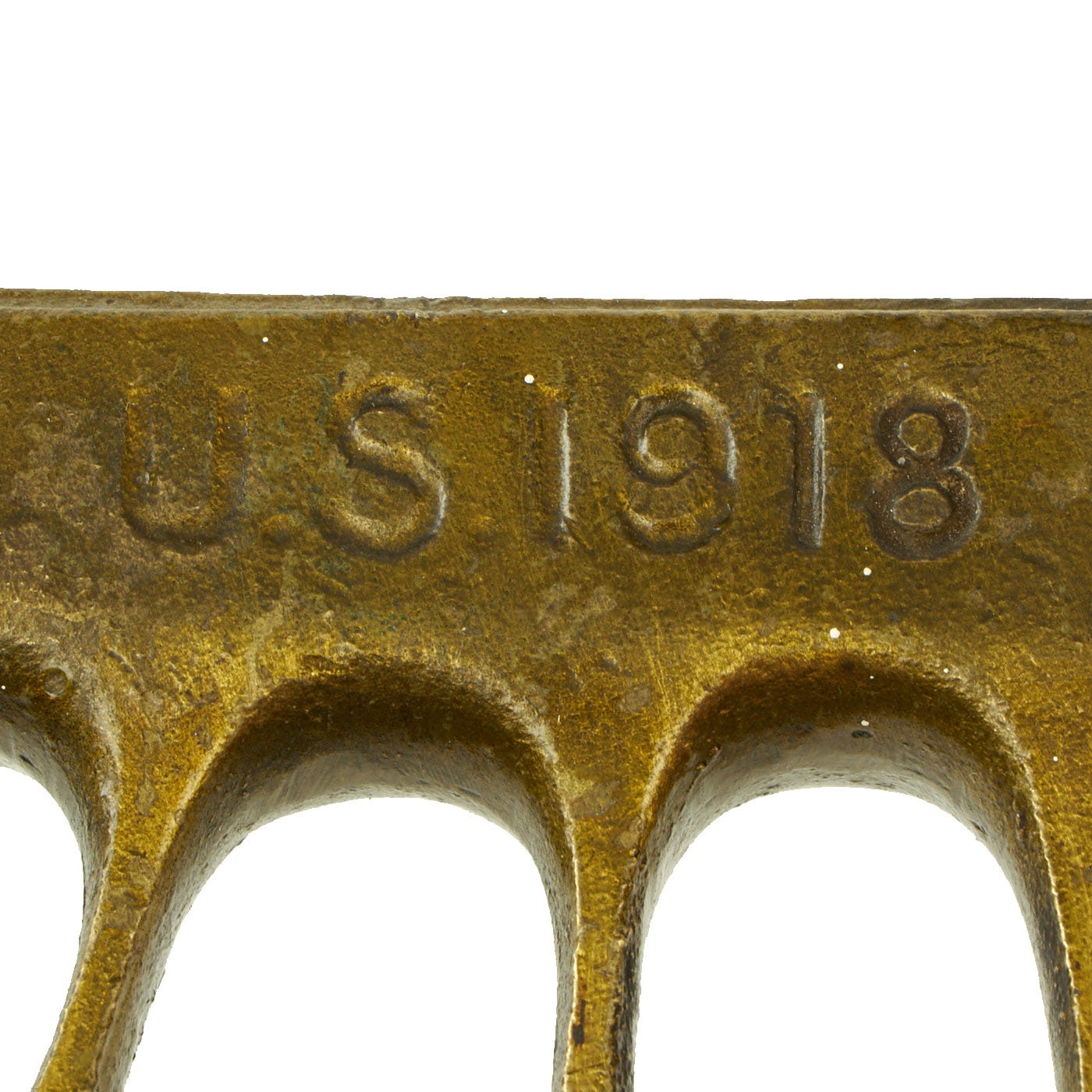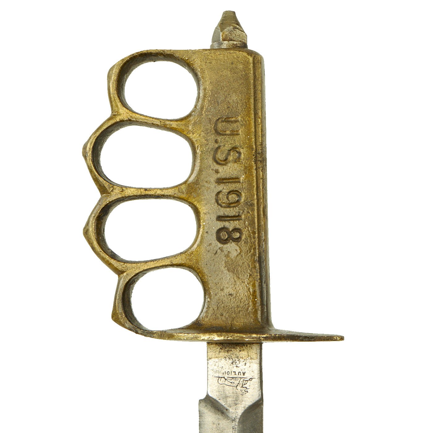 The knives were also produced in France and are marked with the usual 1918 and US marks, as well as Au Lion on the blade. Whether this mark was a maker's mark or simply a motto is not known. The U.S. M-1918 Mark I Trench Knife is easily identifiable due to its large "brass knuckle" style guard and grip. The knives were 11 ¾" in overall length, with a 6 ¾" dagger style blade. The brass grips were marked U.S. 1918 and with the makers name or initials.