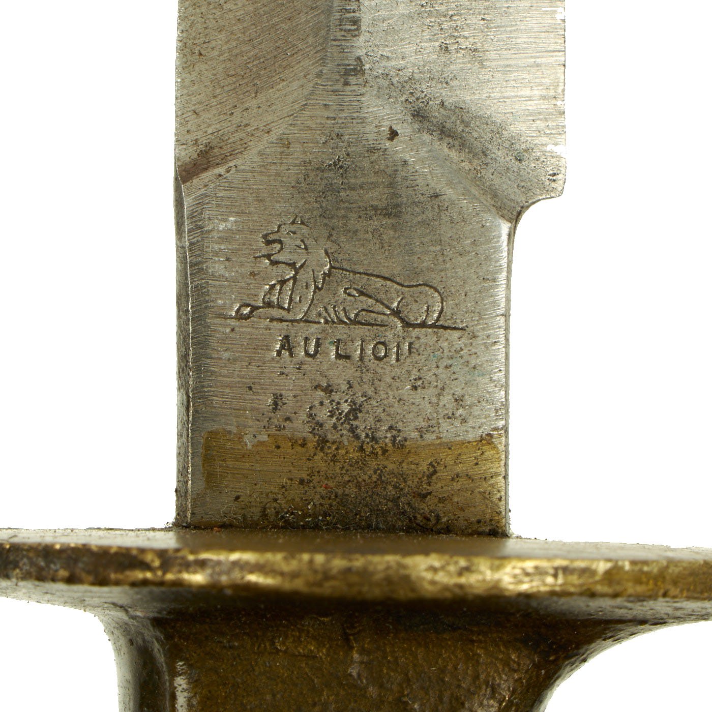 The blades of most of the AU LION knives were produced in the white, with no finish on the blade. This example has had the blade significantly altered in shape, particularly on the upper edge, where the edge was ground flat apparently. The tip also broke off at some point, and was then re-shaped. It looked like this alteration was done when it was reissued for WWII, and intended to use the forward edge, as with most knives of the period.