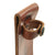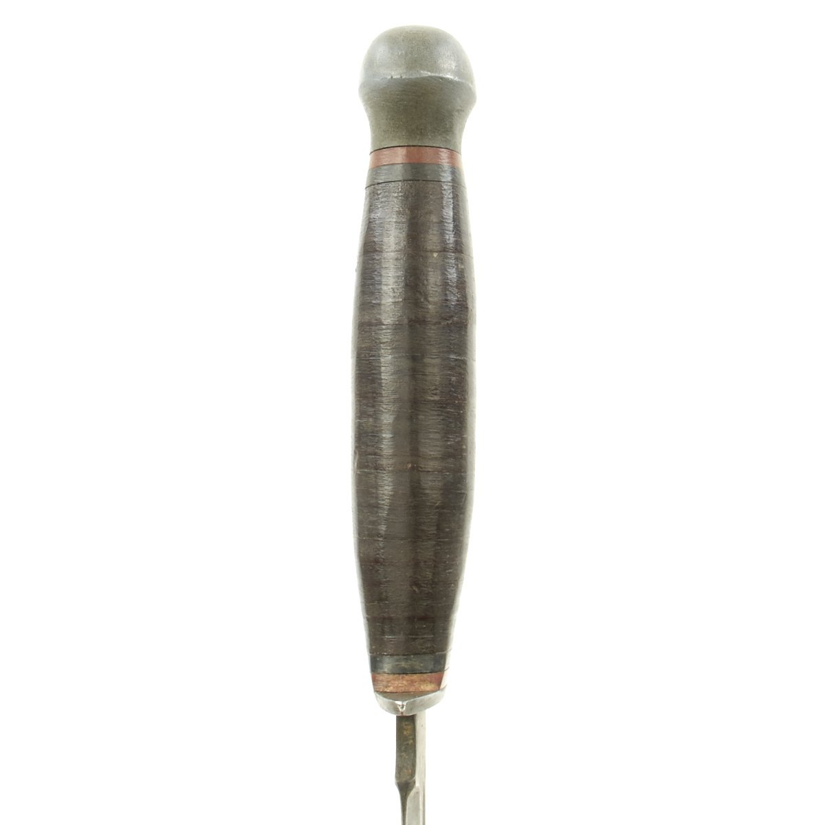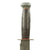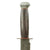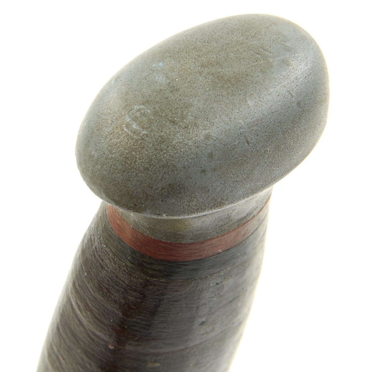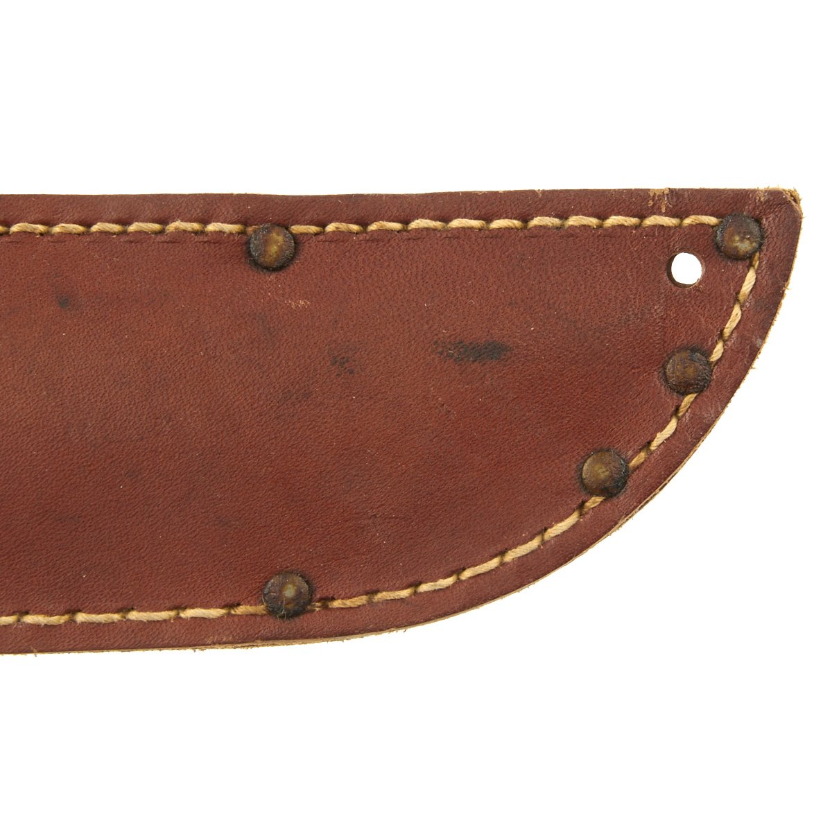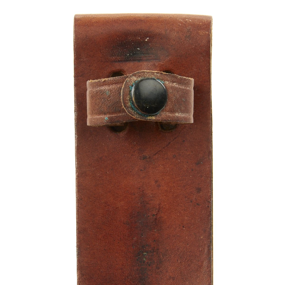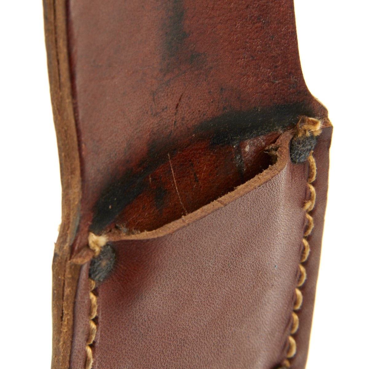 The scabbard is the earliest leather version and is in very good condition. The leather has aged to a nice red brown, and is still supple, with no cracking that we can see. The snap is still functional, with much of the original finish, and there is some verdigris build up. All of the stitching and rivets are intact.