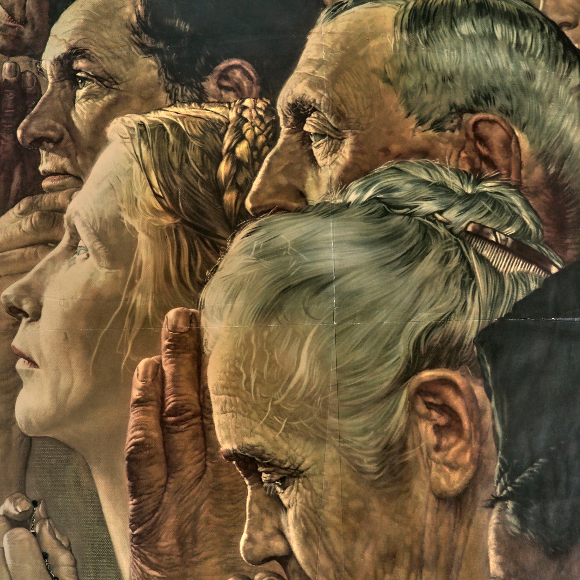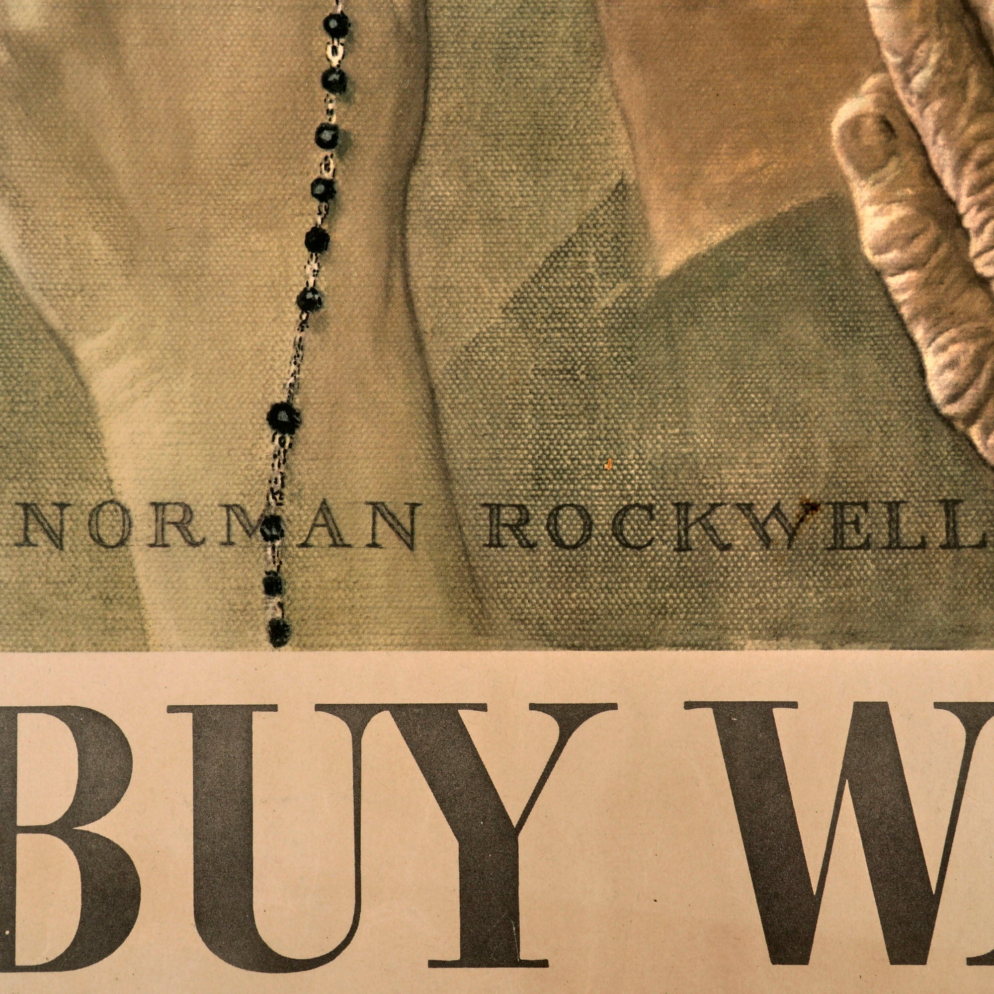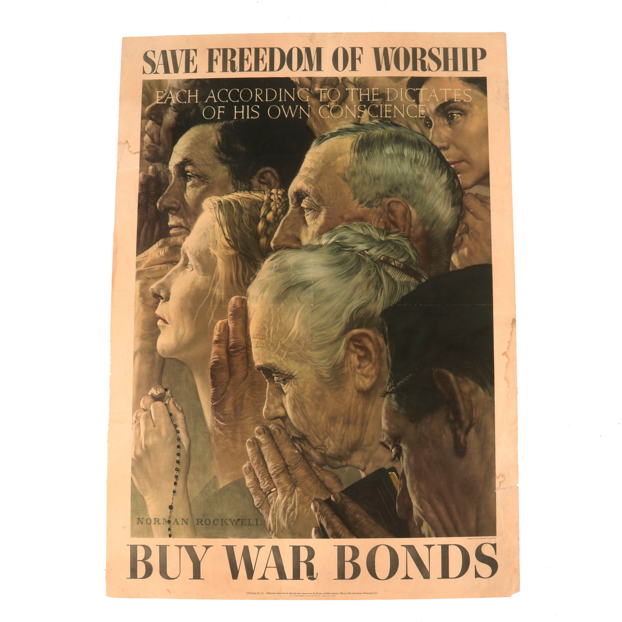 Original Item. Only One Available. This is a great example of a scarce WWII war bonds poster designed by well-known American artist Norman Rockwell. The poster depicts men and women of various races and faiths, including a woman with rosary beads, with hands clasped in prayer.