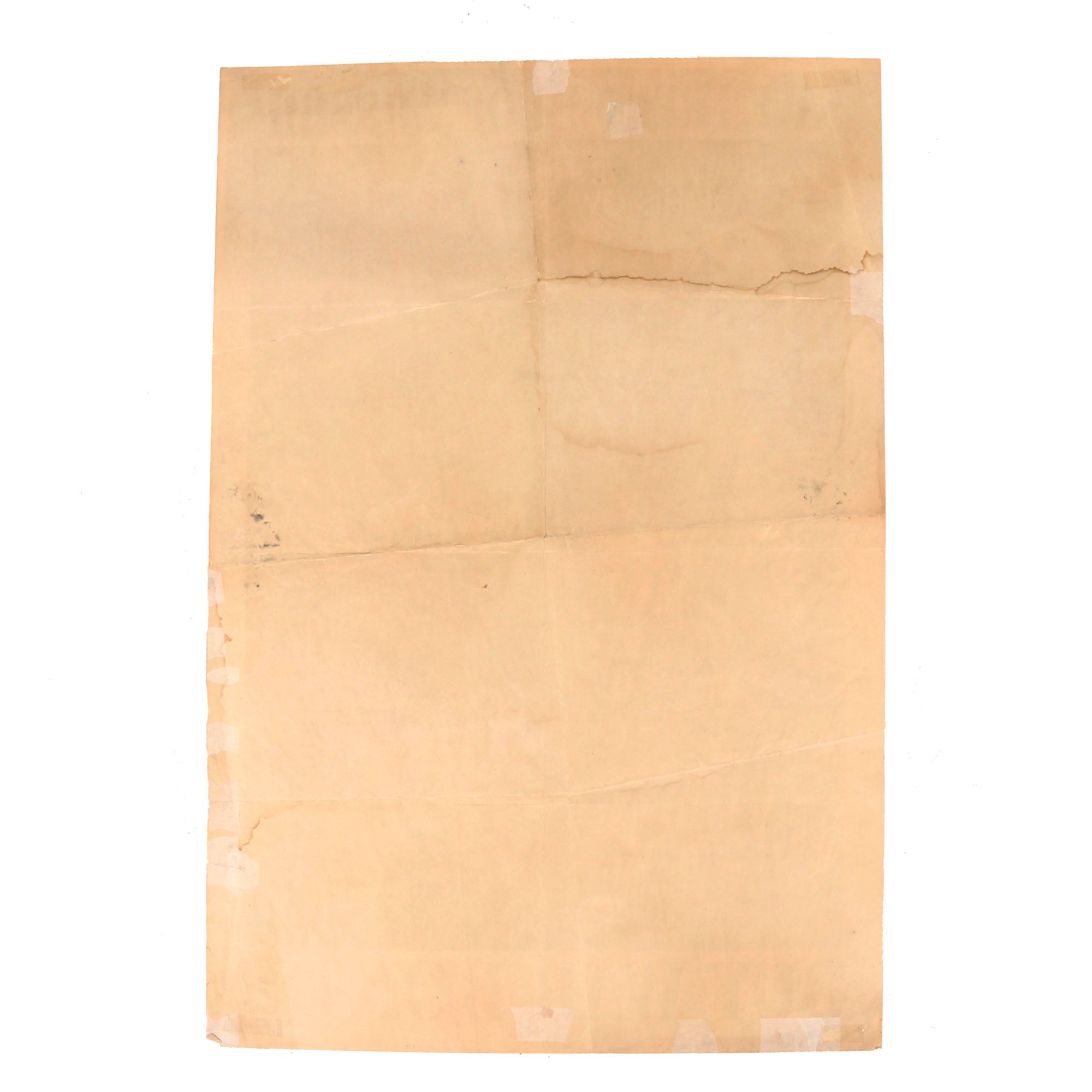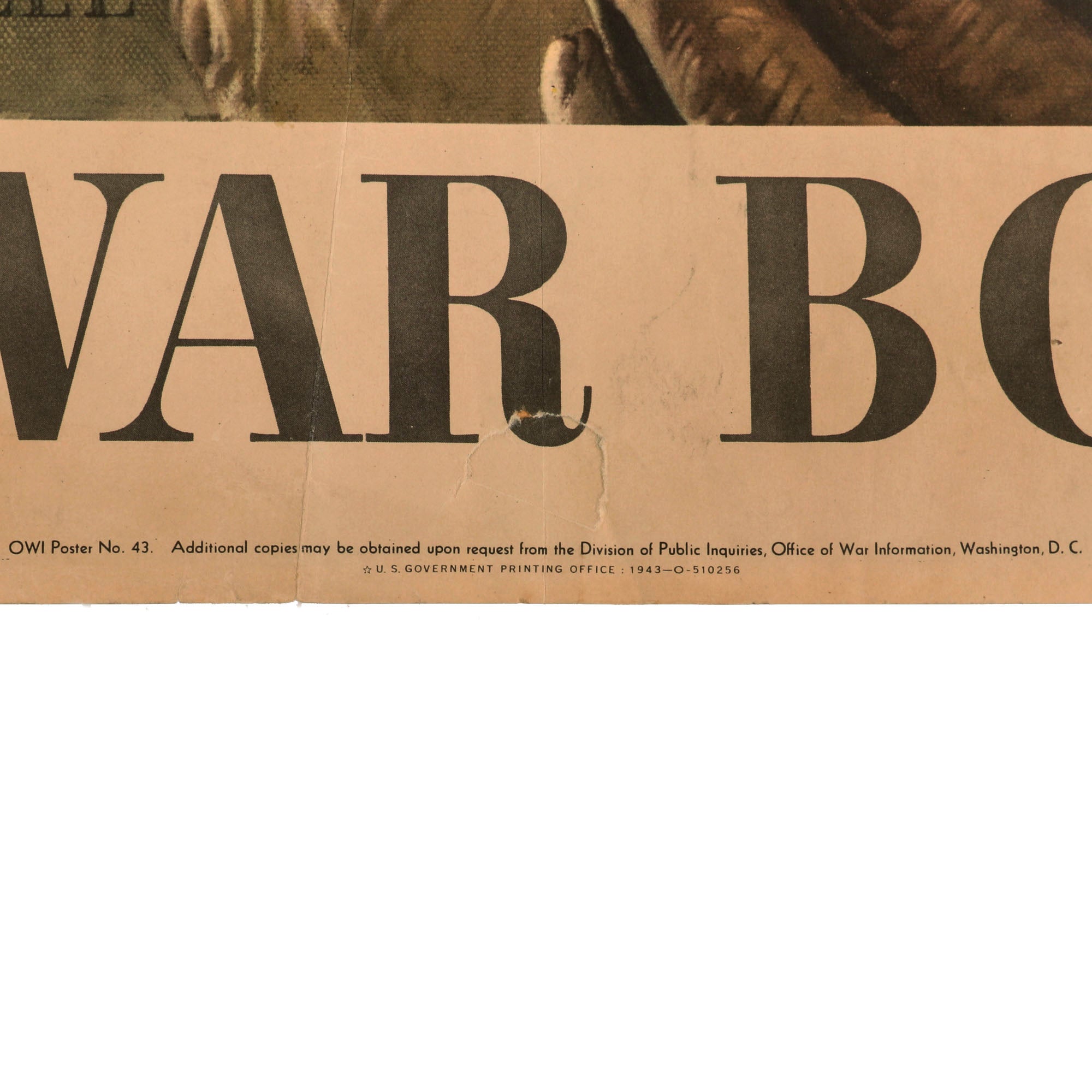 The poster measures 20 x 28” and is unframed, with very little damage outside of some edge tearing and folding, as well as some staining across. The poster is dated 1943 at the bottom.