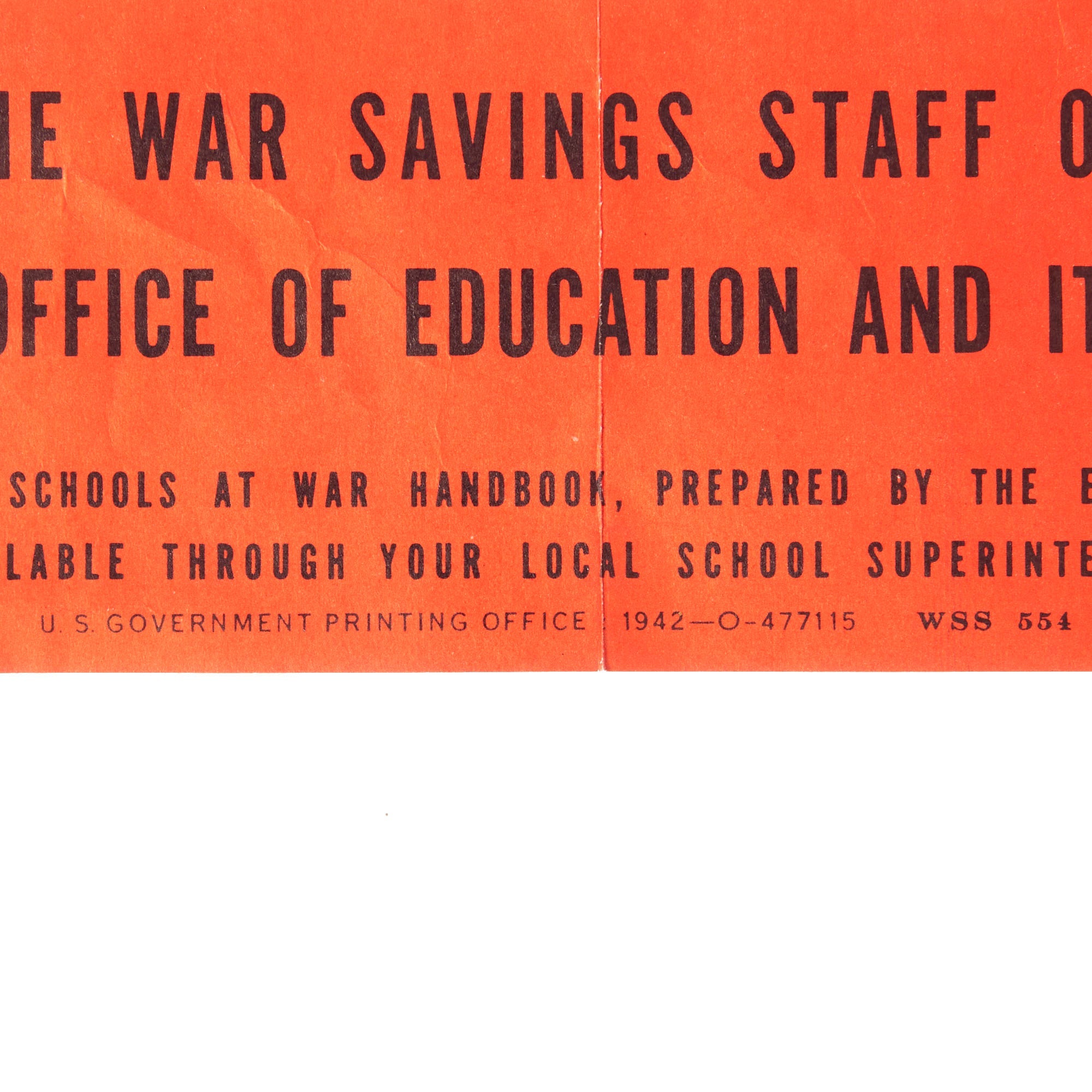 Original Item: Only One Available. This is a fantastic example of resourcefulness for the war effort on the homefront. While the government wants to keep war and violence as far away from the youth as possible, there are other ways in which to involve the children, one of which was the Schools at War Program. The American Schools at War program was a program during World War II run by the U.S. Treasury Department, in which schoolchildren set goals to sell stamps and bonds to help the war effort. The program was also administered by the U.S. Office of Education, the Federal government agency that interfaced with the nation's school systems and its thirty-two million students. The Office, however, allowed the Treasury to work with the schools directly as the main objective of the program was raising money.