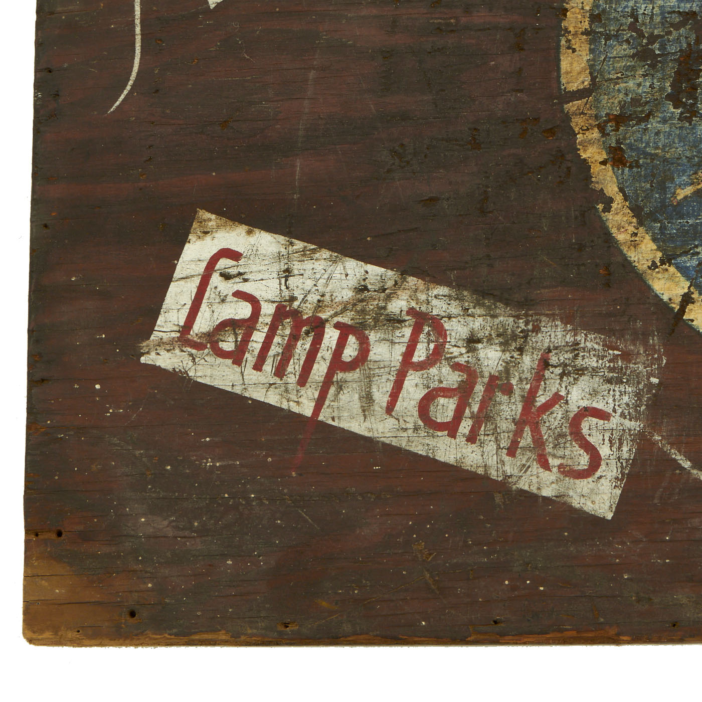 Original Item: One-of-a-kind. This is a fantastic eye appealing hand painted wood sign featuring the SEABEES insignia along with Camp Peary and Camp Parks Hawaii. It measures 25" x 16" and based on the nail pattern of holes around the exterior was once the lid to a wood shipping crate.