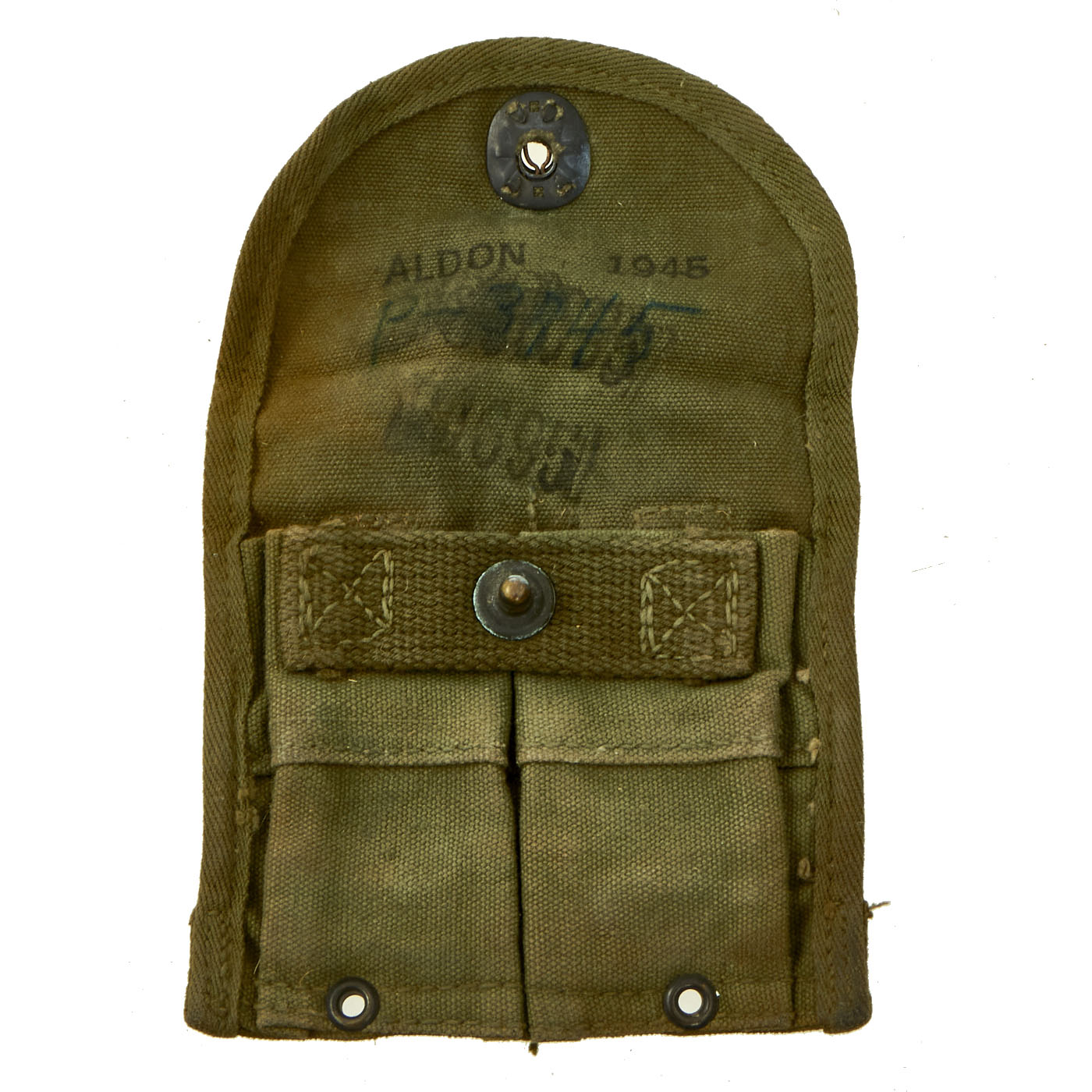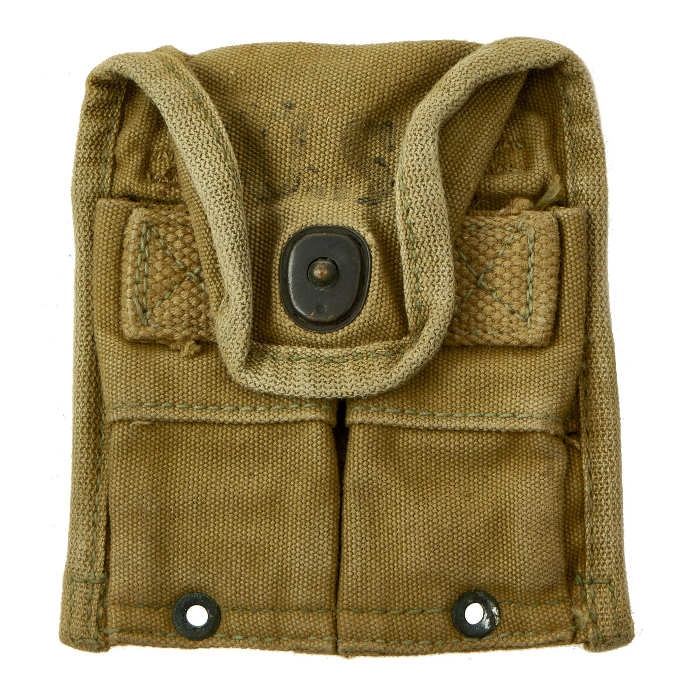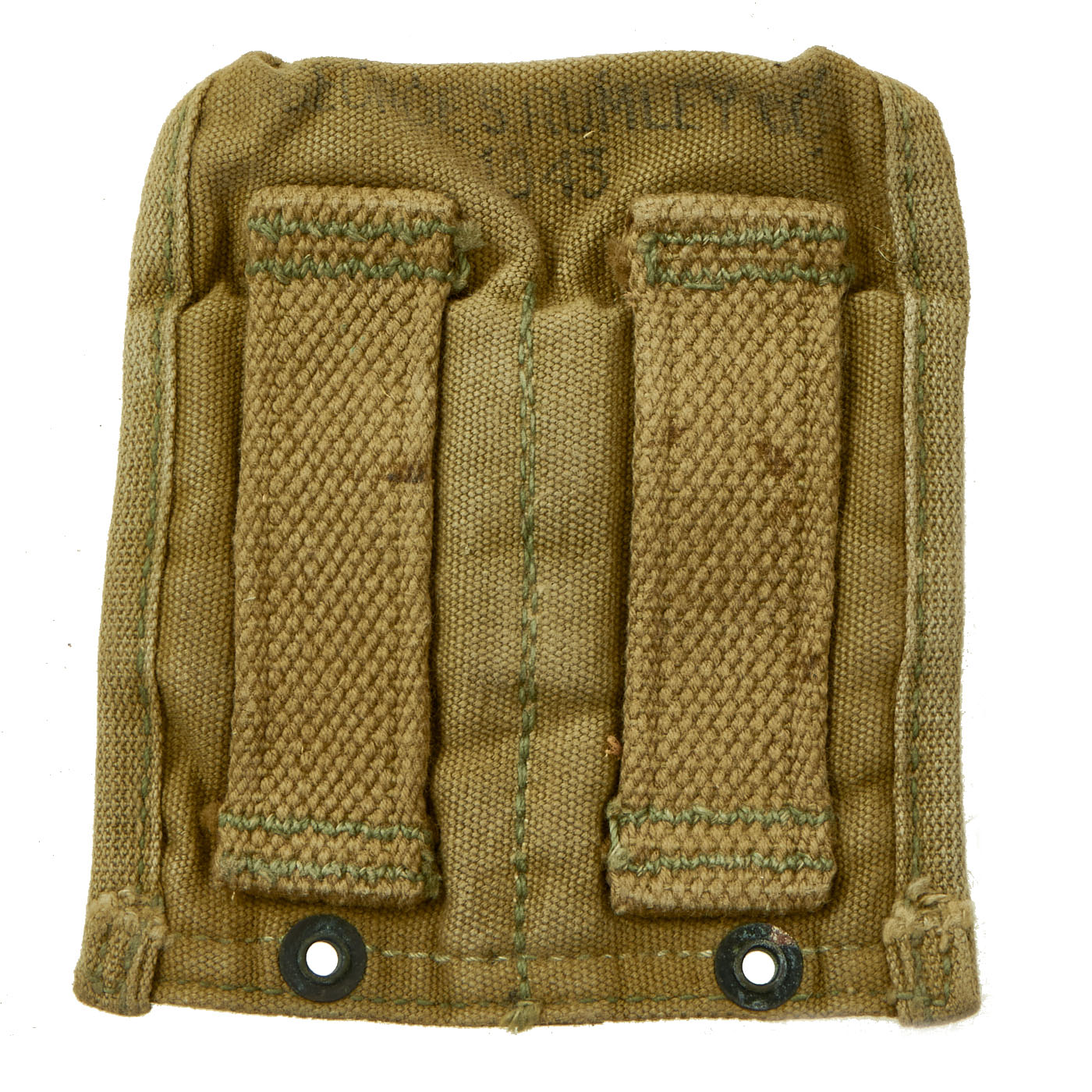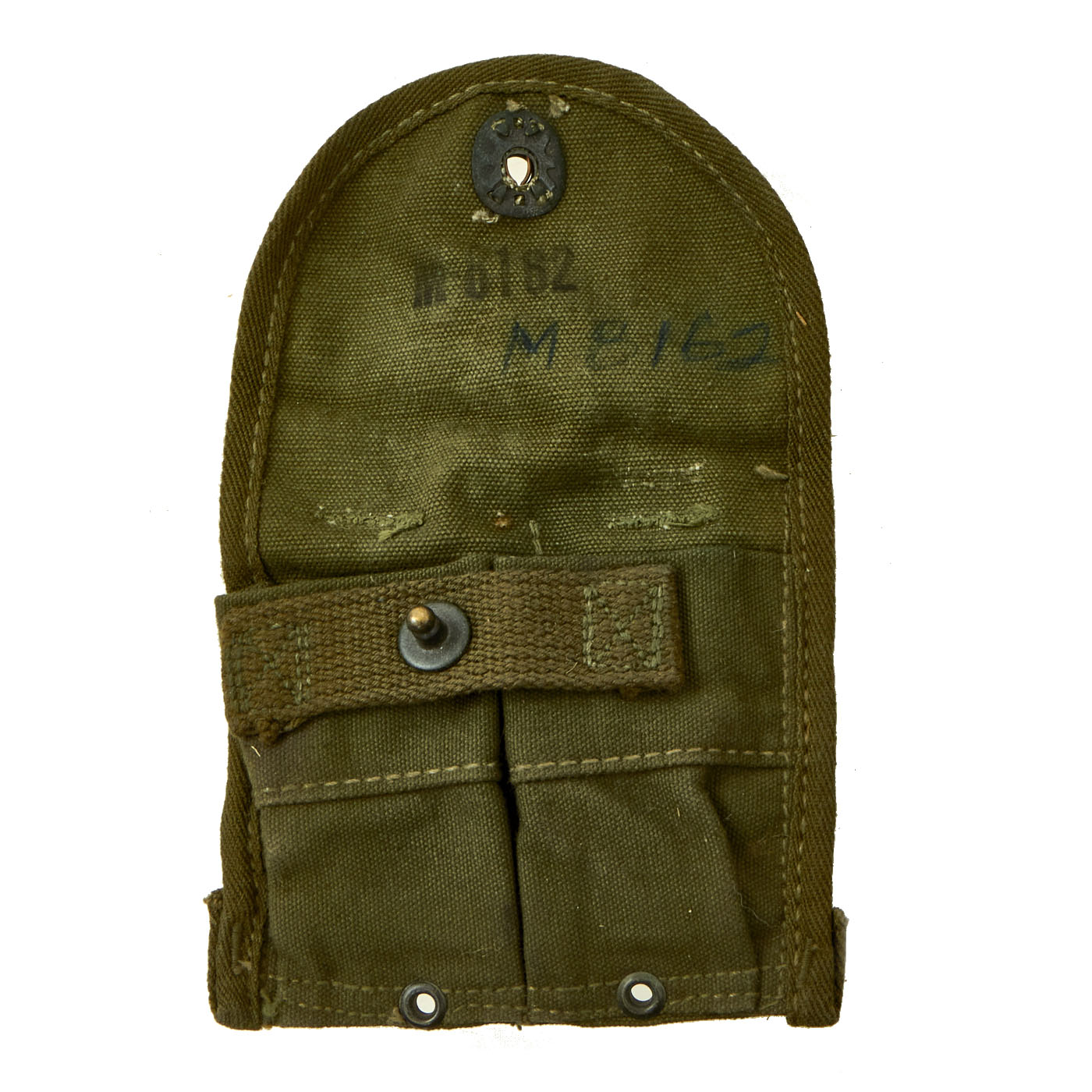 Original Items: Very Few Available. These are all fantastic, serviceable examples of WWII dated and marked M1 Carbine Buttstock Magazine Belt Pouches. They all vary in condition, color and manufacturer but are all genuine examples. Unlike the "Butt" pouches with a large sleeve on the back and a snap, these have two web loops, and will not fit over the buttstock of an M1 carbine.