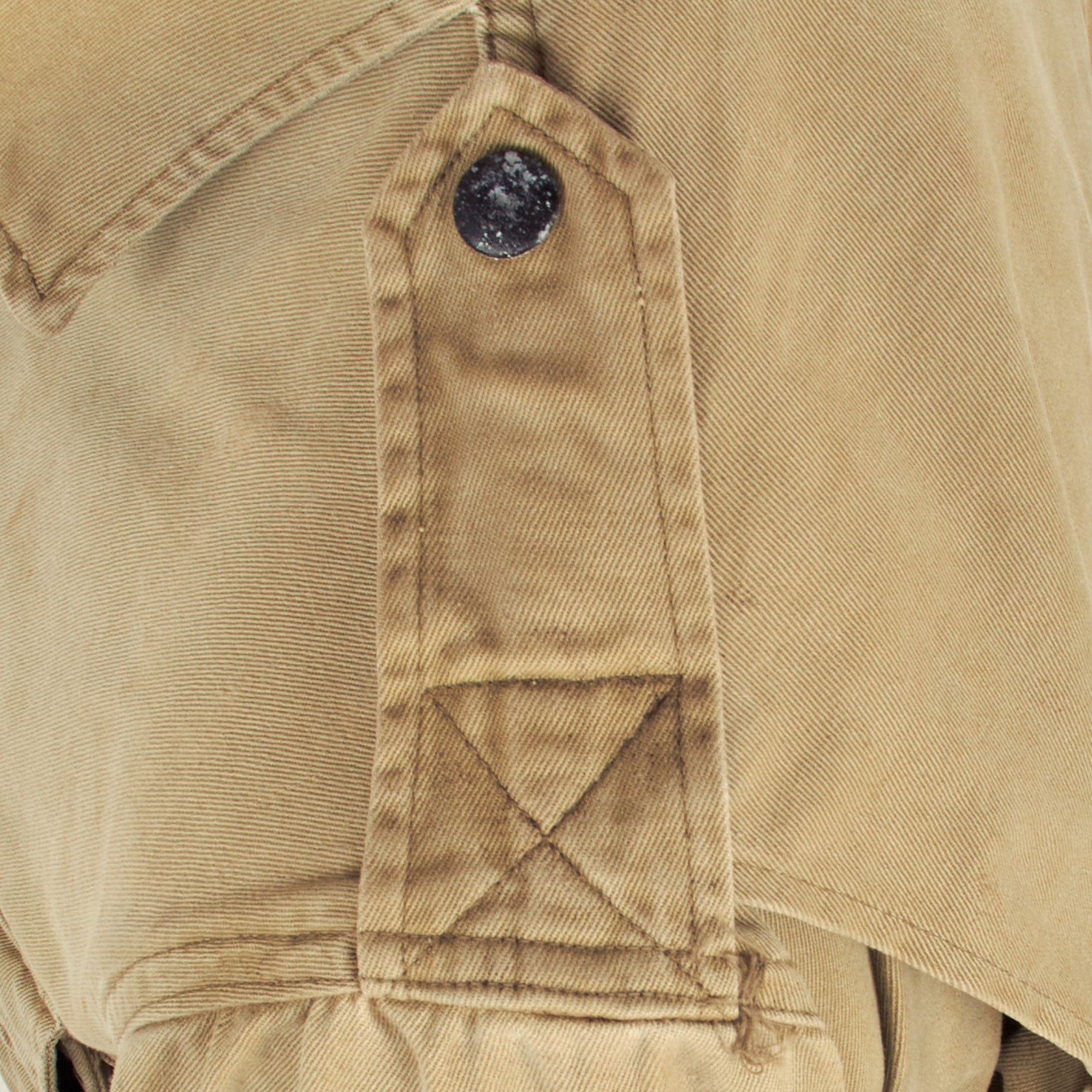 The jacket is in good condition, with the expected stains and small pulls from service. There are a few repairs and scattered tears. The color is a bit faded, however it does not seem to have shown extensive field use. The original belt is not present.