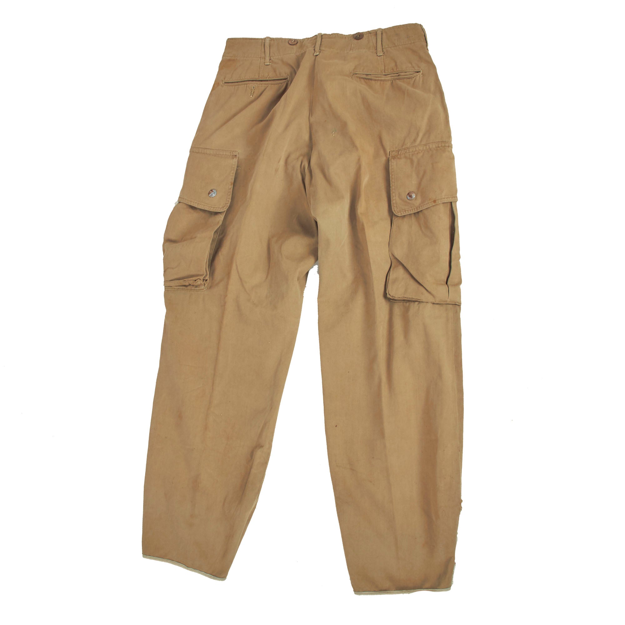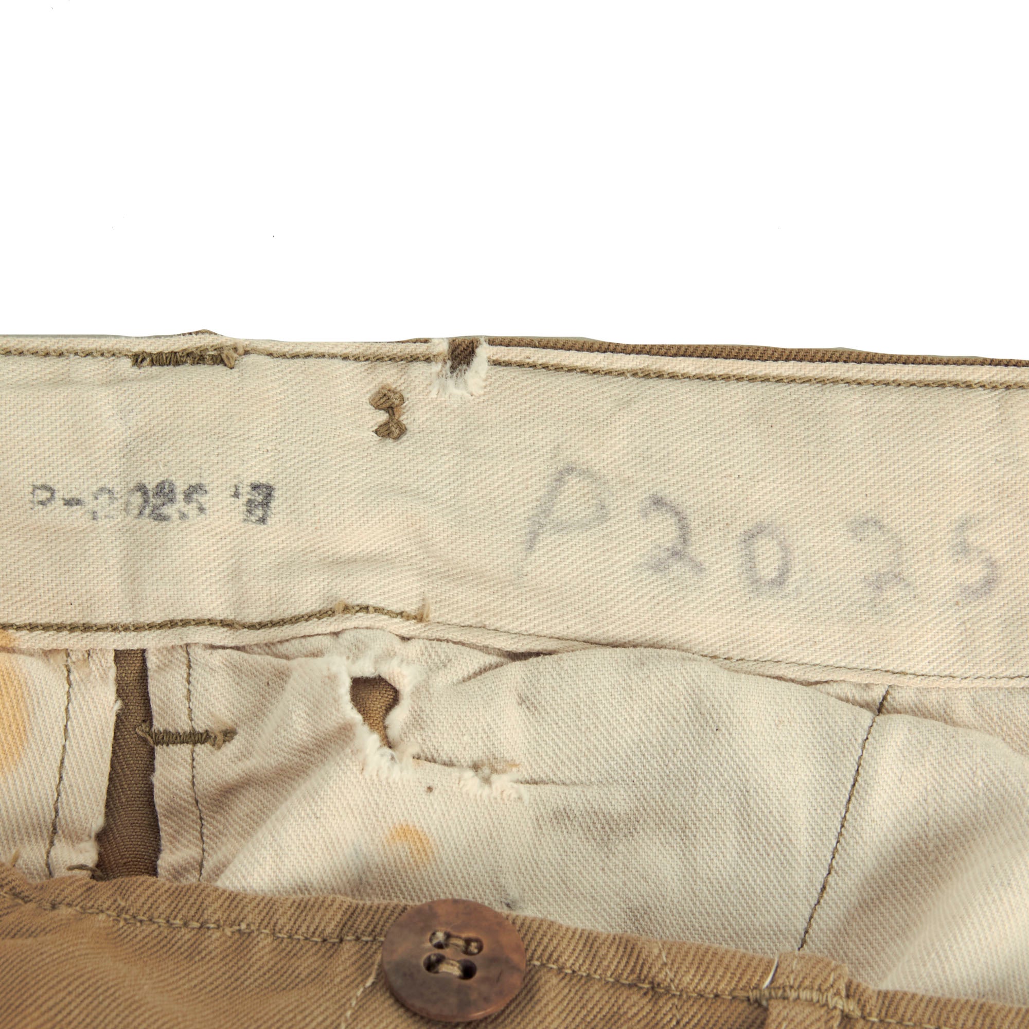 Due to the somewhat fragile nature of the uniform, the M1942 pattern was often reinforced with thicker, tougher canvas on the elbows, crotch and knees. However, this example was never reinforced, indicating early issue. The M42 was worn by Paratroops assigned to Airborne units. The M42 was eventually phased out in favor of the M1943 Uniform which was a darker green, OD #7. Despite this, various individuals chose to keep their M42s in order to show their veteran status. The trousers are in similar condition to the jacket and are without any extensive damage. The jacket is laundry number marked C-4036 and the trousers are marked P-2025. We have not been able to identify the laundry numbers, making this a wonderful research candidate.
