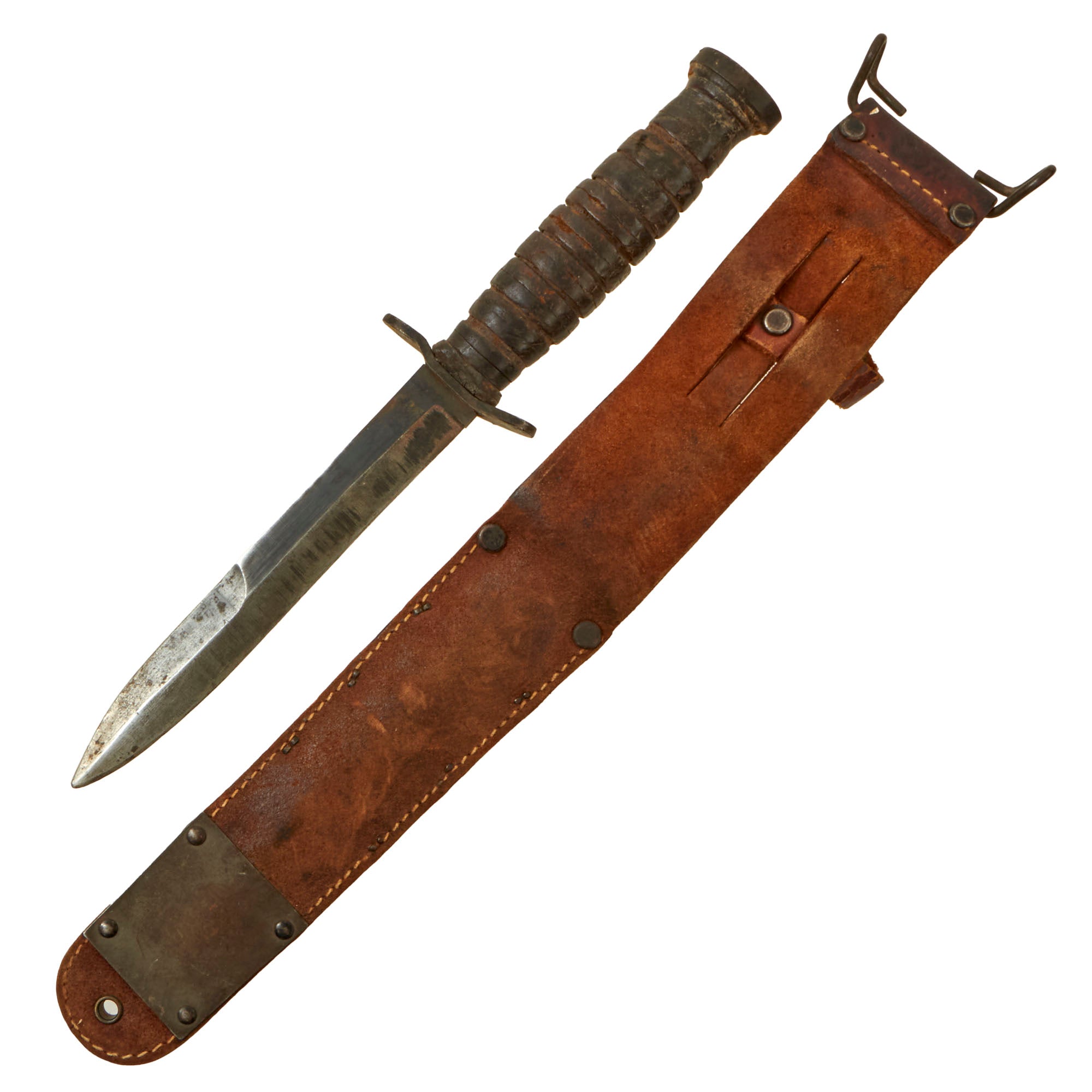 A very nice example of an early issue M3 knife from a desirable maker, in an early leather scabbard, ready to add to your WWII edged weapon collection!