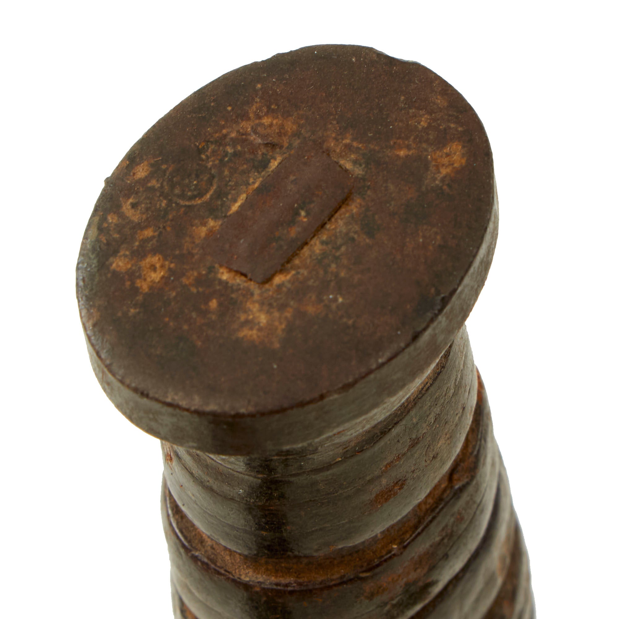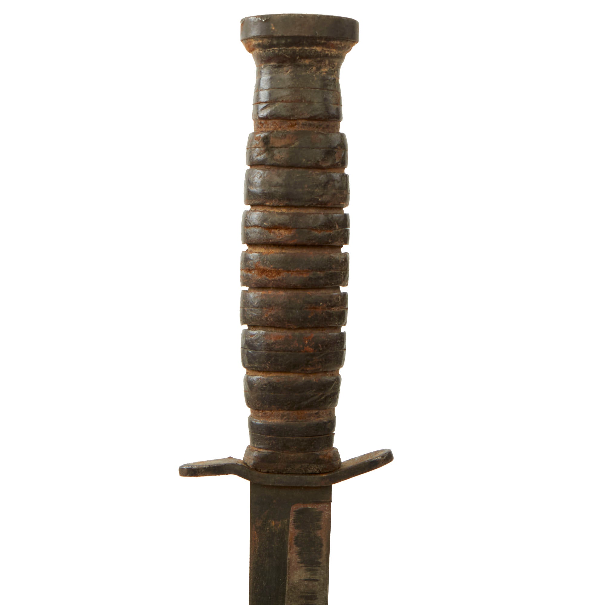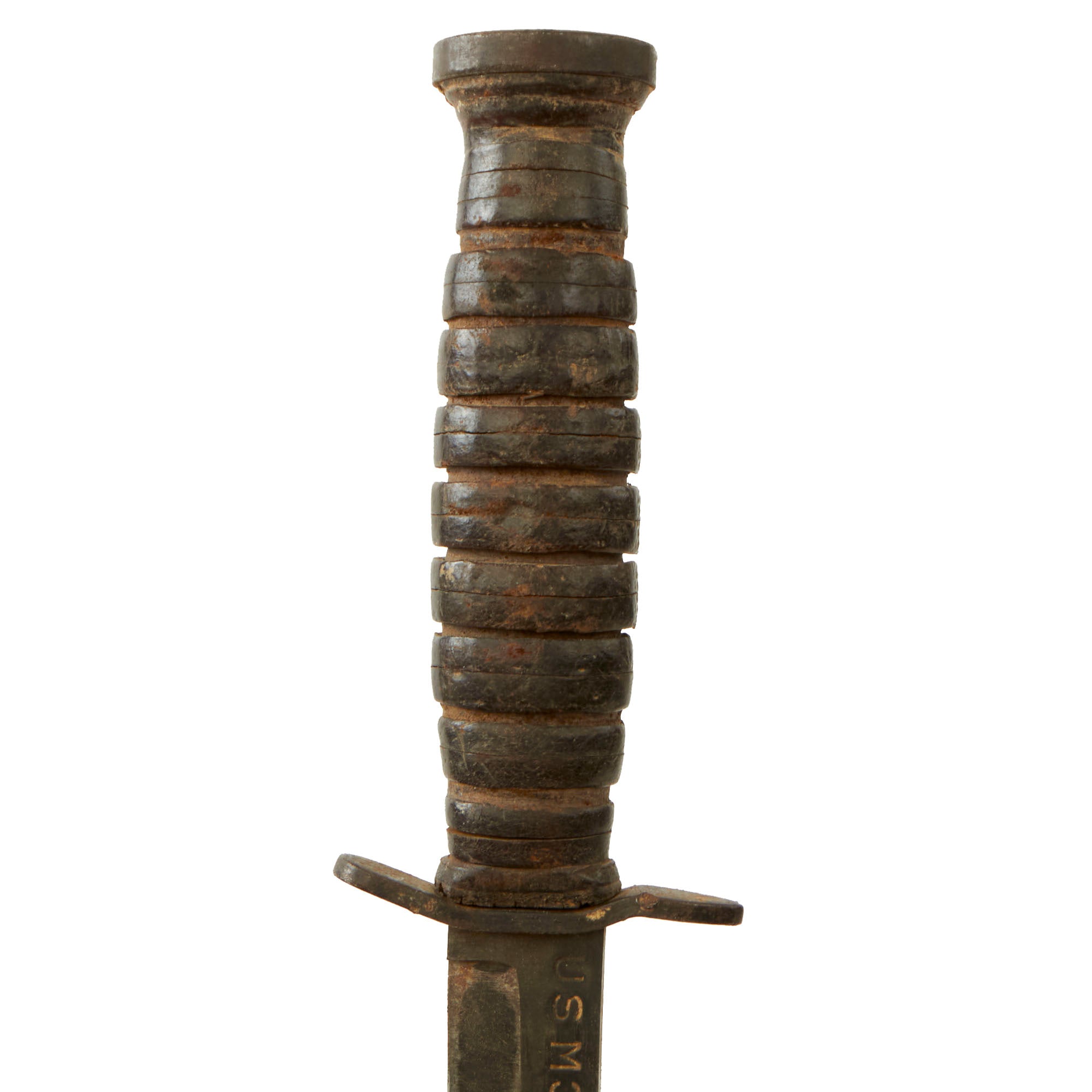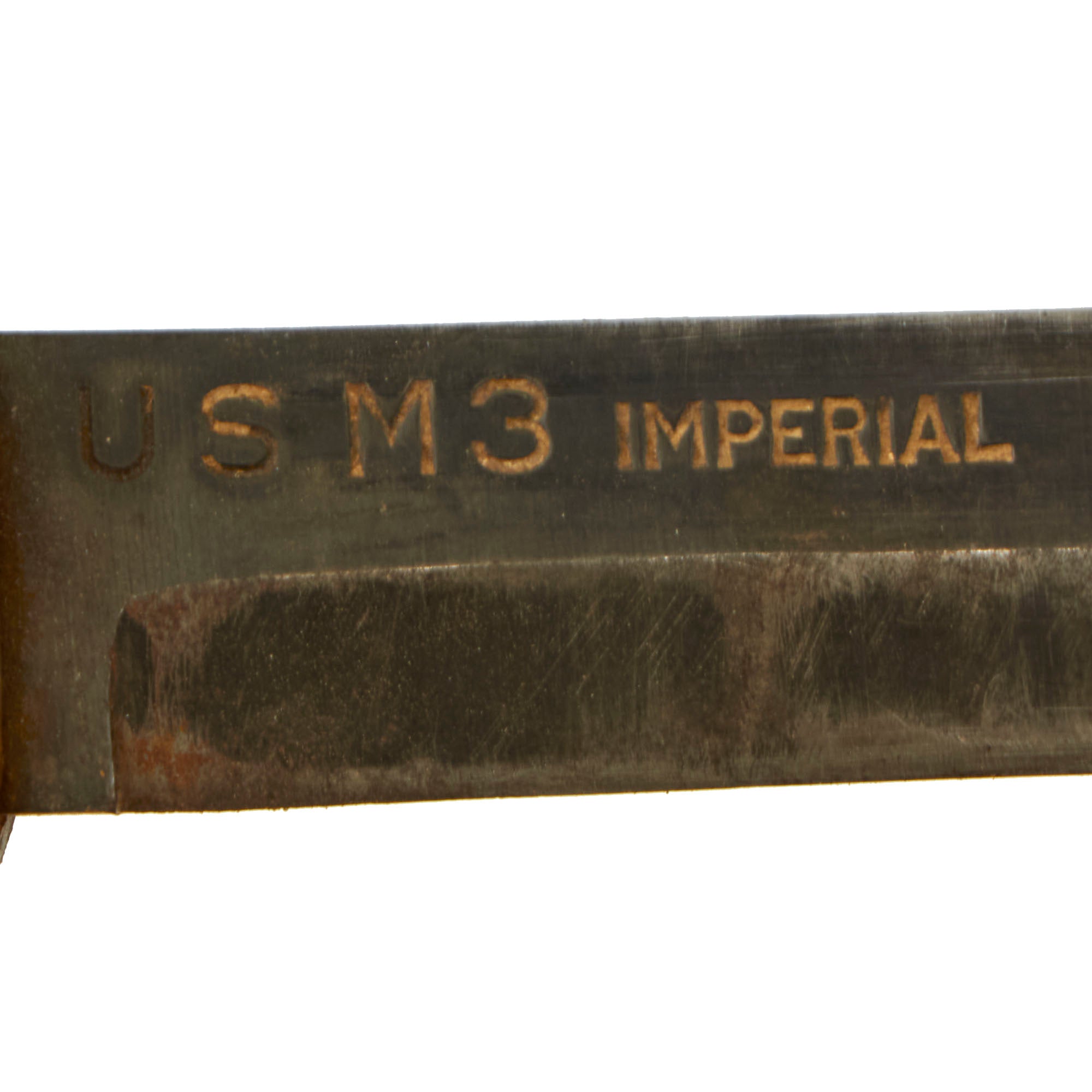 This knife is early production, indicated by the maker information being stamped directly on the blade: U S M3 IMPERIAL. This is the second version of the knife, as the first all had the date "1943" after the maker. The later version moved the markings to the cross guard. The marking is very clear.