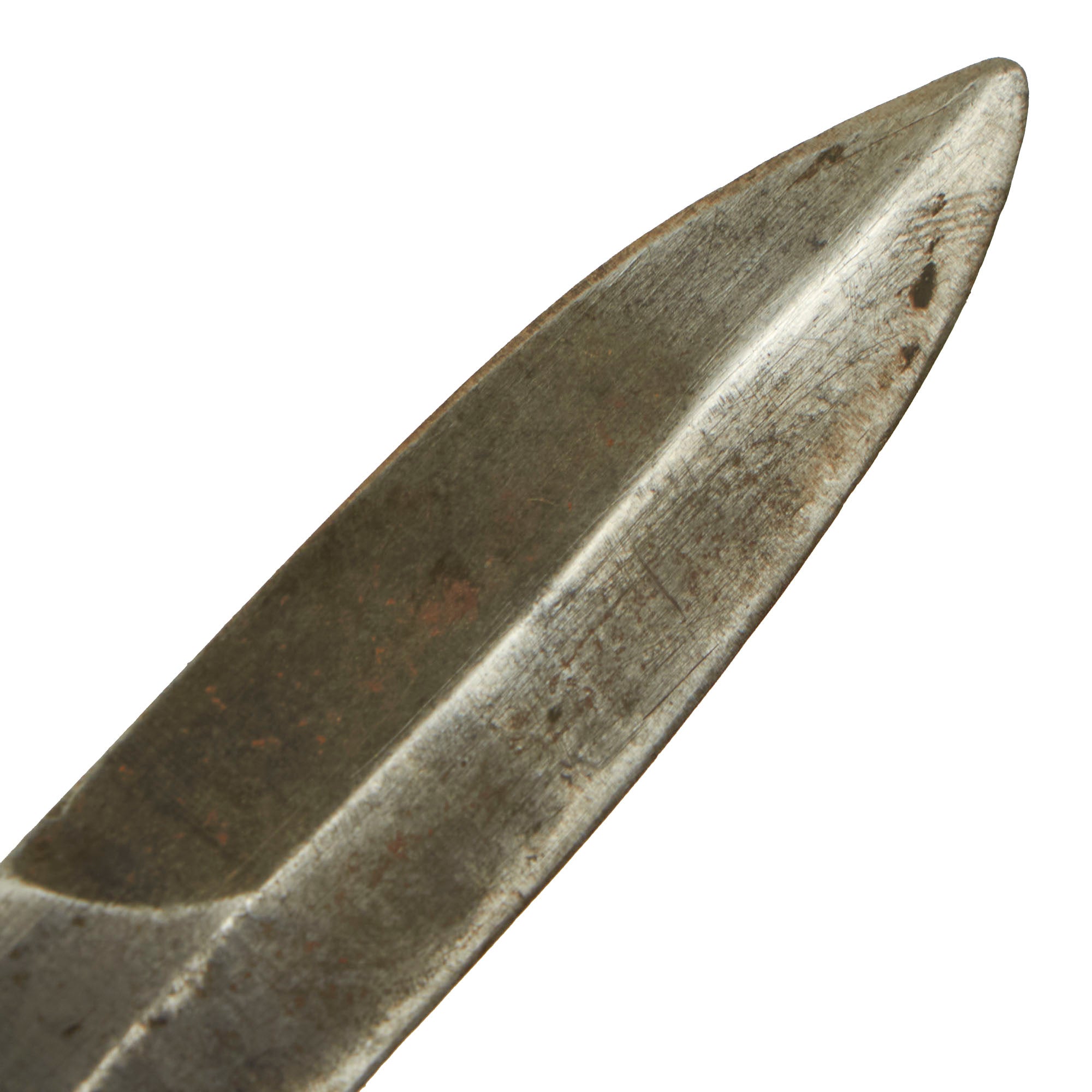 The 6 1/2 inch spear point blade is in fair service-used condition, with much of the original finish gone. There has been post production sharpening, particularly on the false edge. The crossguard is heavily dented as shown. The handle and stacked leather grip are in good shape, with a heavily worn color, but there is a good bit of cracking in the pieces. The bottom of the pommel shows the U.S. "Flaming Bomb" proof mark.