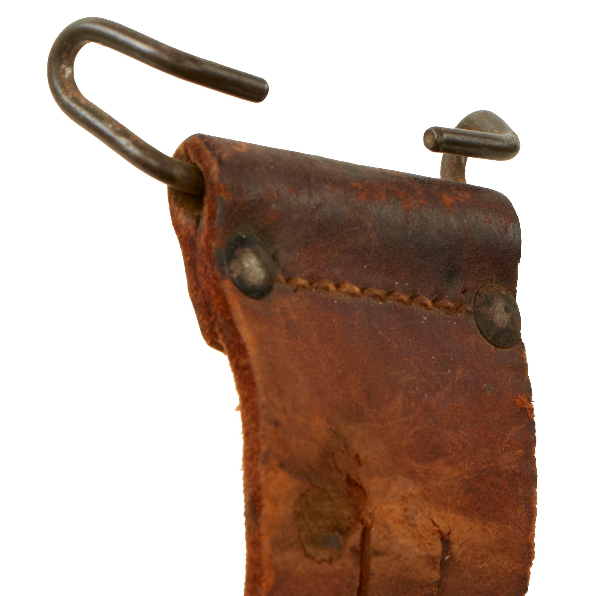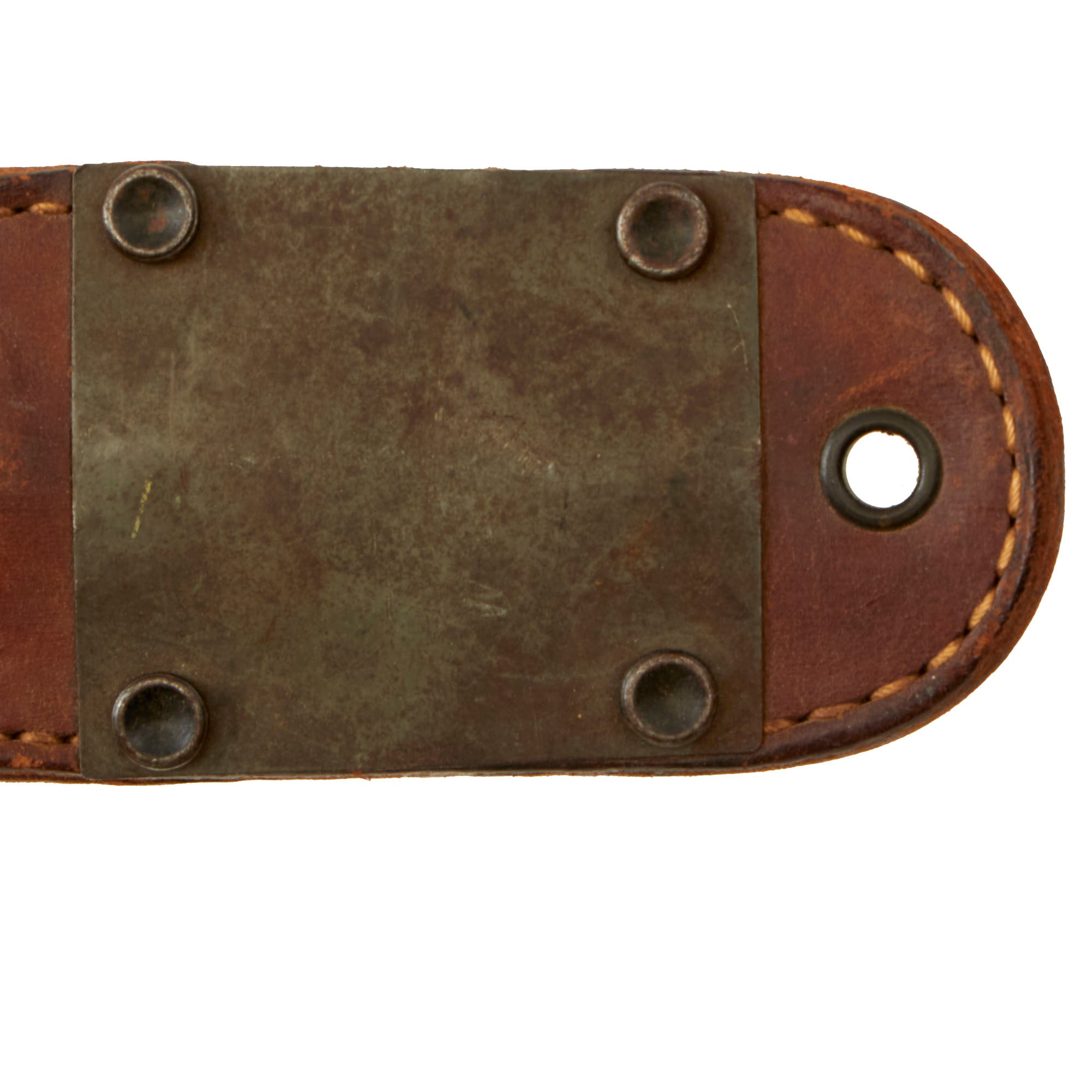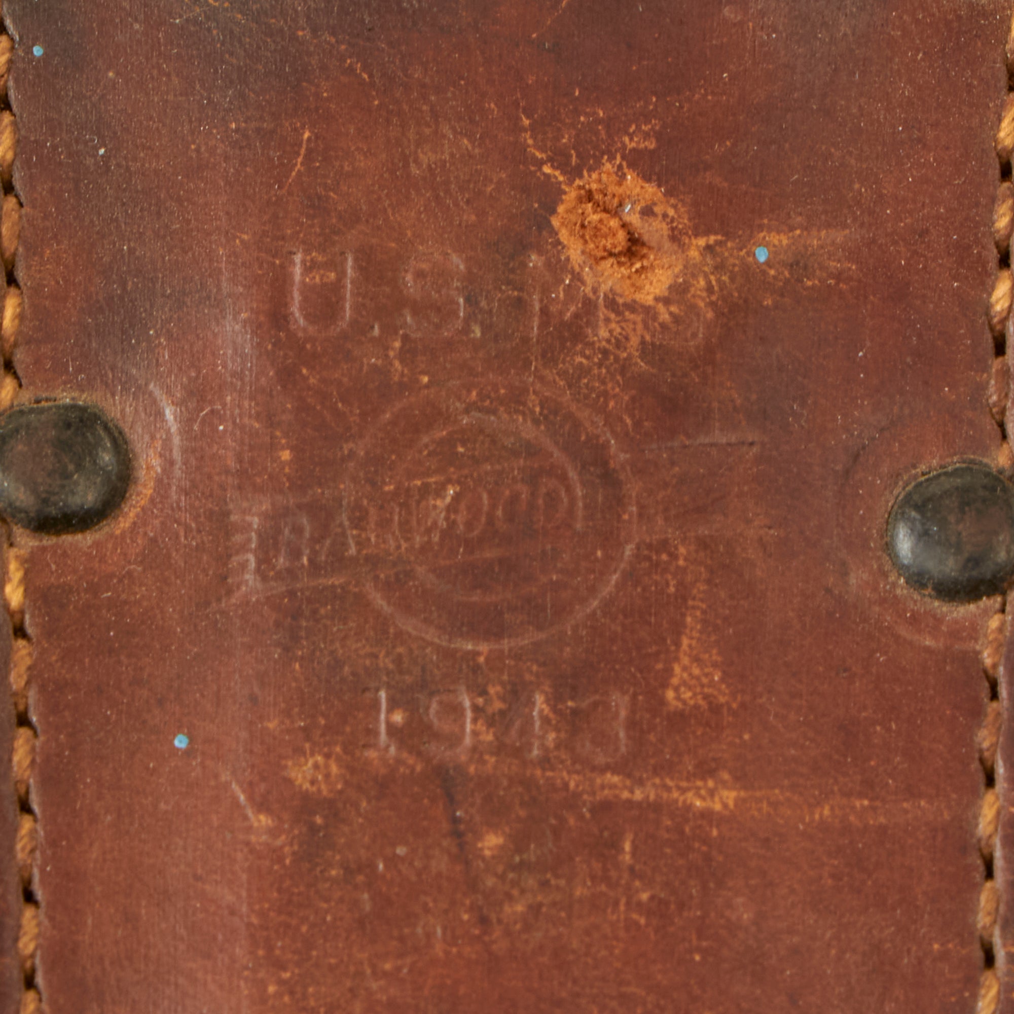 The original scabbard is marked, U.S. M6 / BARWOOD / 1943, and is in good condition, retaining its belt attachment. It has a lovely aged leather look, with a bit of cracking and dry rot in places. The securing strap is very delicate, and there is cracking near the scabbard throat. This is the original scabbard designed for this knife, which was then replaced with the Fiberglass M8/M8A1 scabbards, which were also used with the M4 bayonet. The rivets holding the metal plate on the bottom are all intact. The name Cain is written on the belt attachment.