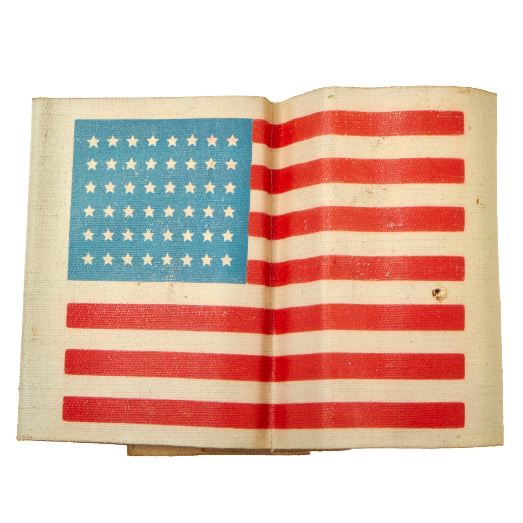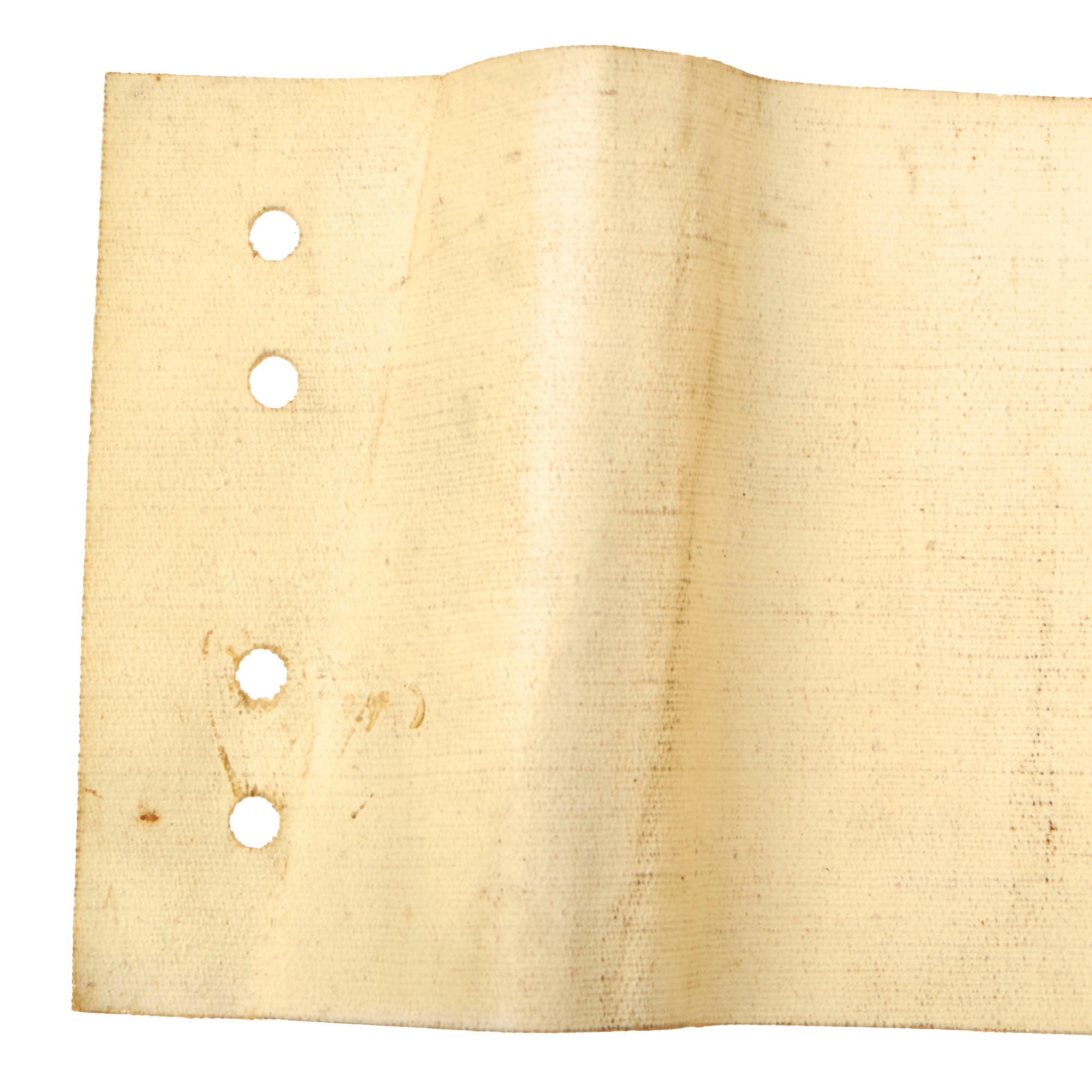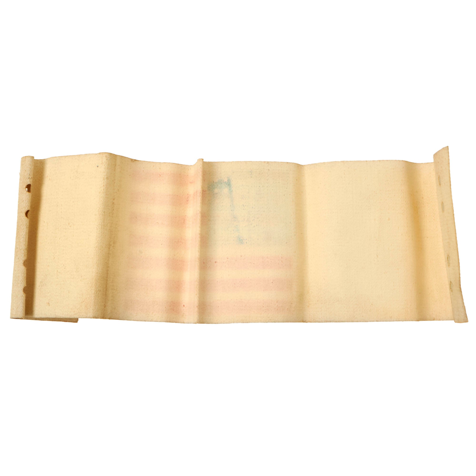 This is the third type of Arm flag, which was printed as an armband on a kind of sturdy paper stock resembling wallpaper, called oilcloth. This is a semi-waterproof material also called "lacquered cloth" and "American Cloth". It has punch holes and was issued with two safety pins, however none are present. It measures approximately 17 ½” x 4", the standard length for these items.